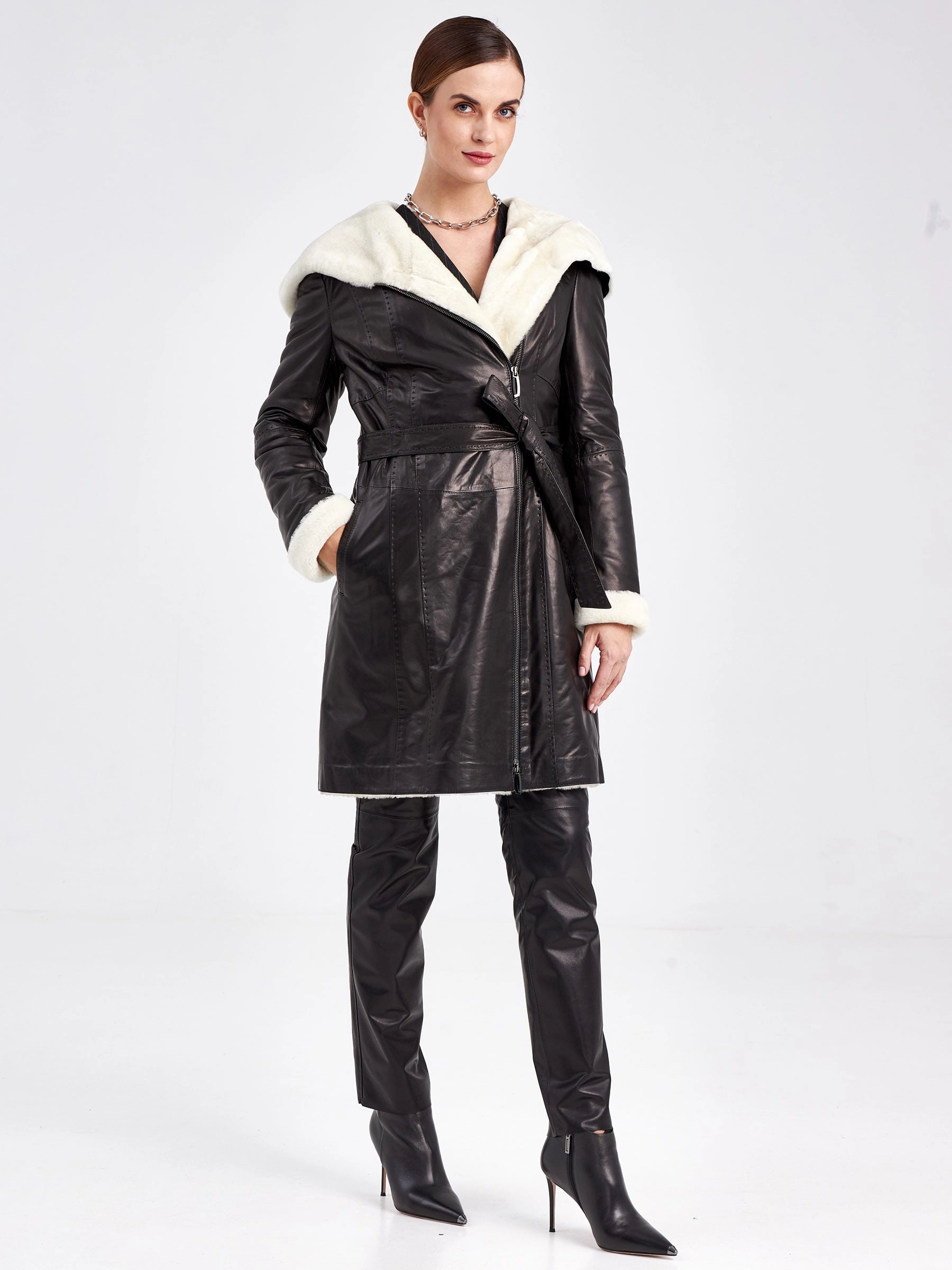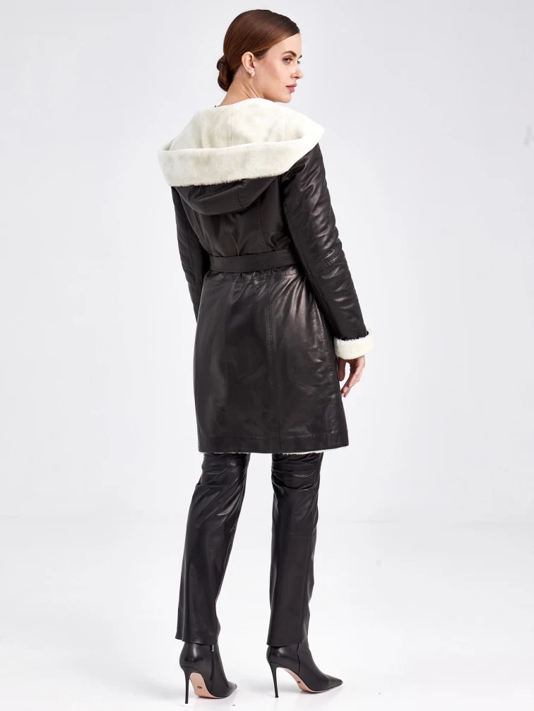 Кожаное пальто зимнее женское 394мех, с капюшоном, черно-белое, размер 46, артикул 91880