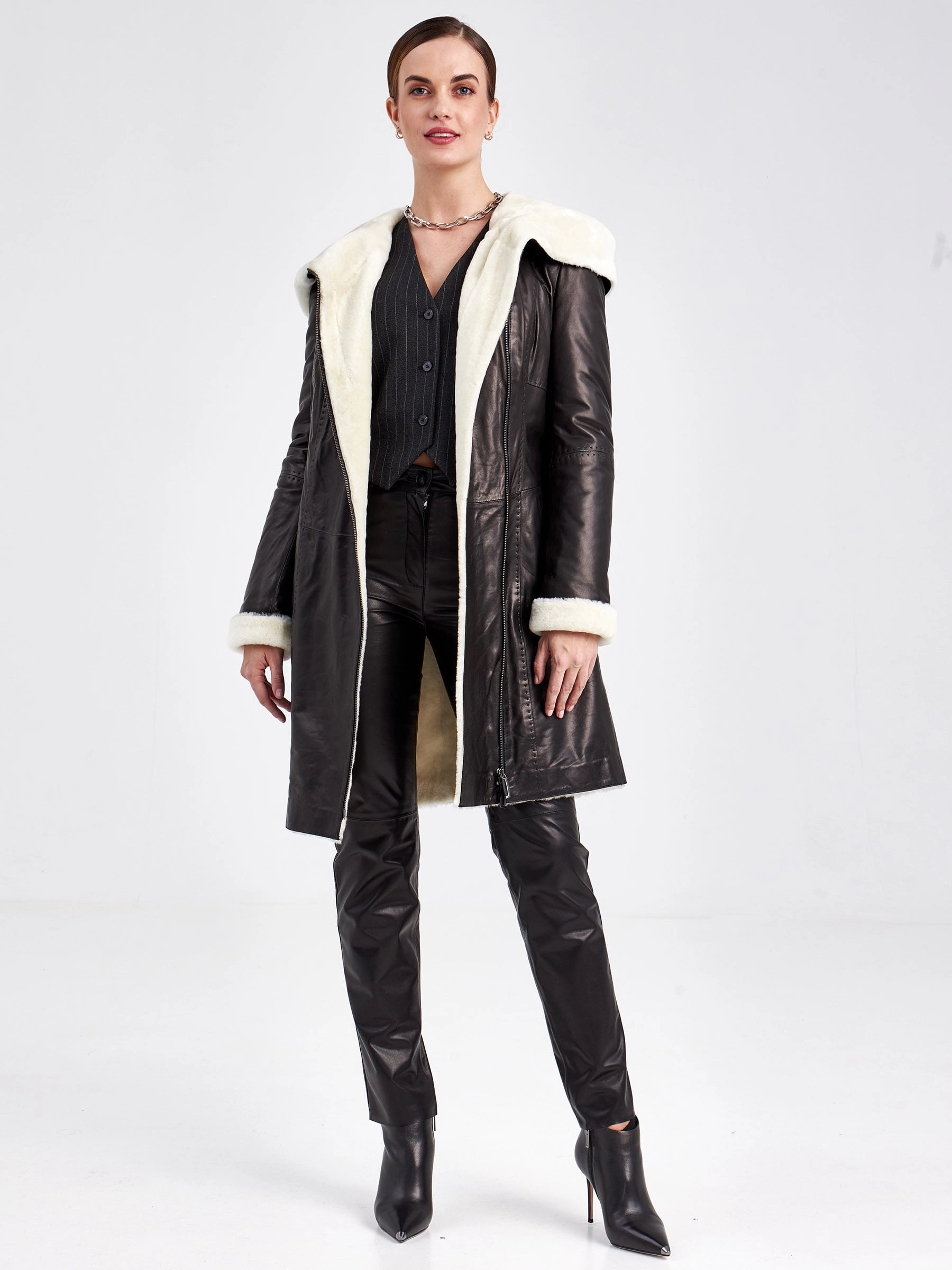 Отличным спутником в холодную погоду, станет кожаное пальто на овчине. Полуприлегающий силуэт, комфортная посадка по фигуре. Два врезных кармана, как и сама модель, застегиваются на молнию. Декором к модели послужил ручной стежок.За комфорт в капризную погоду отвечает объемный капюшон.