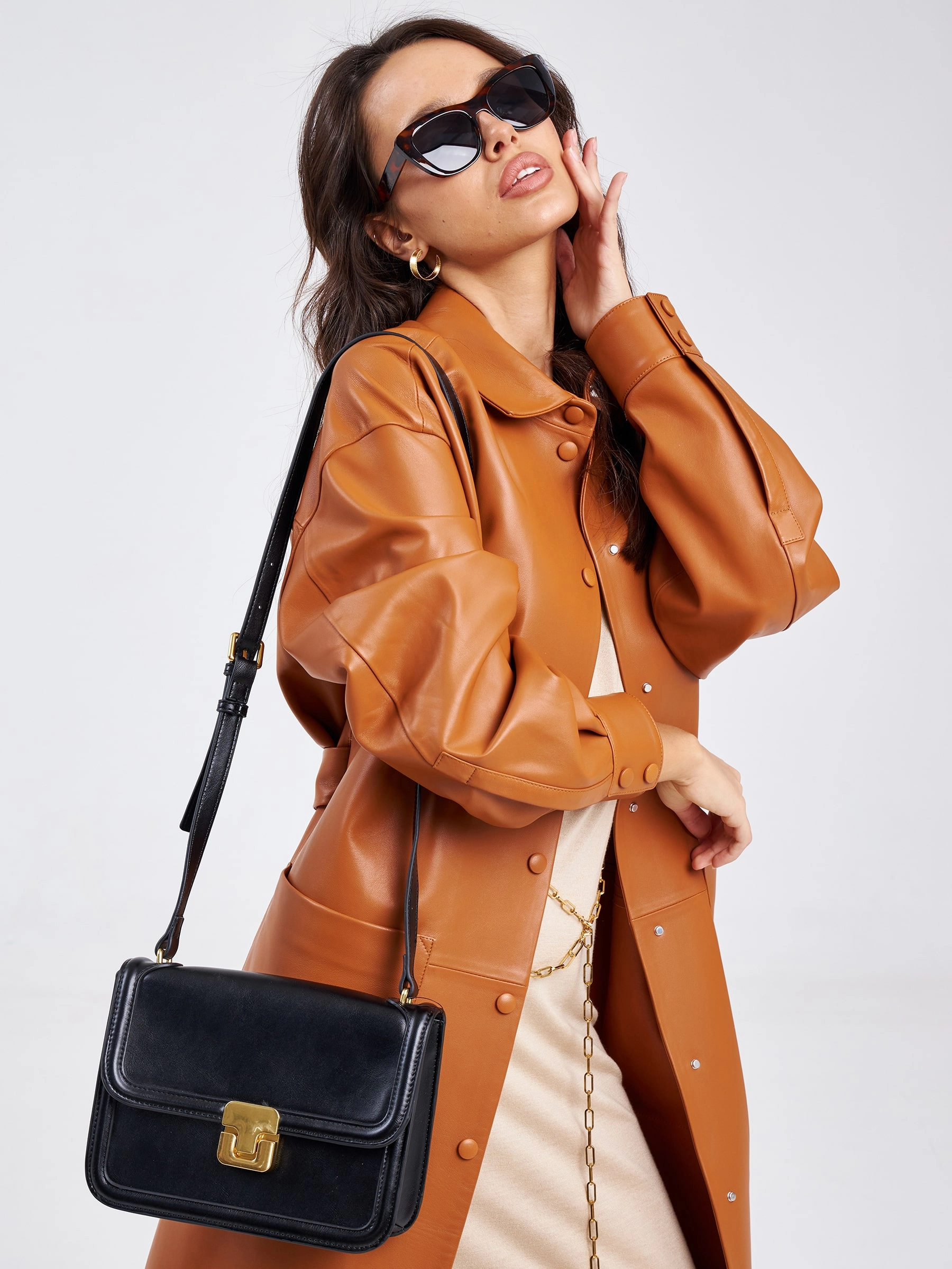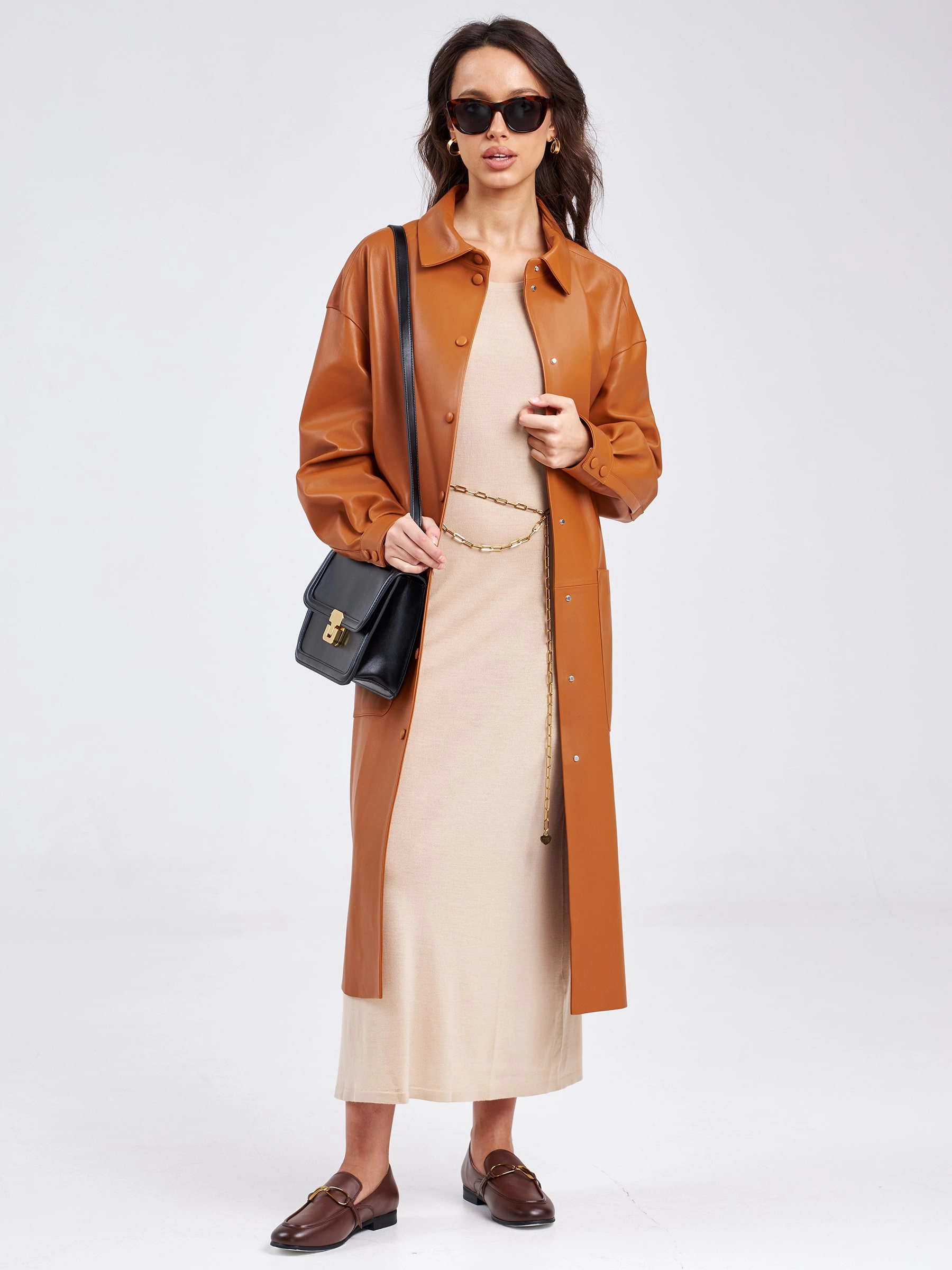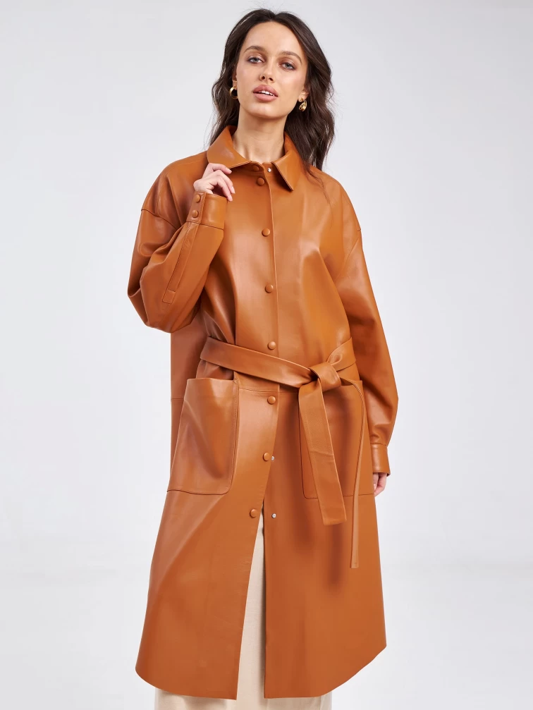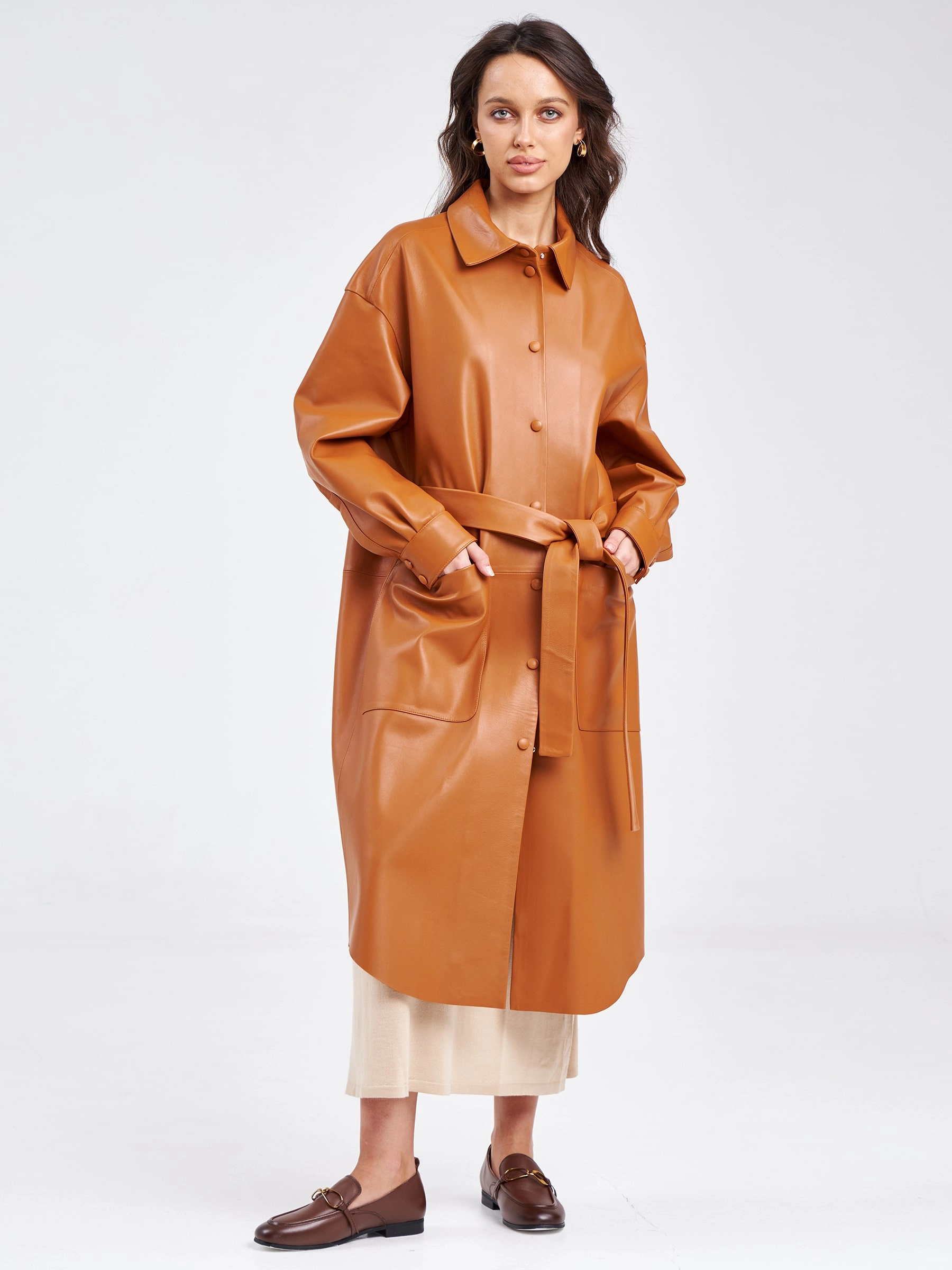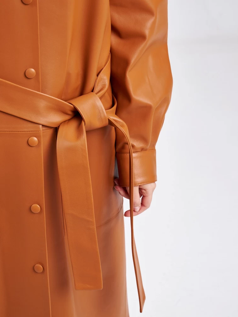 Повседневный весенний образ. Платье - рубашка прямого кроя с отложным воротником, двумя накладными карманами и поясом - лентой. Изделие выполнено из гладкой натуральной кожи премиум класса.