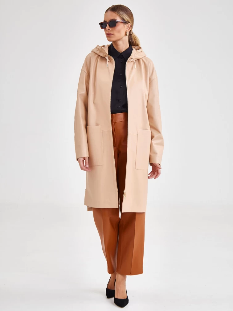 Товар кожаное женское пальто с капюшоном на молнии премиум класса 3034, бежевое, размер 48, артикул 63420 выполнен из натуральной кожи с застежкой молния. Рассчитан на сезон: весна-лето. Длина изделия 100 см, силуэт прямой.