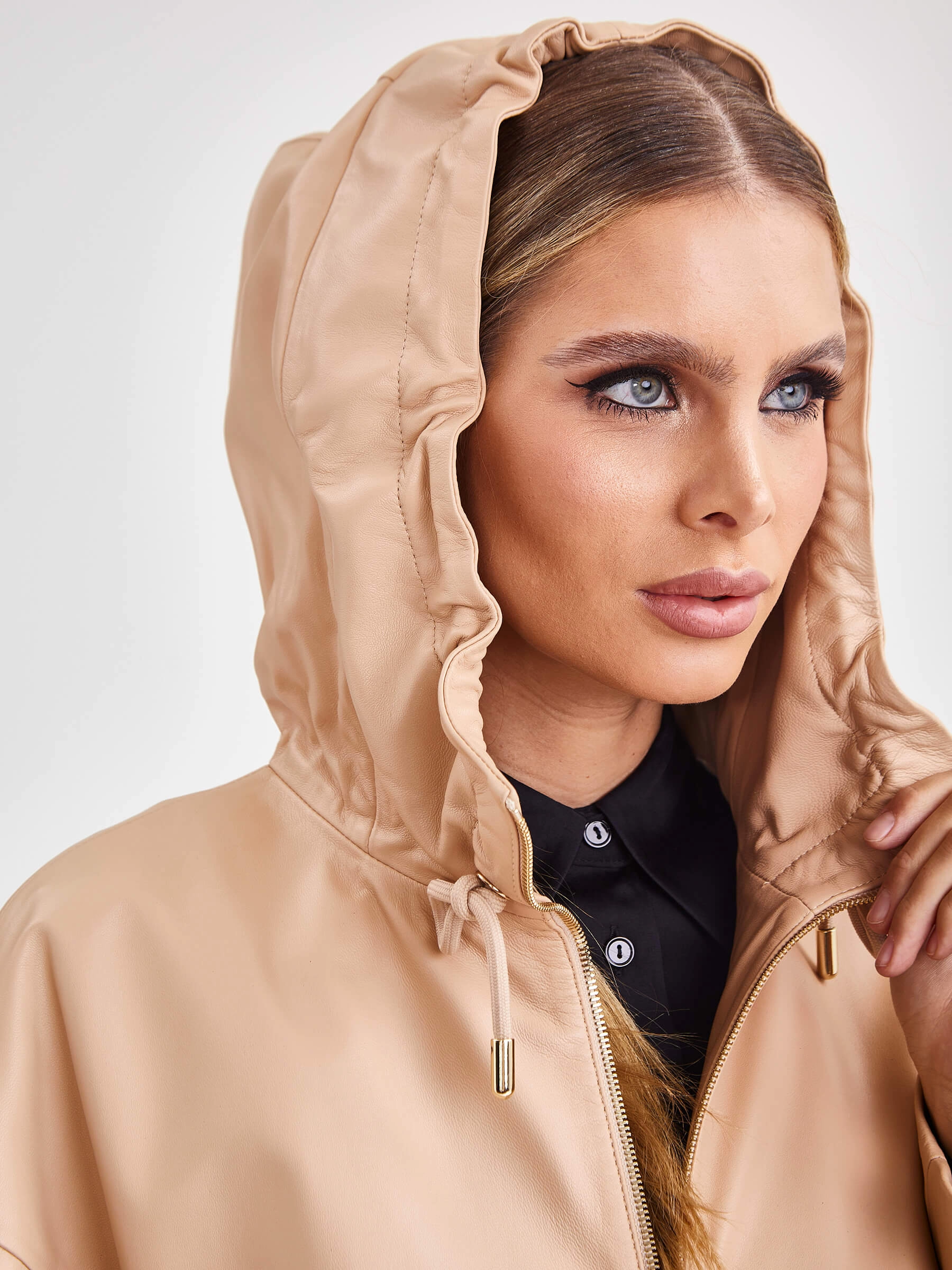 Кожаное женское пальто с капюшоном на молнии премиум класса 3034, бежевое, размер 48, артикул 63420
