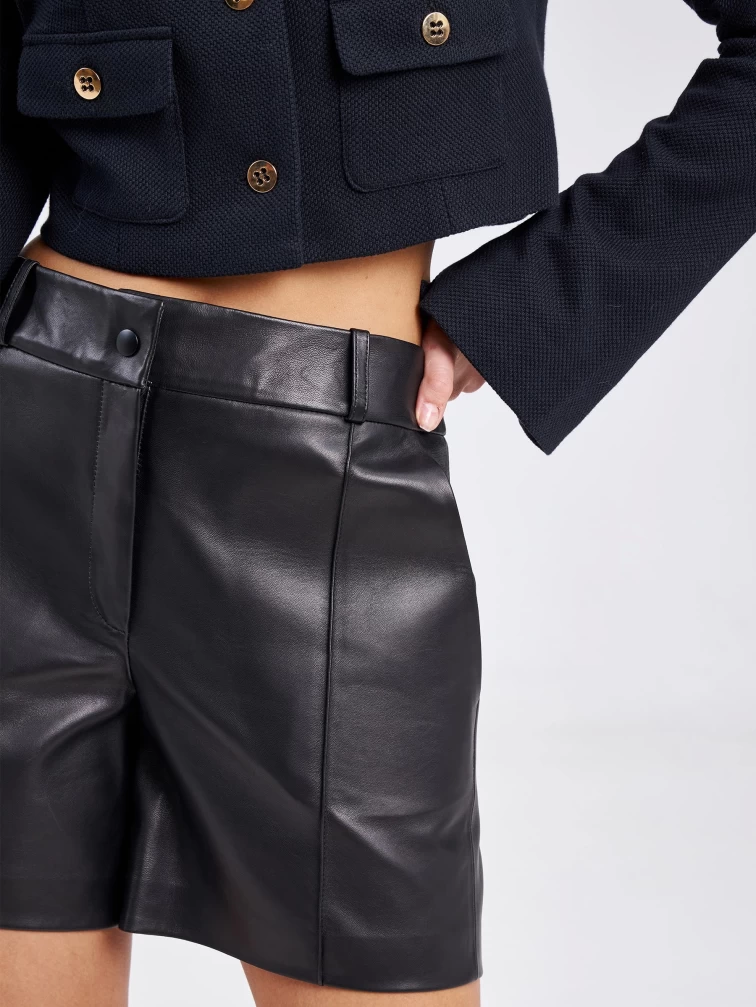 Элегантные кожаные шорты классического кроя из натуральной кожи премиум-класса с идеально ровной однотонной поверхностью станут универсальной базой для создания стильных образов. Модель с классической посадкой по талии дополнена аккуратными стрелками и удобными врезными карманами по бокам, а чистые линии без лишнего декора подчеркивают ручную работу мастеров. Эти шорты великолепно сочетаются с объемной рубашкой и лоферами в стиле smart casual, с кожаной курткой-косухой и челси для создания дерзкого городского образа или с облегающим топом и босоножками для вечернего выхода. Идеальная посадка благодаря продуманному крою, долговечность и износостойкость материала, а также универсальность для разных стилевых направлений делают эту модель идеальным выбором для ценителей качественной кожи и лаконичного дизайна.
