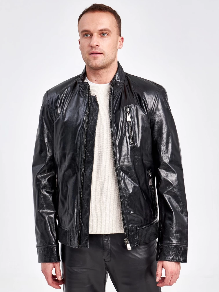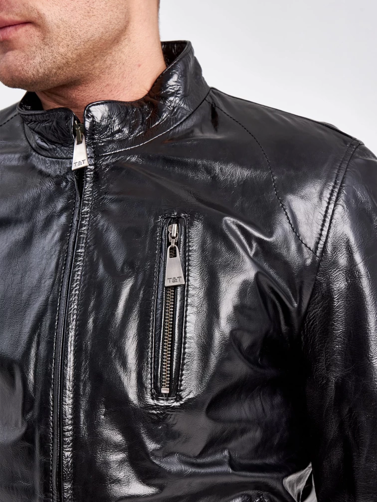 Модная мужская куртка премиального качества из итальянской натуральной кожи с эффектом чёрного лоска