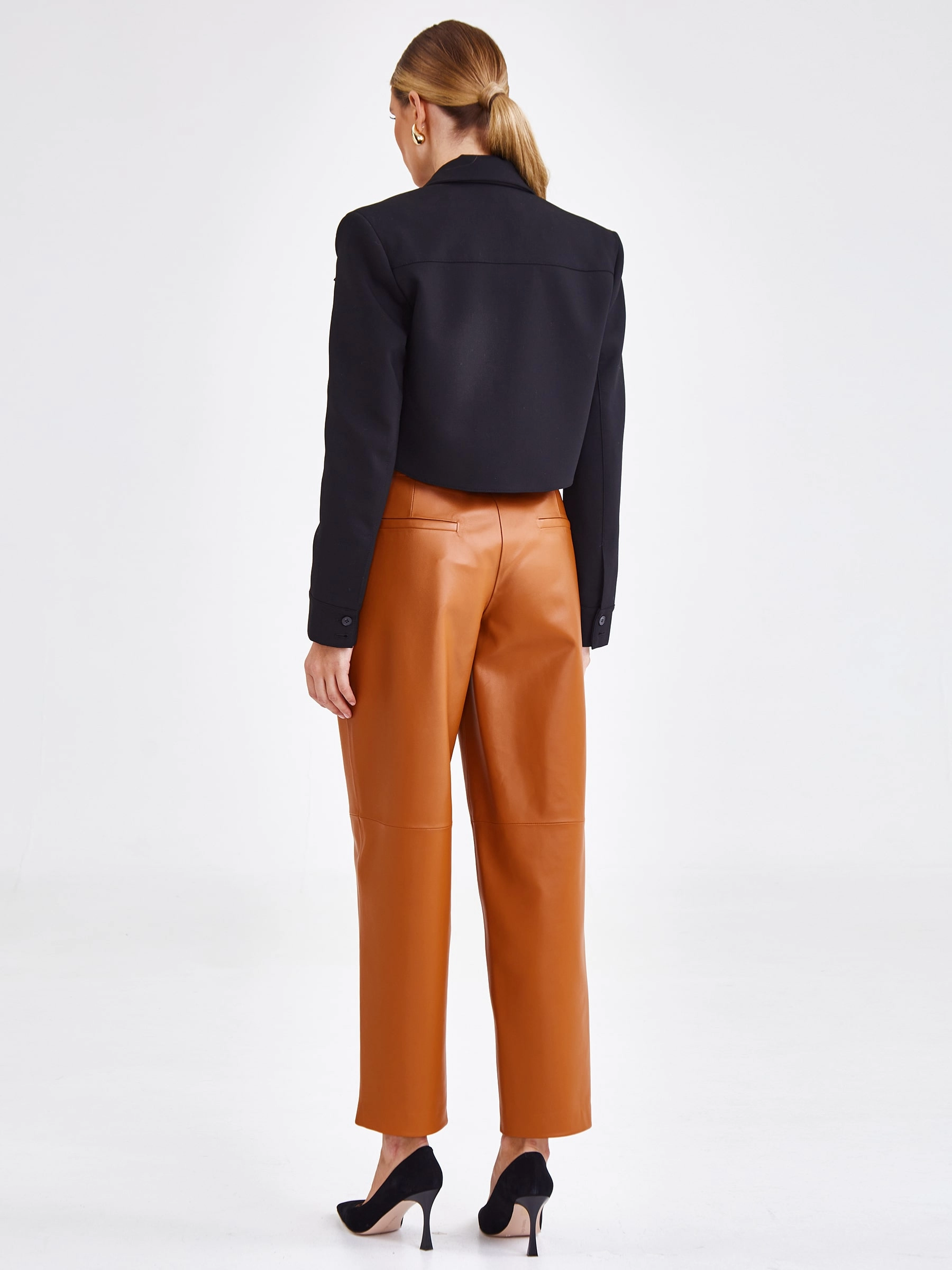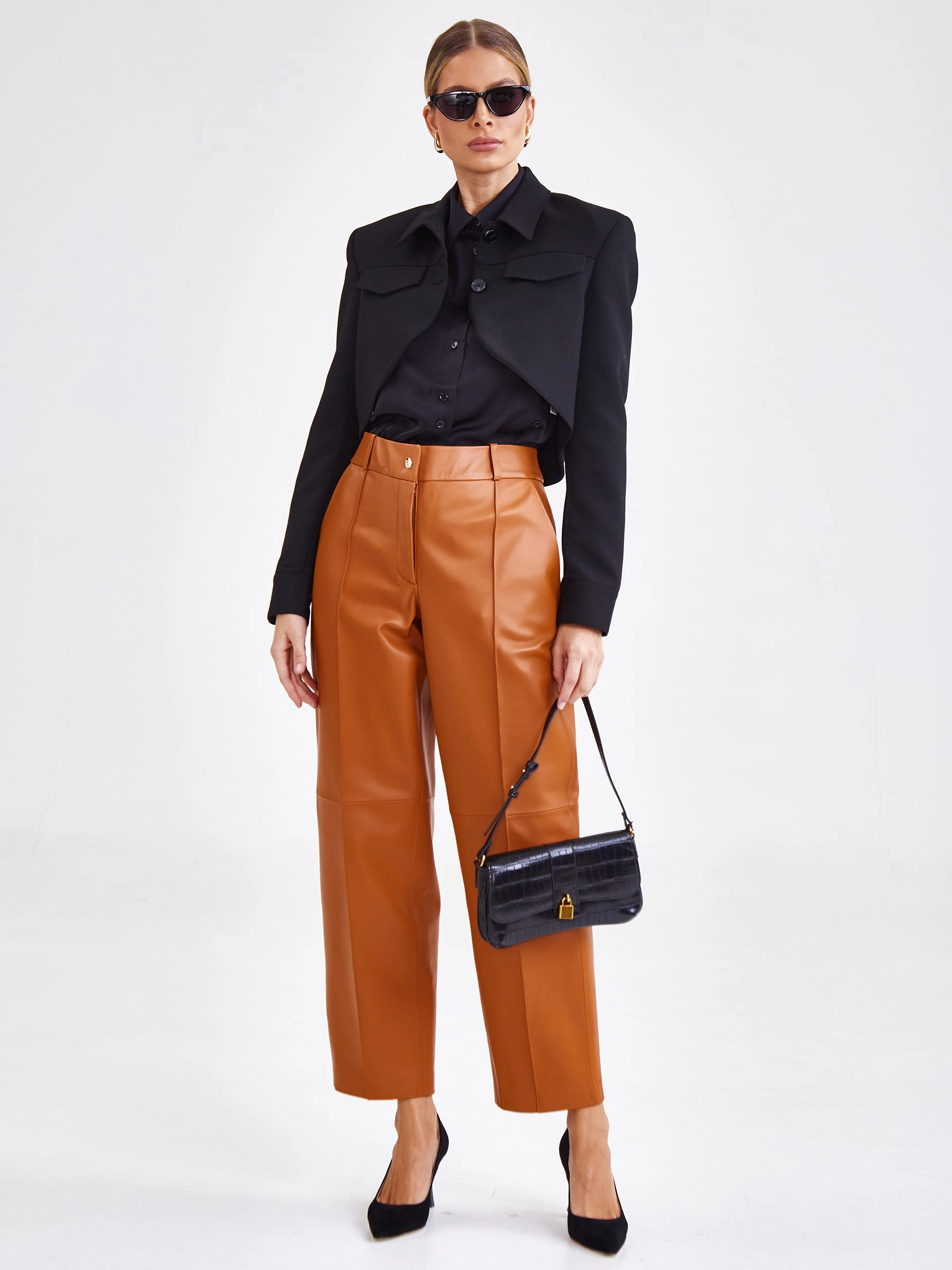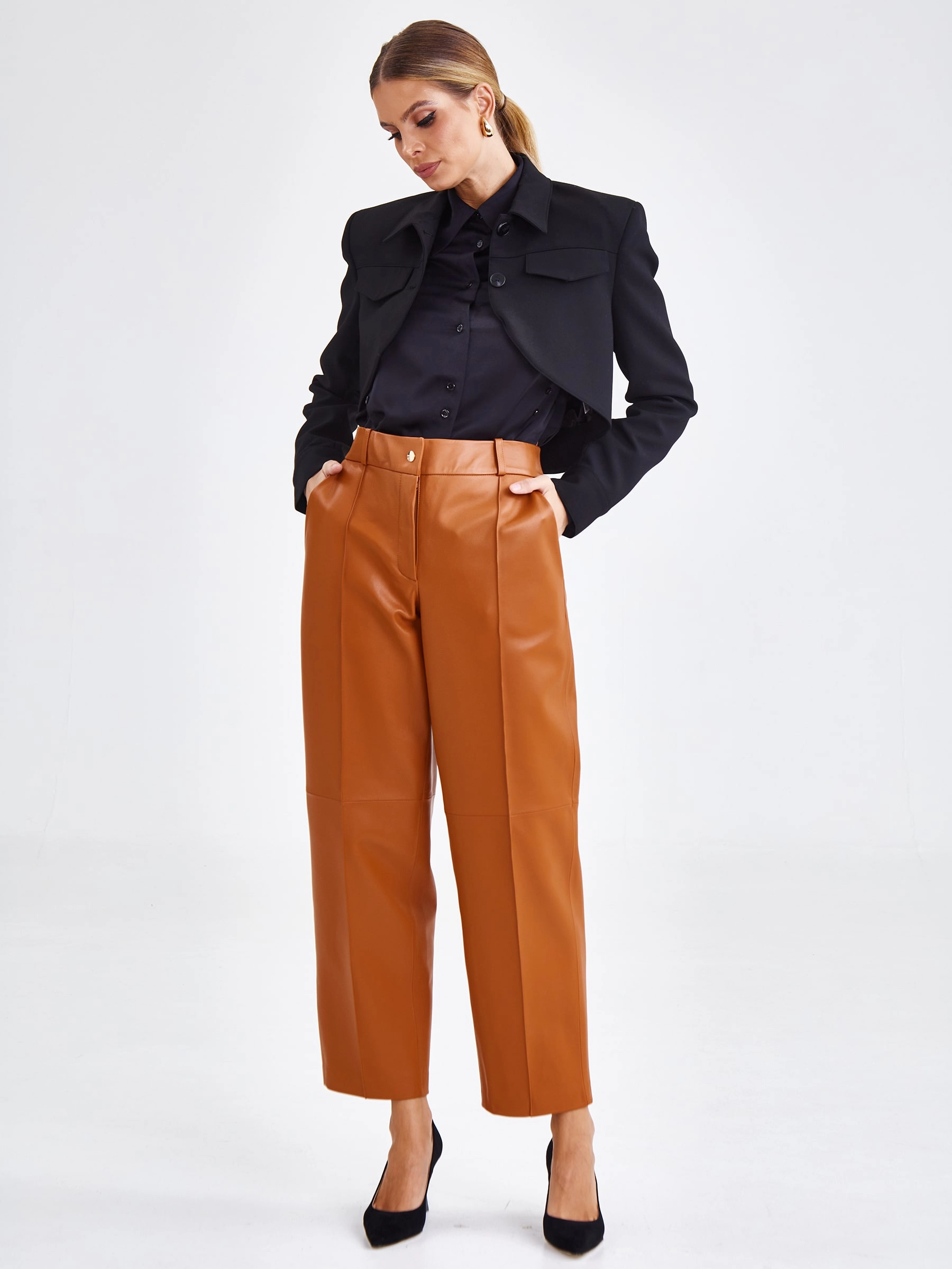 Модные женские кожаные брюки из натуральной кожи премиум-класса. Обновите свой гардероб с элегантными брюками, которые сочетают в себе стиль, комфорт и качество. Модель выполнена из натуральной кожи высокого качества — это гарантирует не только роскошный внешний вид, но и долговечность изделия. Лаконичный дизайн без лишней отделки и подкладки подчёркивает утончённость и современность модели. Брюки отличаются прямым кроем, который изящно подчёркивает фигуру, не сковывая движений. Средняя посадка обеспечивает идеальную посадку по талии и создаёт сбалансированный силуэт. Практичная застёжка-молния добавляет удобства в носке, а удобные боковые карманы делают модель ещё более функциональной. Выразительные стрелки придают брюкам строгий, но модный вид, позволяя создавать как повседневные, так и более формальные образы. Универсальная длина — 95 см — легко сочетается с разной обувью и верхом. Идеально подойдут для сезона весна–лето. Сочетайте эти брюки с лаконичными топами, строгими блузами или объёмными свитерами —