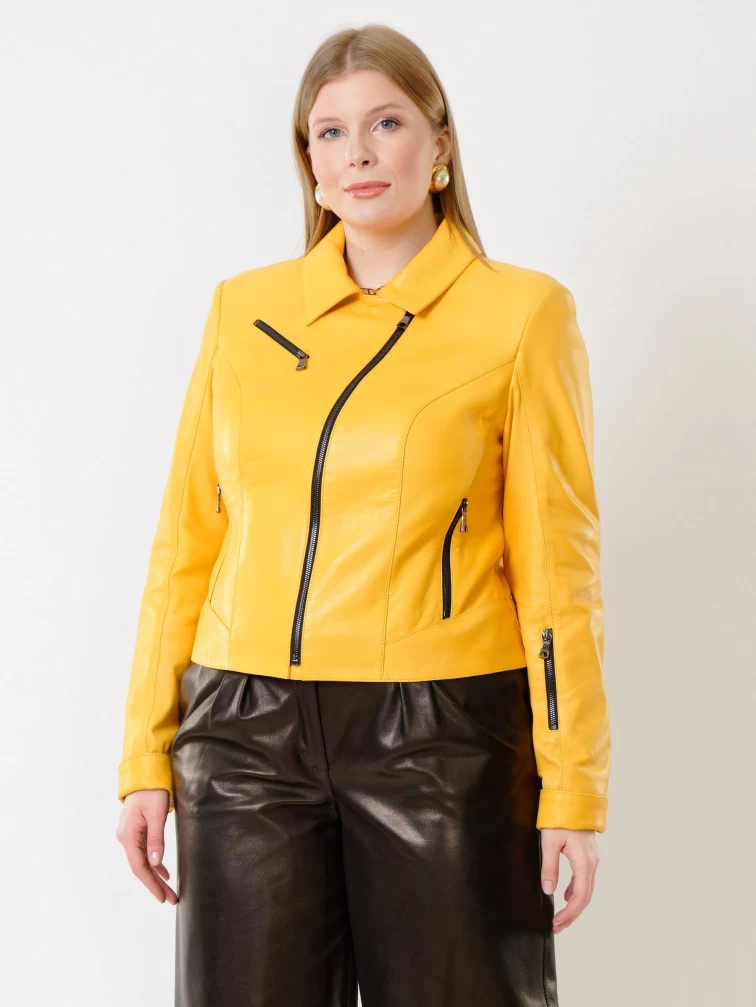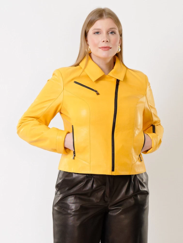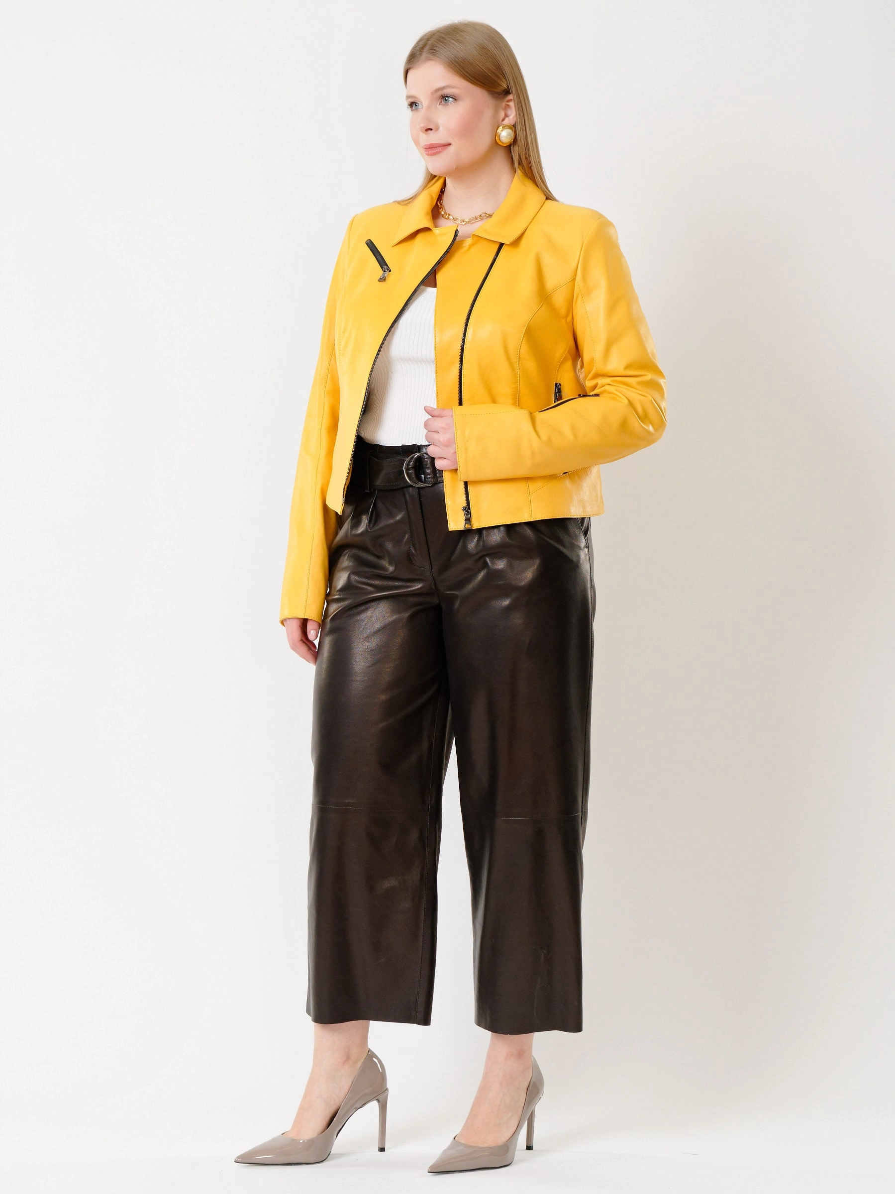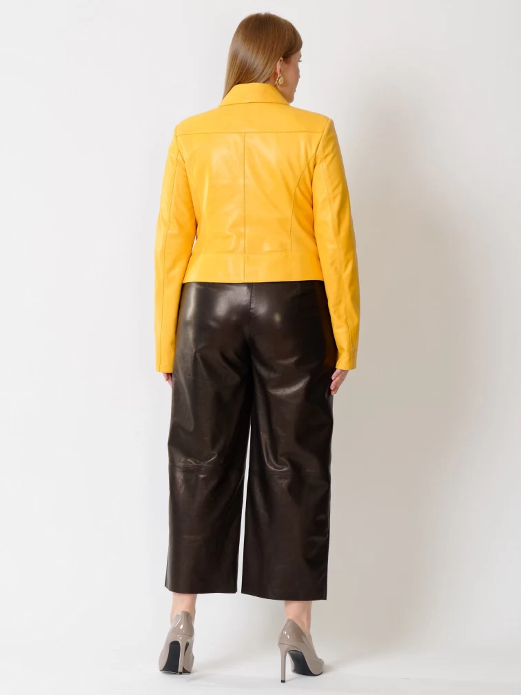 Еще один шикарный образ и красивое сочетание. Широкие кожаные брюки черного цвета хорошо гармонируют с курткой-косухой в желтом цвете из натуральной органической кожи. Совсем не официальный стиль. Просто дорого и стильно. Высшее качество кожи. Великолепная посадка.