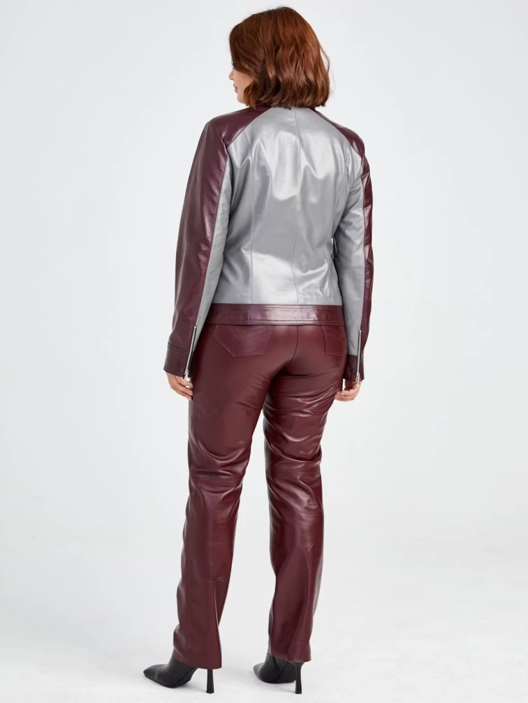 Кожаный комплект женский: Куртка 341 + Брюки 02, серый/бордовый, р. 42, арт. 111170