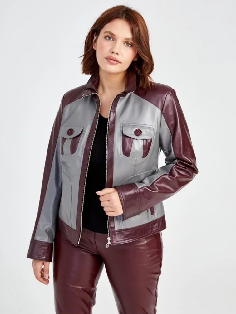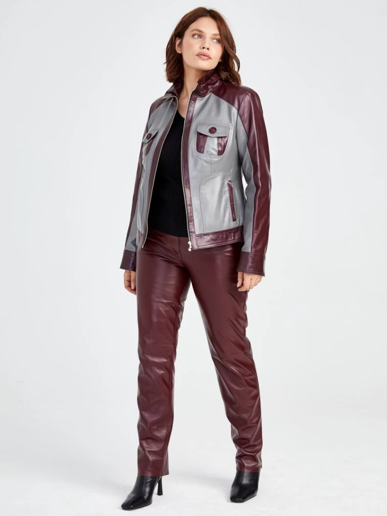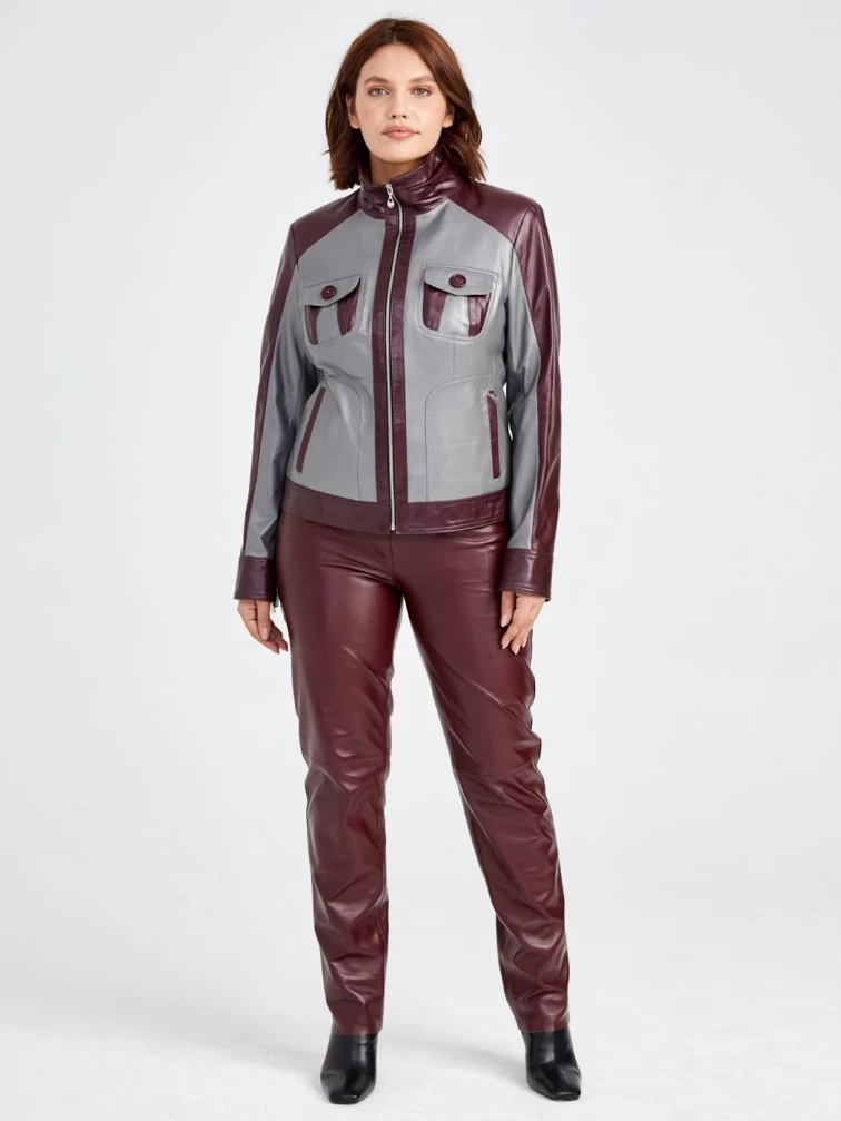 Товар кожаный комплект женский: куртка 341 + брюки 02, серый/бордовый, р. 42, арт. 111170. Рассчитан на сезон: весна-лето.