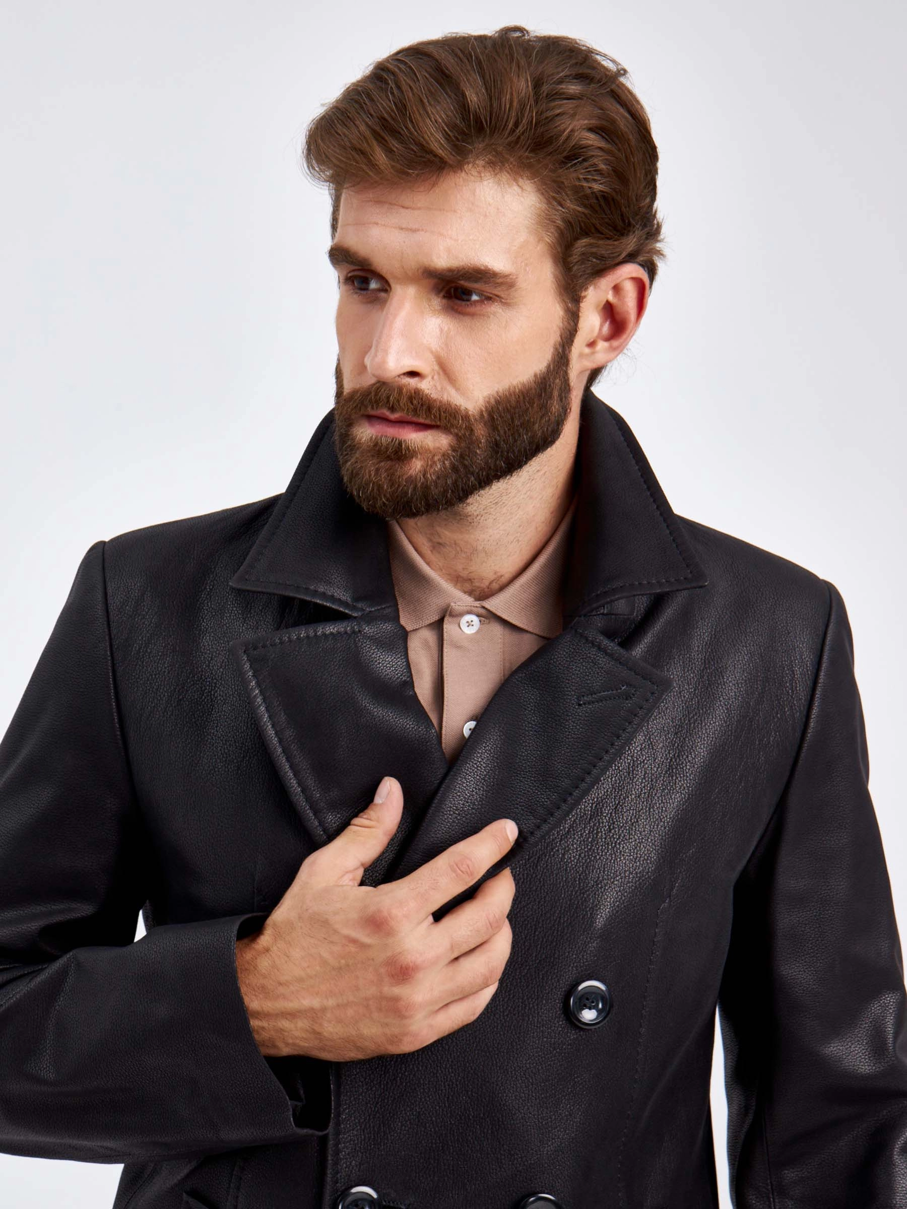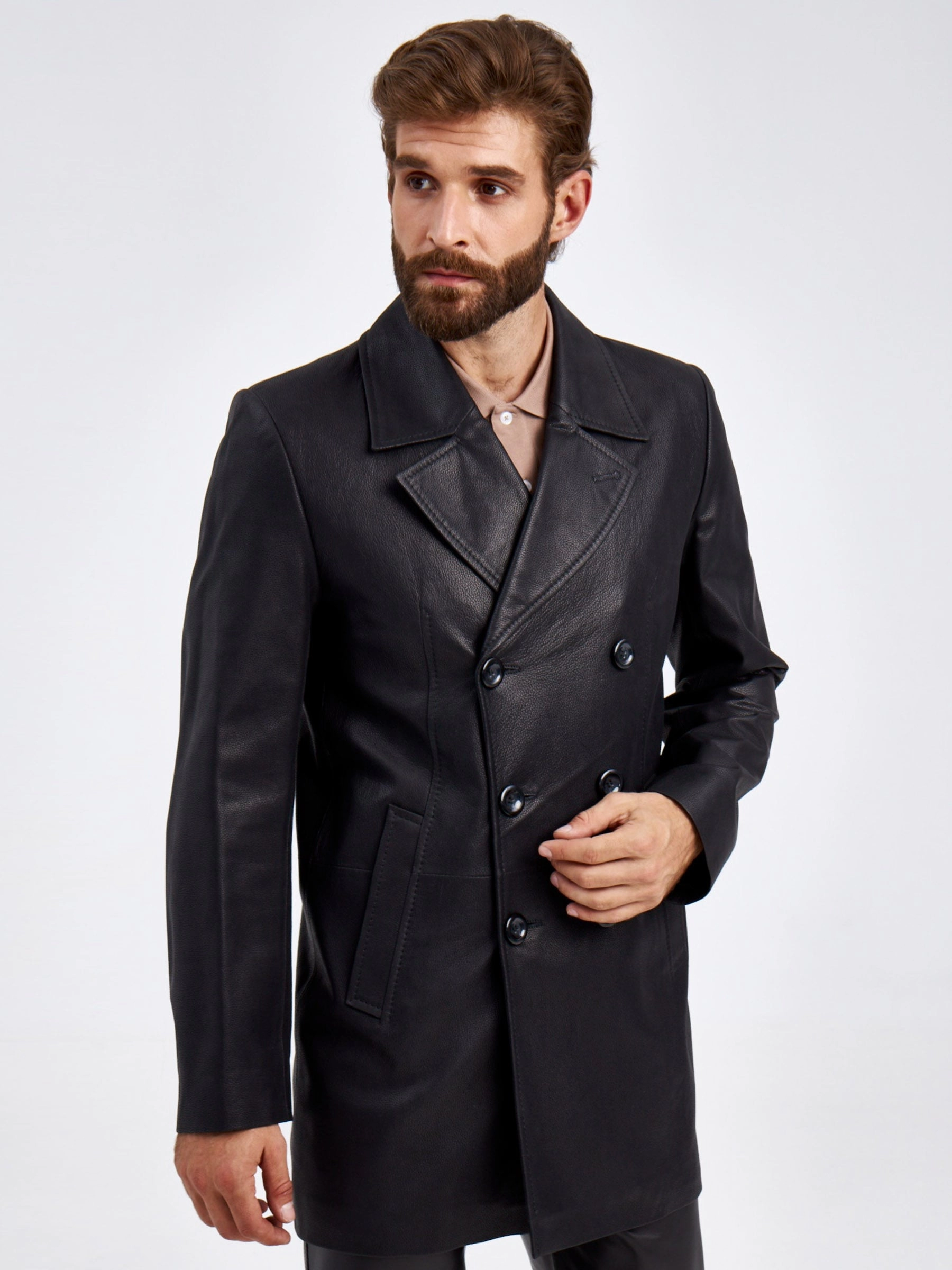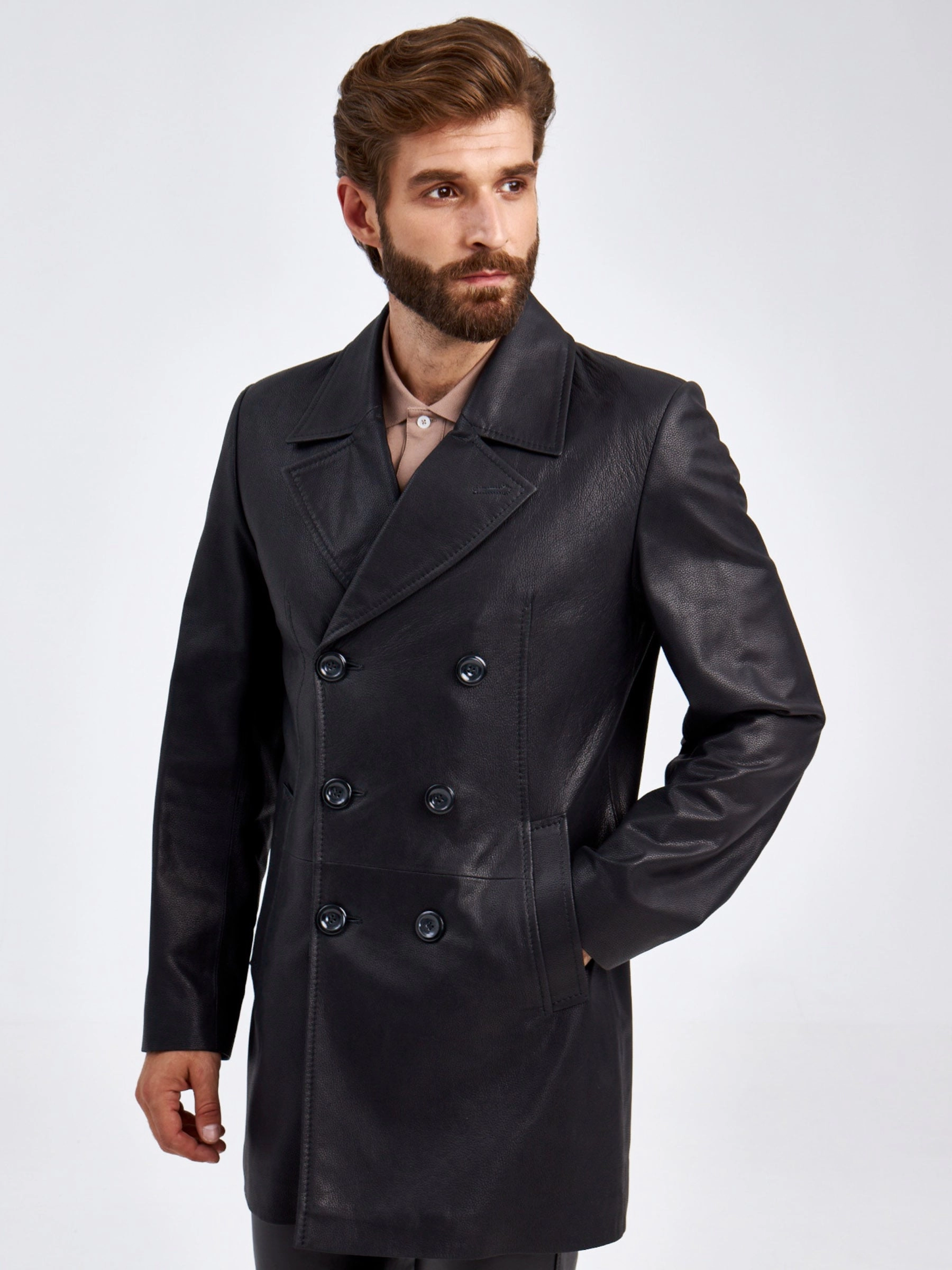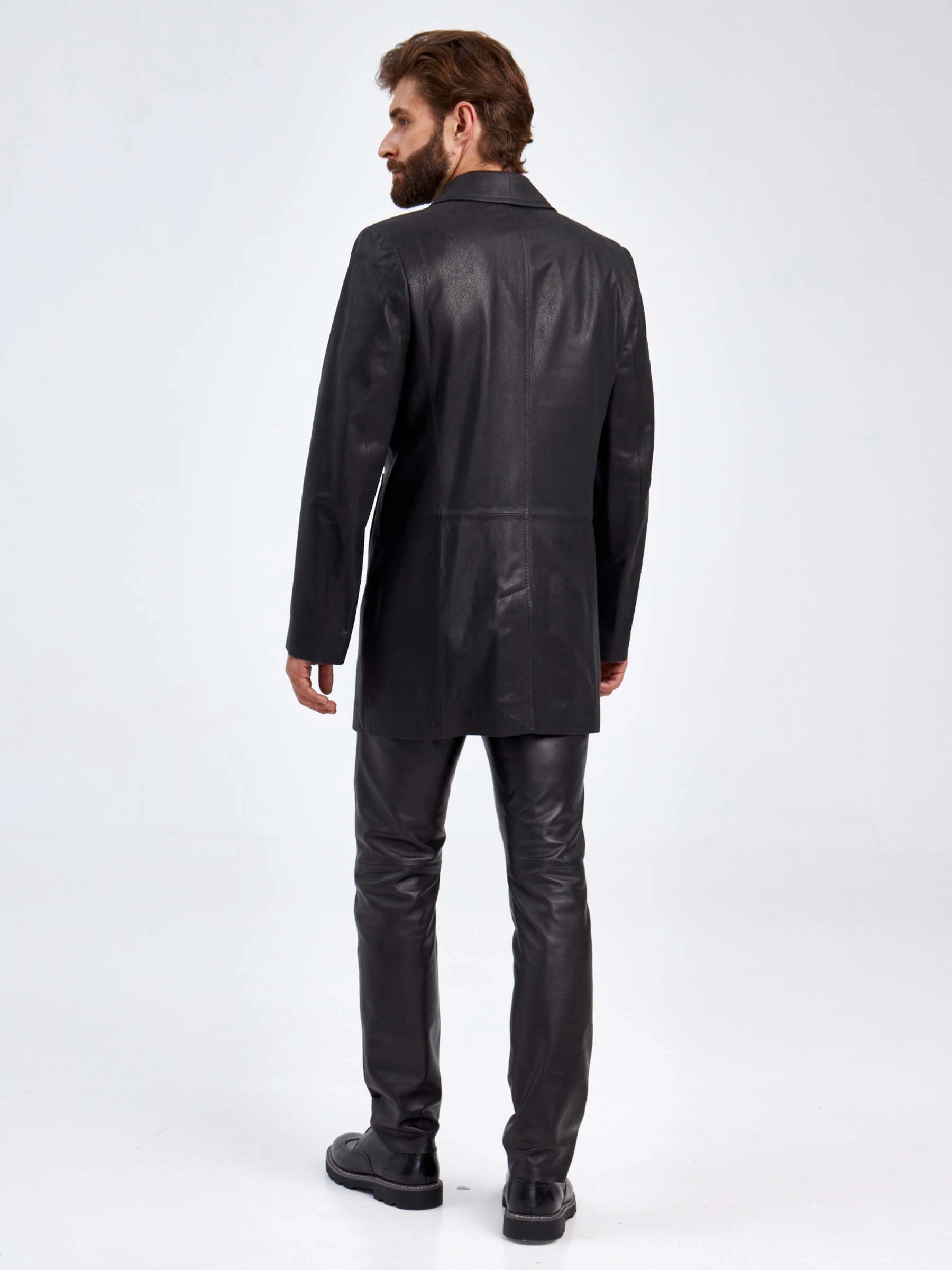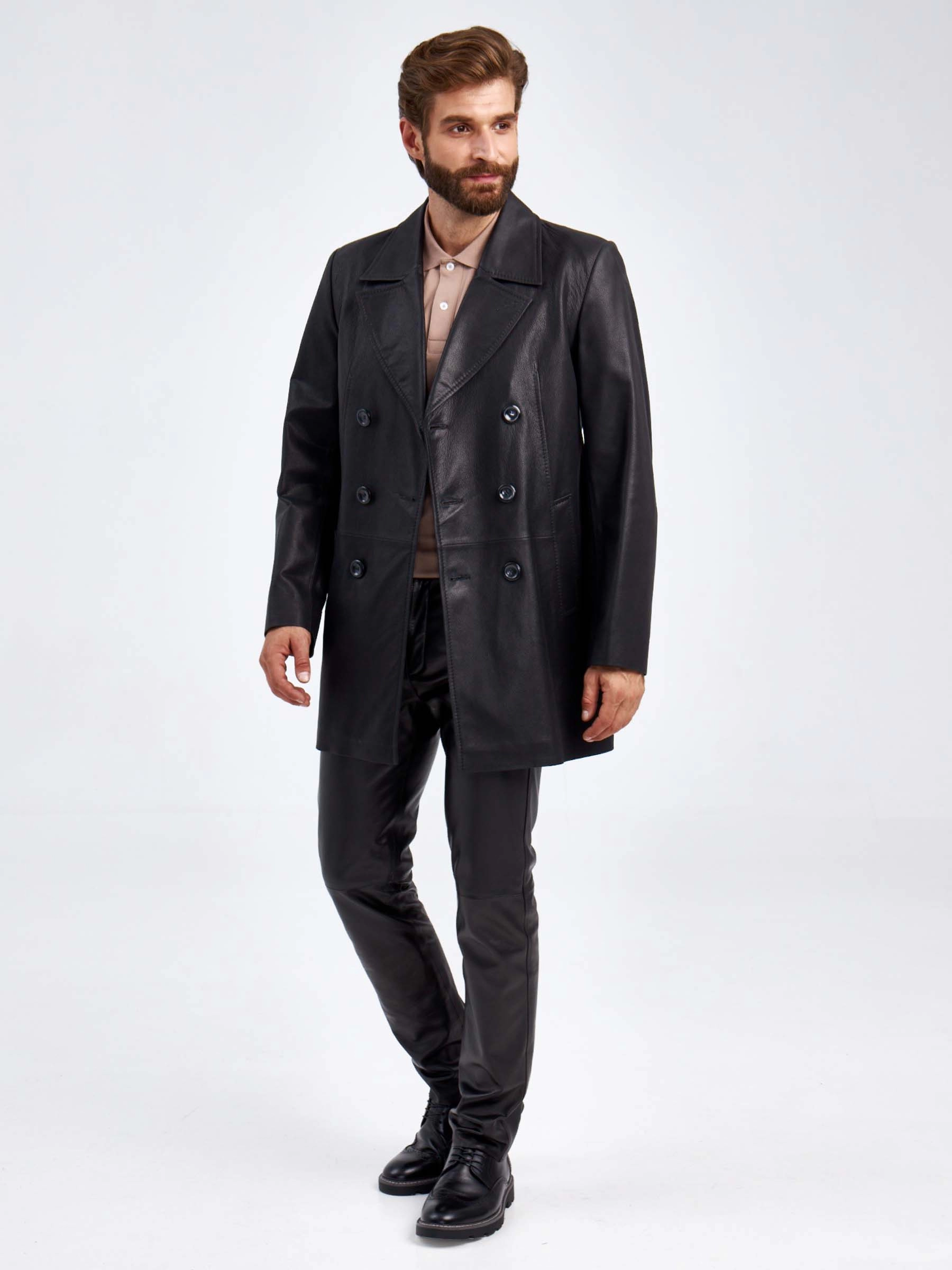 Кожаный комплект мужской: Френч двубортный 501 + Брюки 01, черный, р. 50, арт. 140620