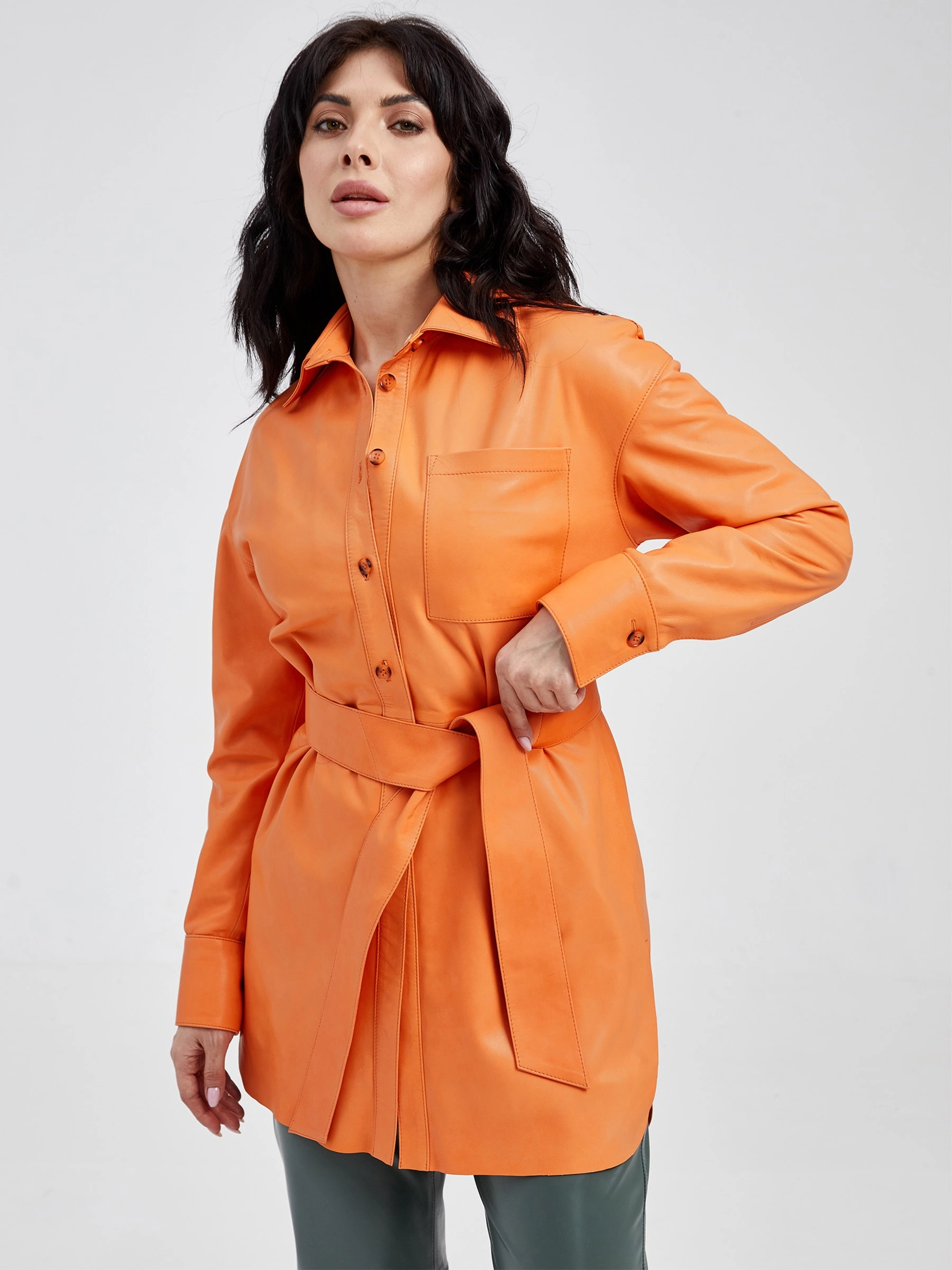 Товар кожаный костюм женский: рубашка 01_3 + брюки 03, оранжевый/оливковый, р. 46, арт. 111118. Рассчитан на сезон: весна-лето.