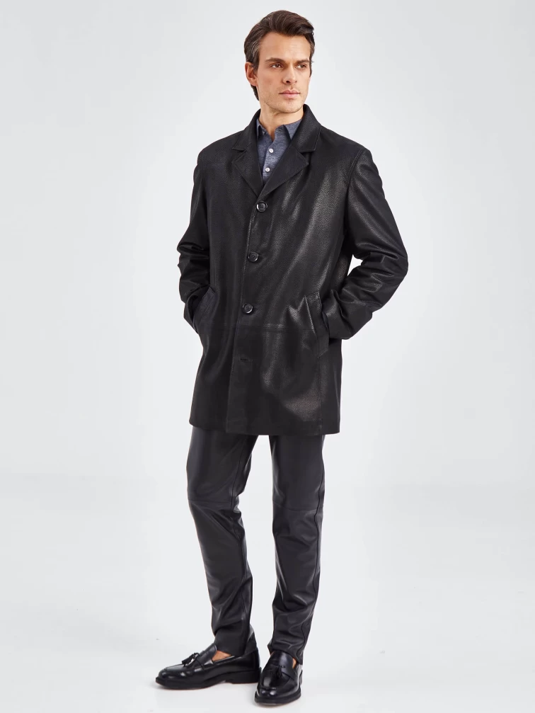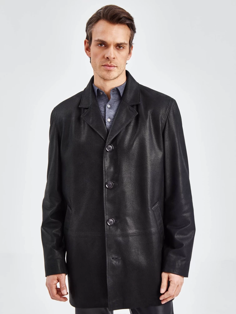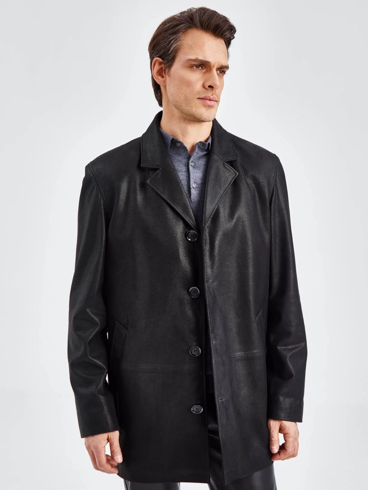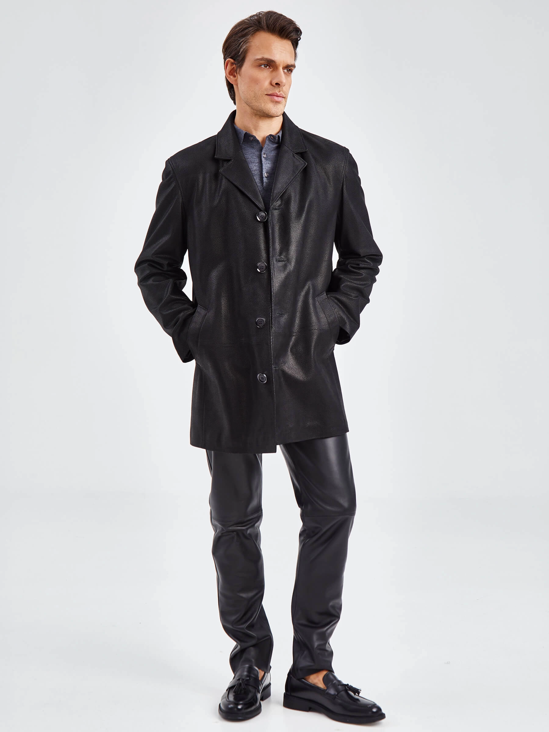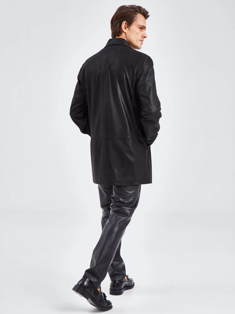 Мужской пиджак в современном исполнении. Черная кожа особой выделки. Прекрасное сочетание как с джинсами, так и с классическим костюмом. Модель комфортно садится по фигуре поверх пиджака. Прямой силуэт. Английский воротник. Рукав втачной двухшовный. Ширина рукавов и специальное построение плечевого пояса, обеспечивают комфортную посадку на любой тип фигур. Широкий усиленный подборт предотвращает деформацию. Эргономичные усиленные листочки наружных карманов. Предусмотрены внутренние застёгивающиеся карманы для документов. Особая обработка петель под пуговицы предотвращает их изнашивание.