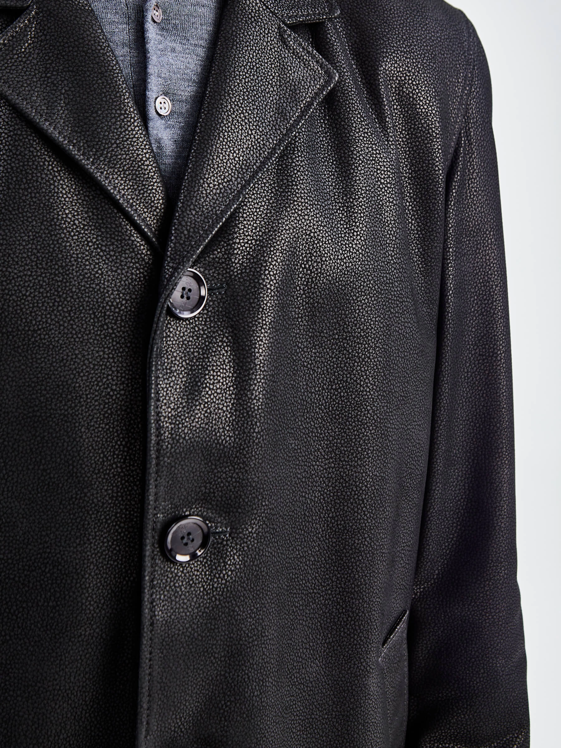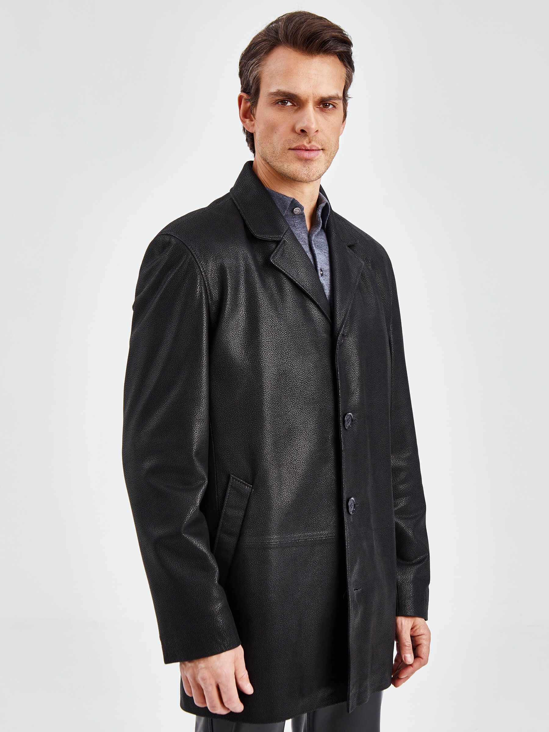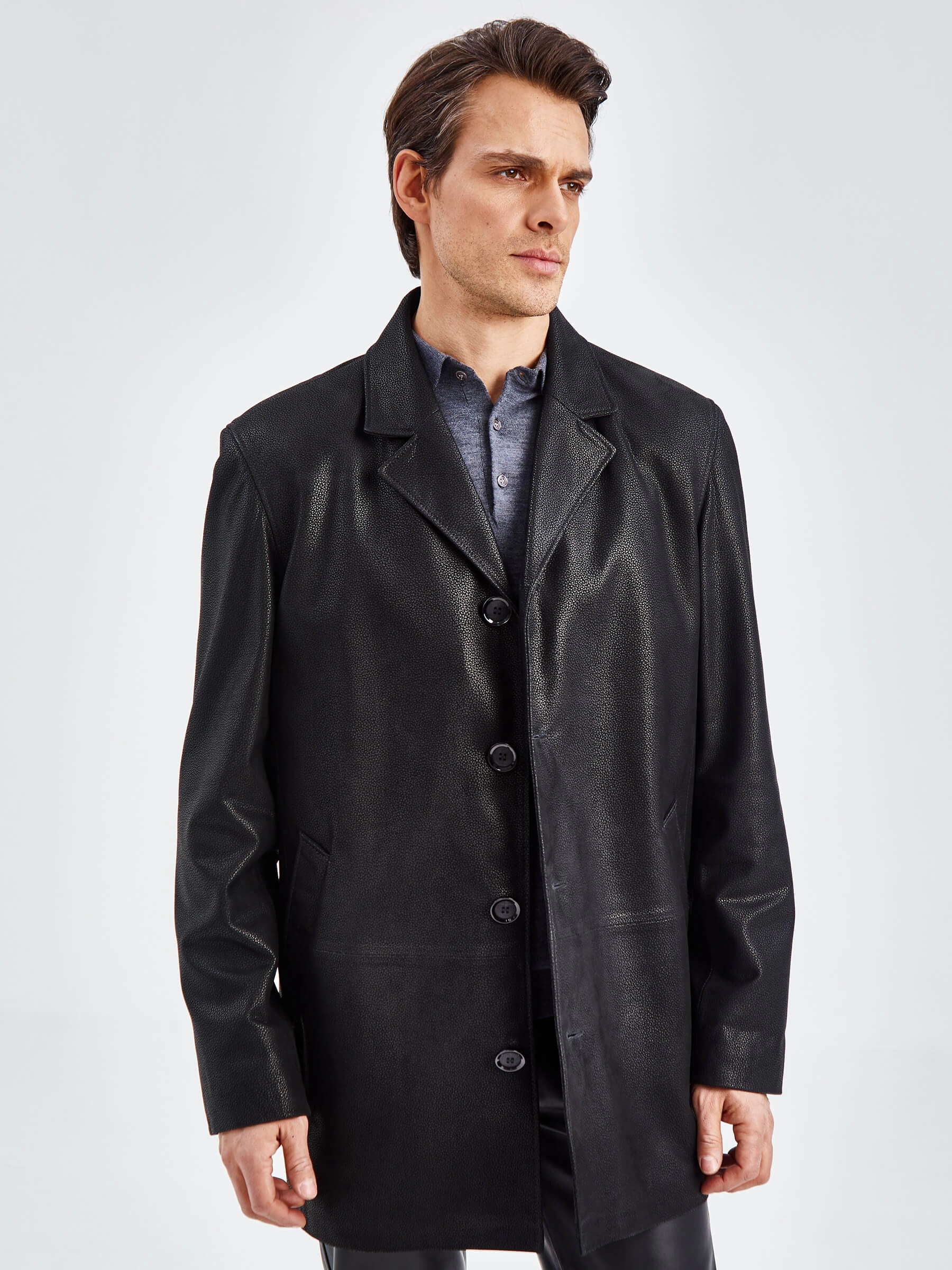 Мужской пиджак в современном исполнении. Черная кожа особой выделки. Прекрасное сочетание как с джинсами, так и с классическим костюмом. Модель комфортно садится по фигуре поверх пиджака. Прямой силуэт. Английский воротник. Рукав втачной двухшовный. Ширина рукавов и специальное построение плечевого пояса, обеспечивают комфортную посадку на любой тип фигур. Широкий усиленный подборт предотвращает деформацию. Эргономичные усиленные листочки наружных карманов. Предусмотрены внутренние застёгивающиеся карманы для документов. Особая обработка петель под пуговицы предотвращает их изнашивание.