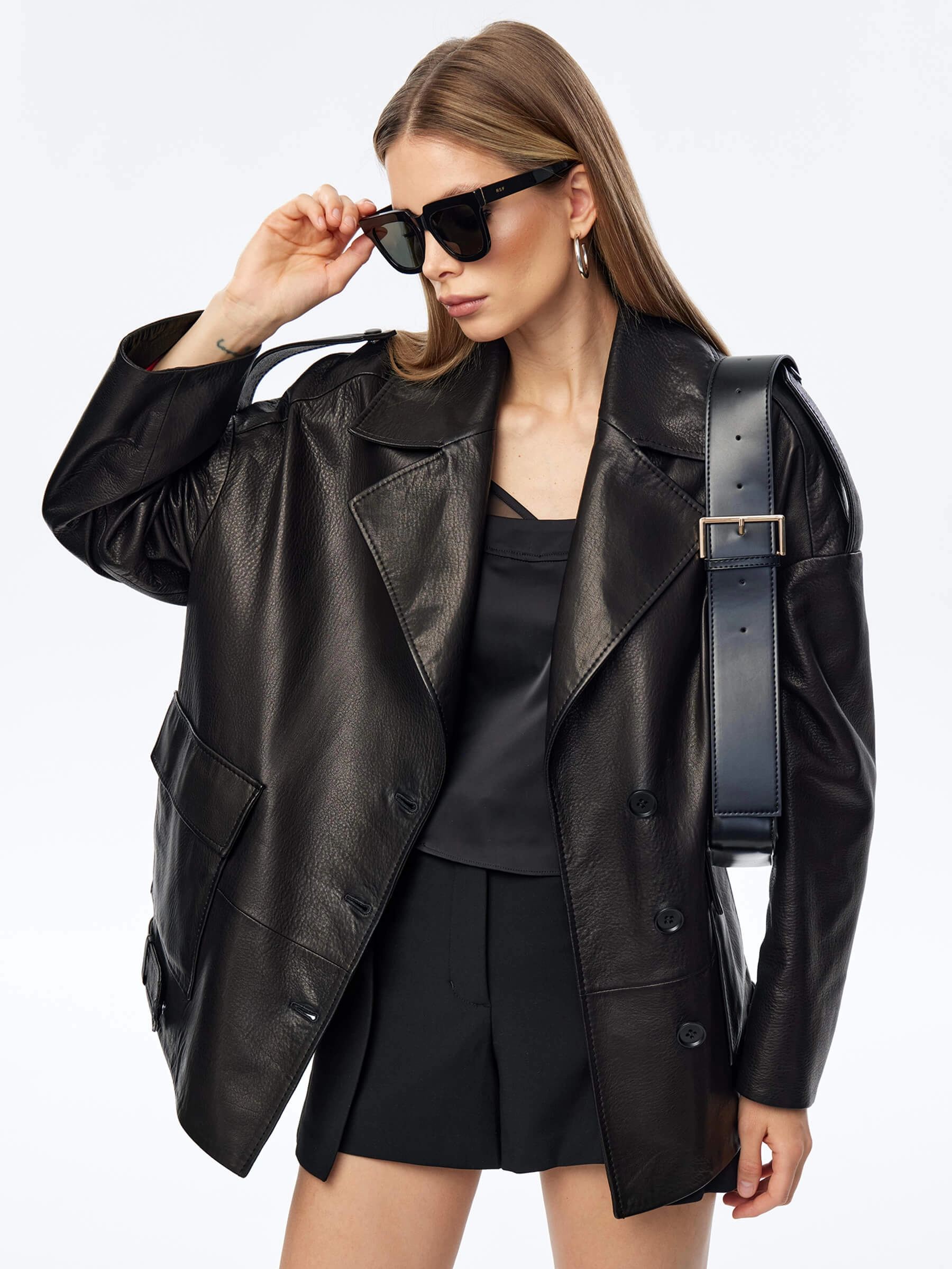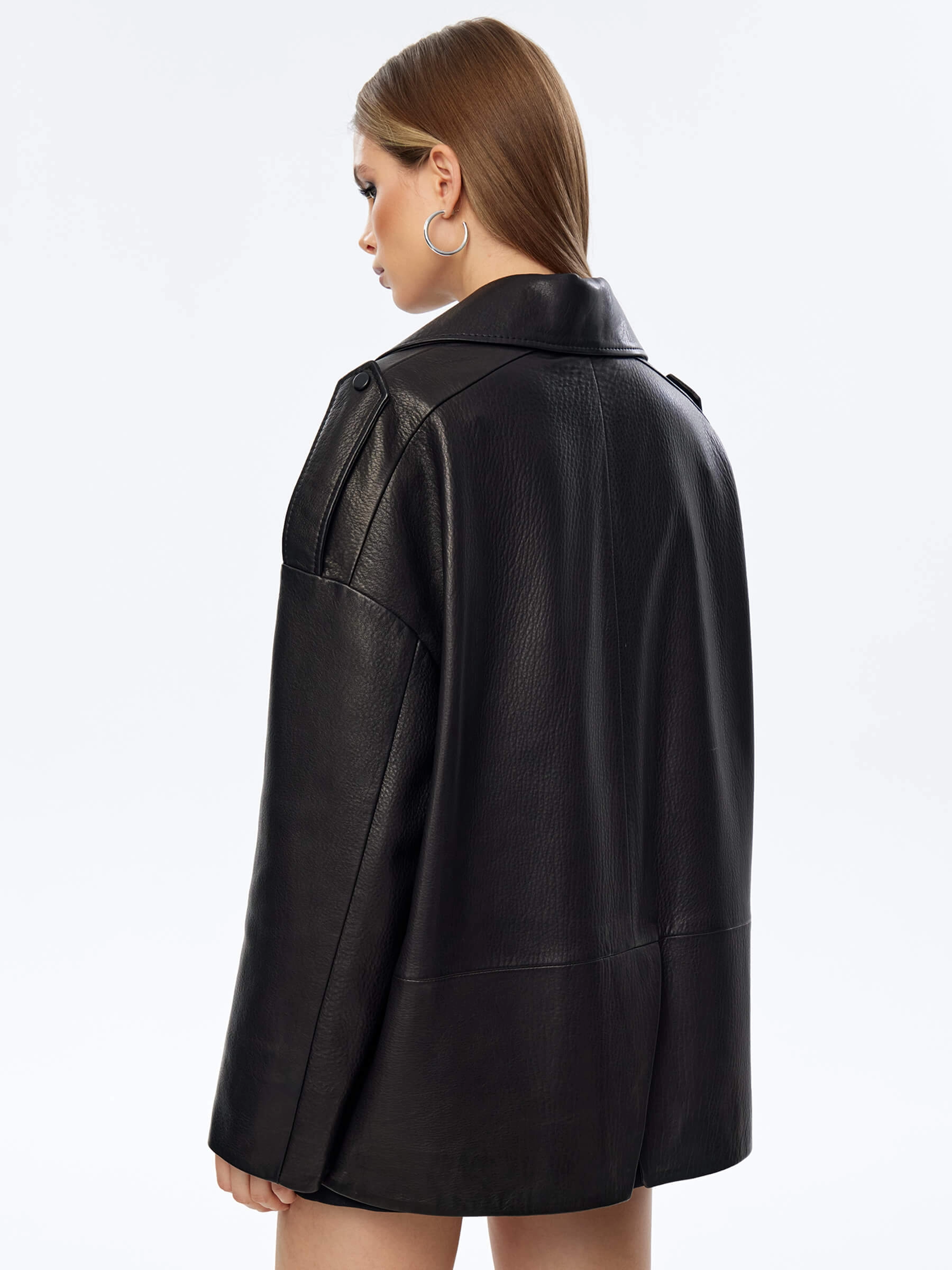 Свободный силуэт пиджака со спущенной линией плеч выполнили из мягкой мелкозернистой кожи премиум класса. Благодаря бережной выделки материал приобрел пластичность, сохранив его прочность. Дизайн модели подчеркнули погонами, боковыми патами и двумя накладными карманами закрывающиеся клапанами.