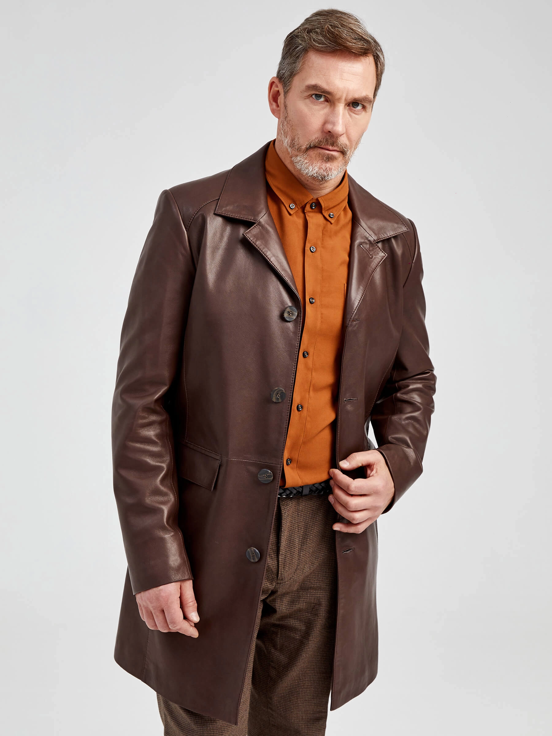 Товар удлиненный кожаный мужской пиджак премиум класса 539, коричневый, размер 50, артикул 29542 выполнен из натуральной кожи с застежкой пуговицы. Рассчитан на сезон: демисезон. Длина изделия 95 см, силуэт полуприлегающий.