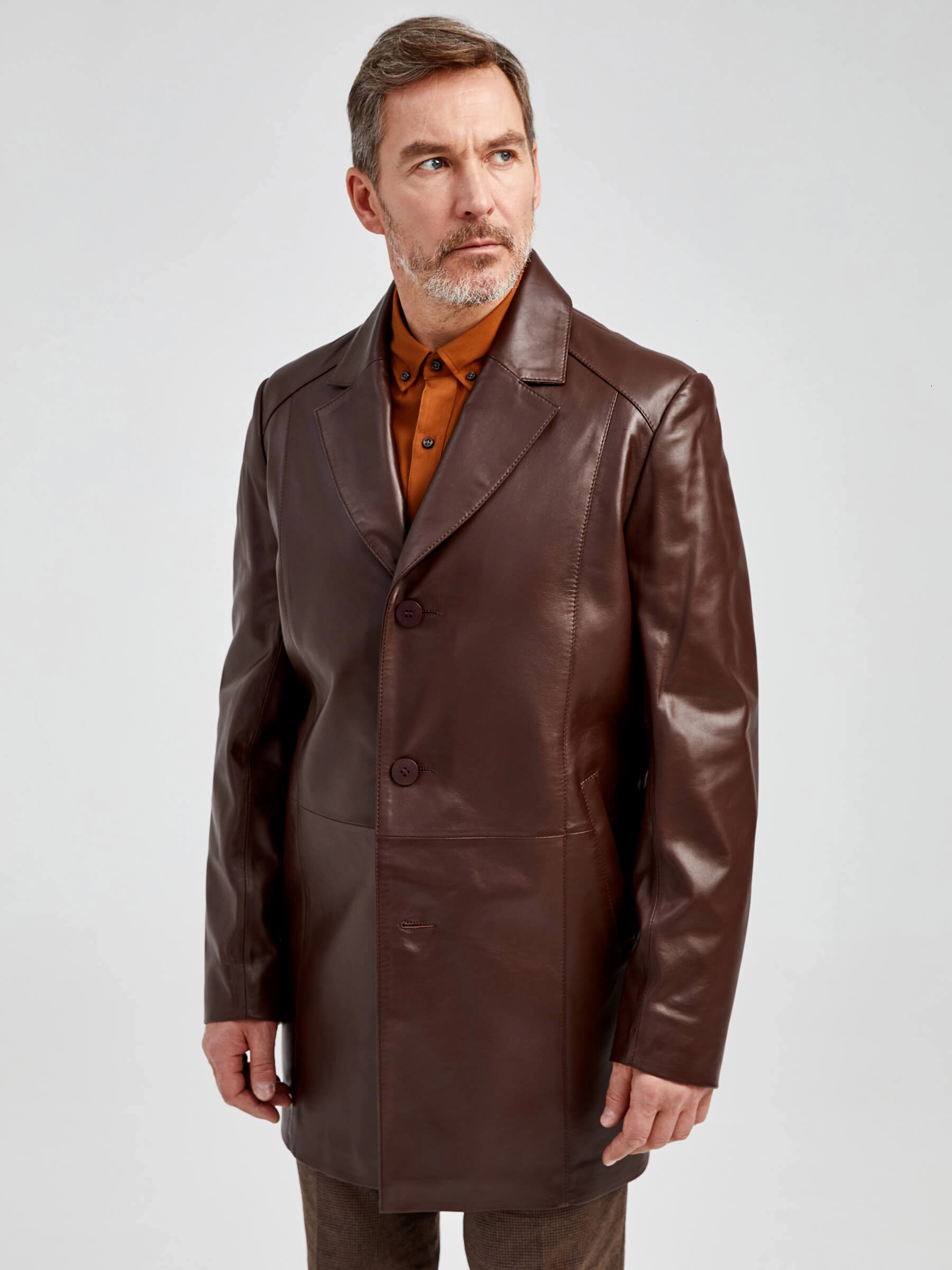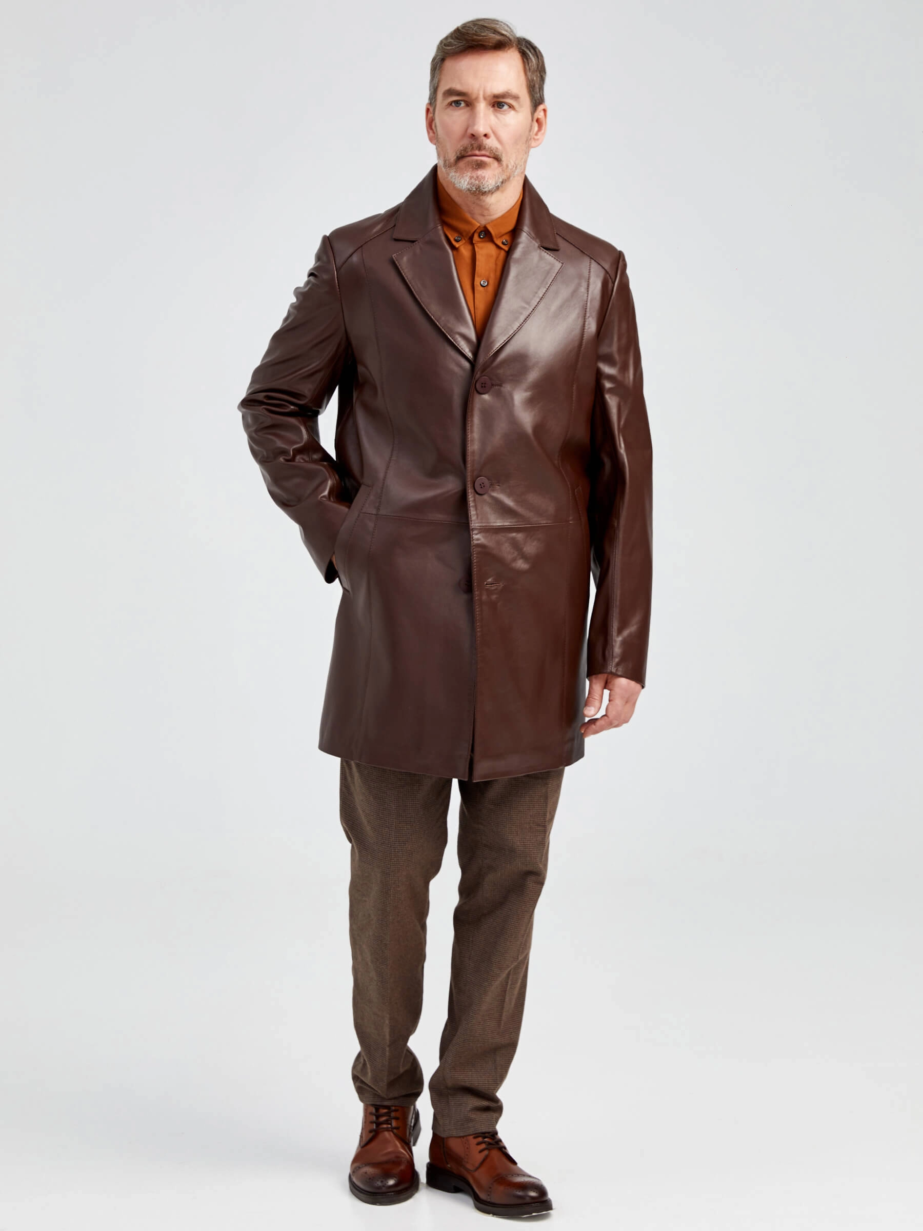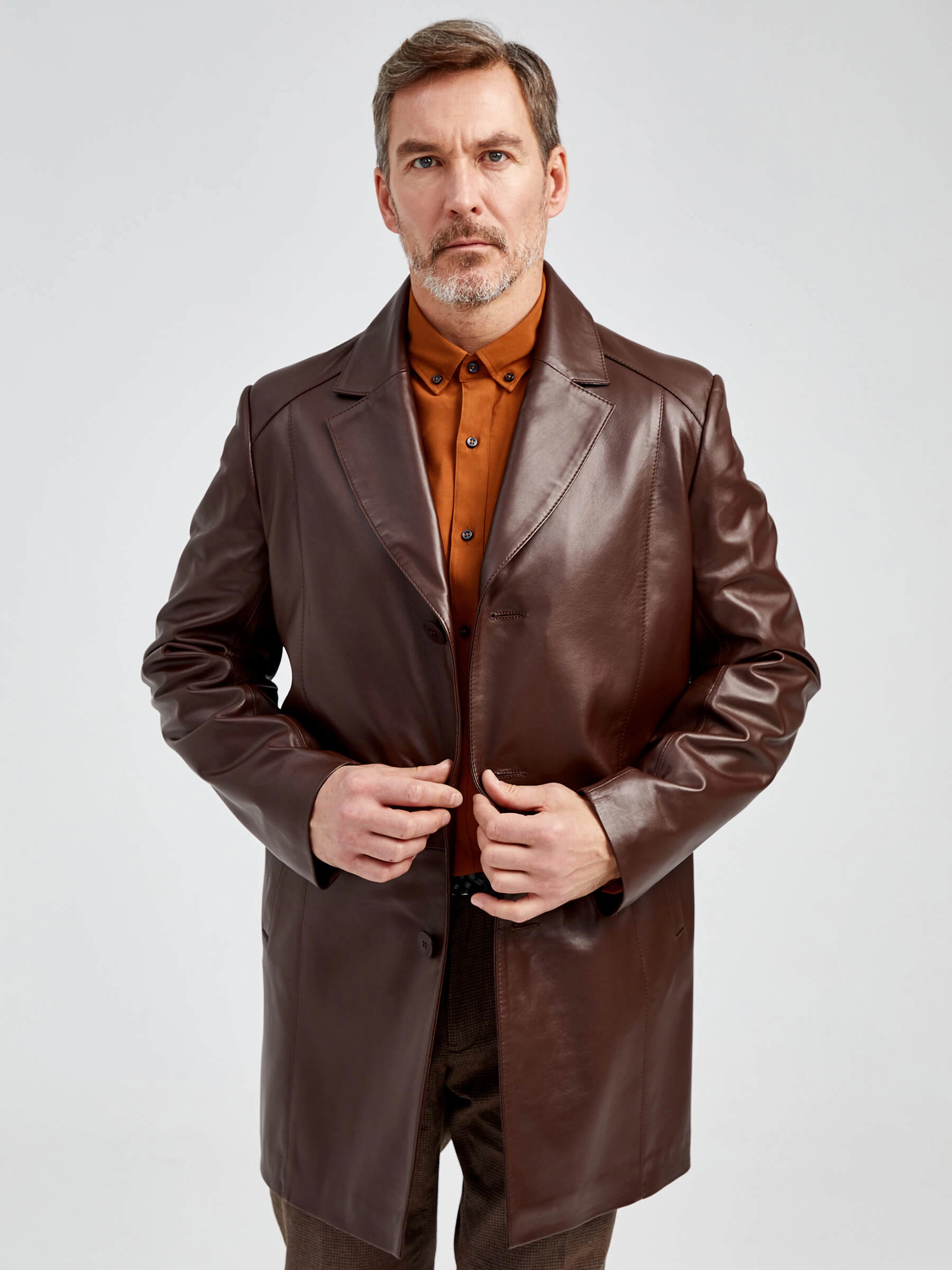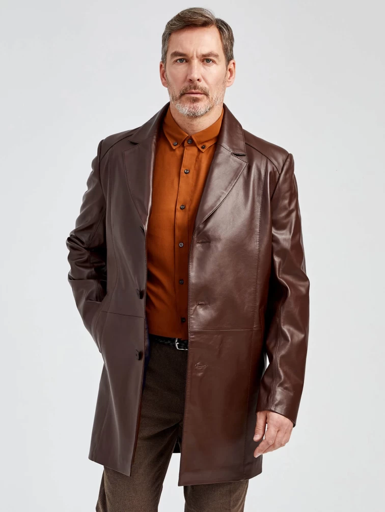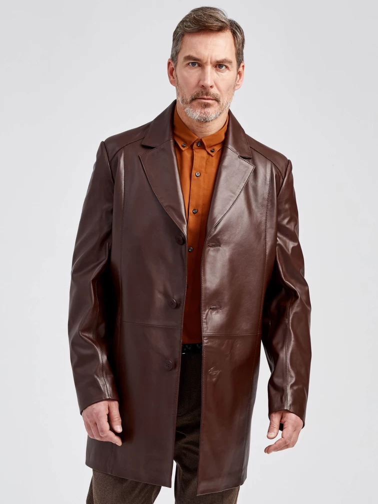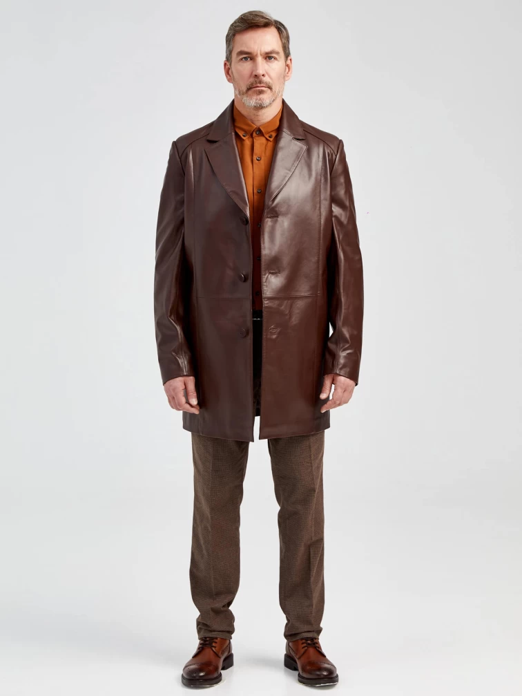 Кожаный пиджак удлиненный премиум класса для мужчин 541, коричневый, размер 48, артикул 29531