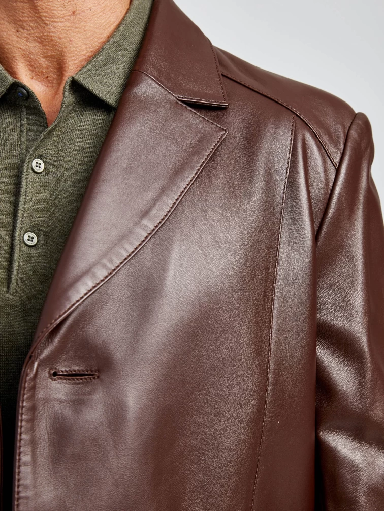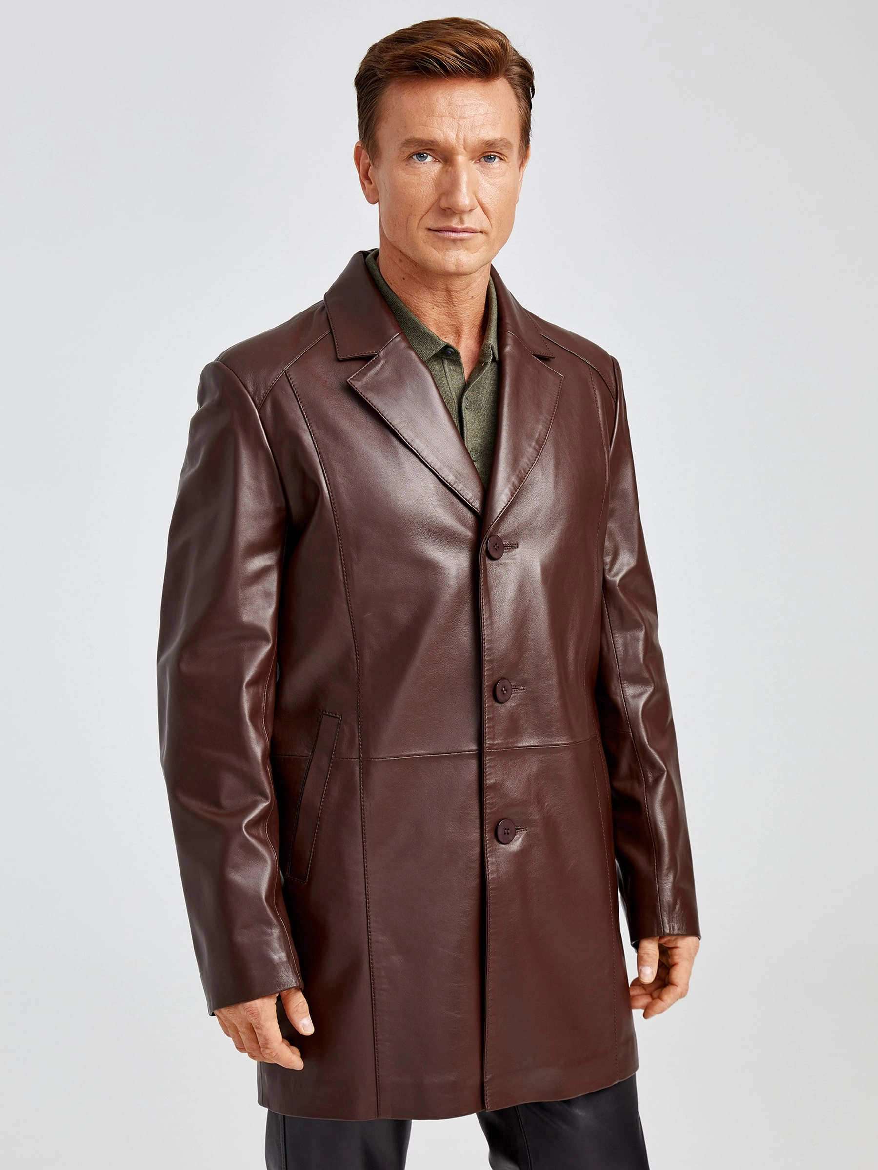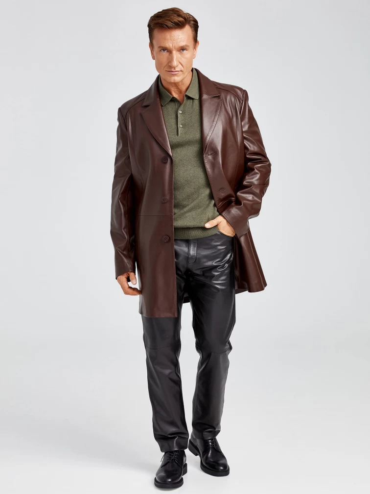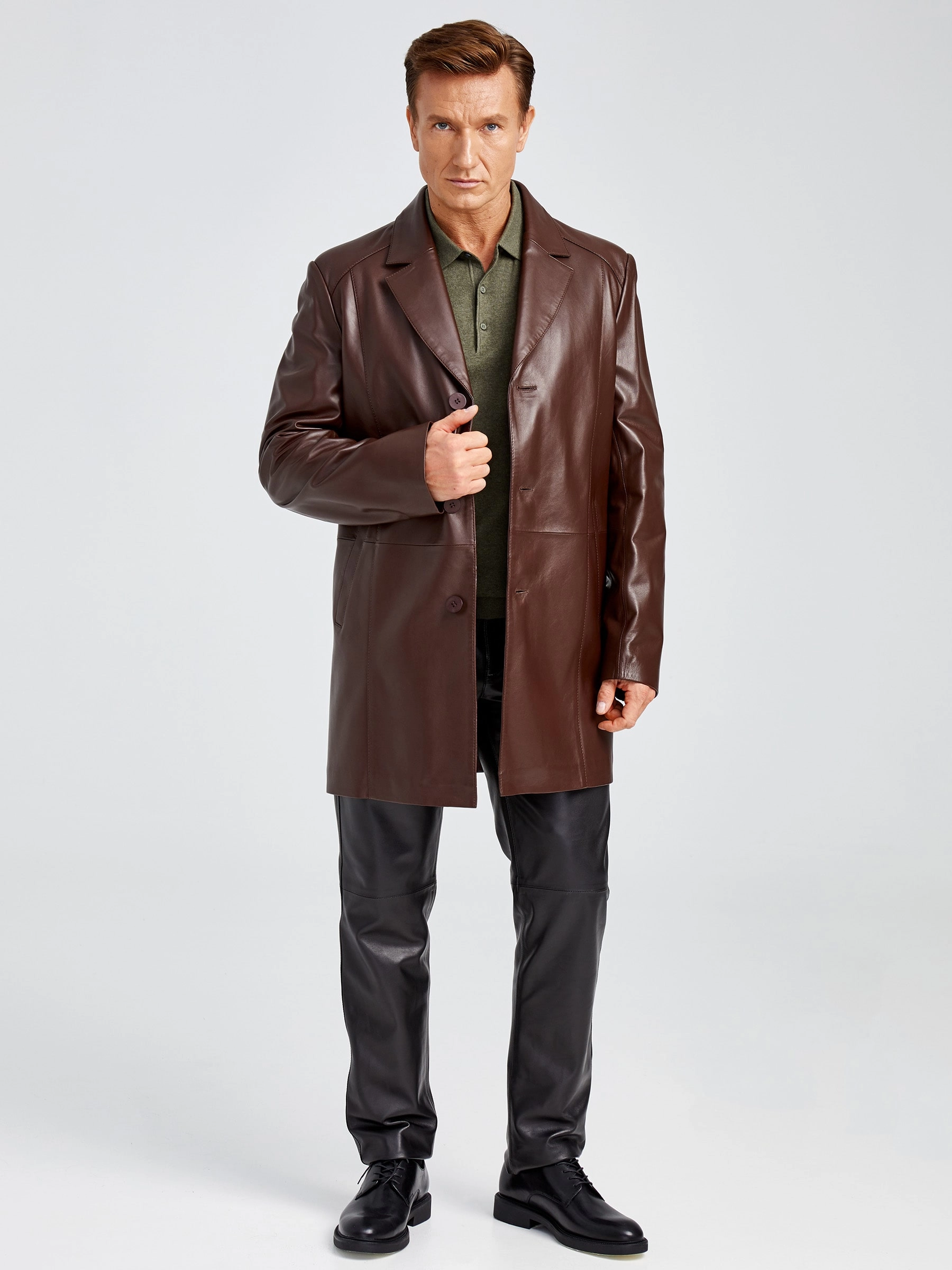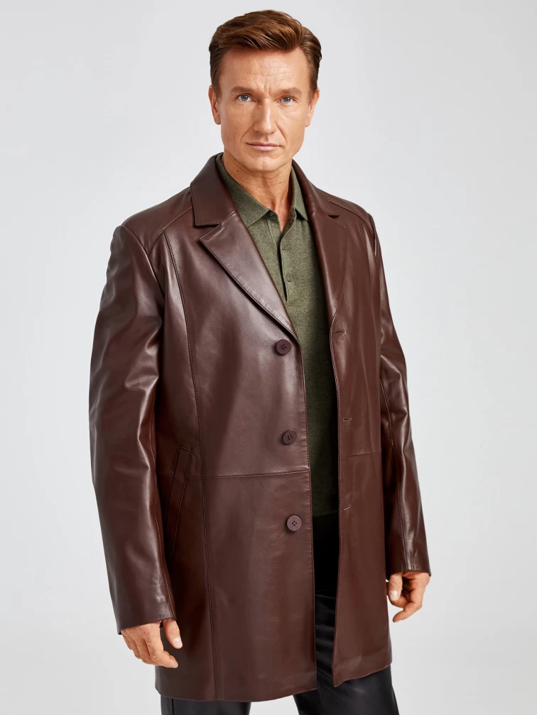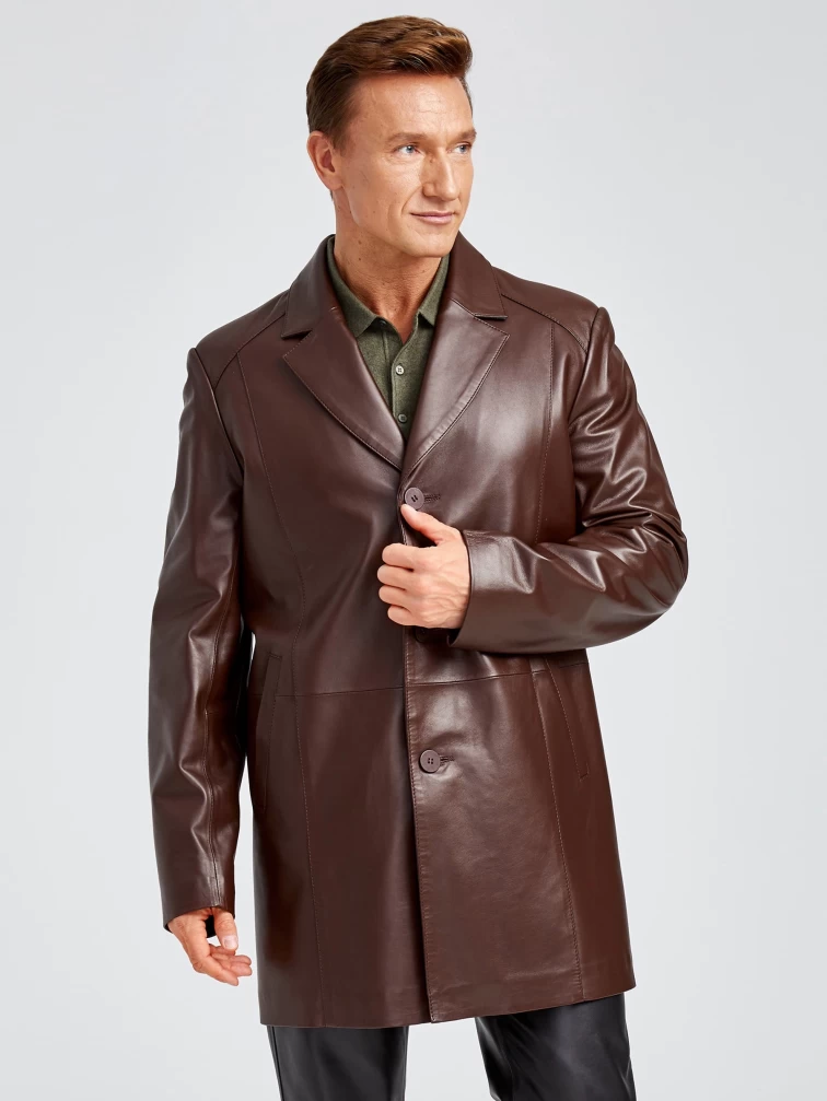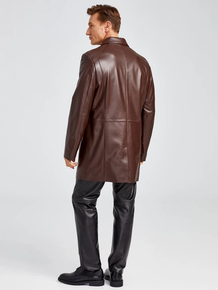 Кожаный пиджак удлиненный премиум класса для мужчин 541, коричневый, размер 48, артикул 29532