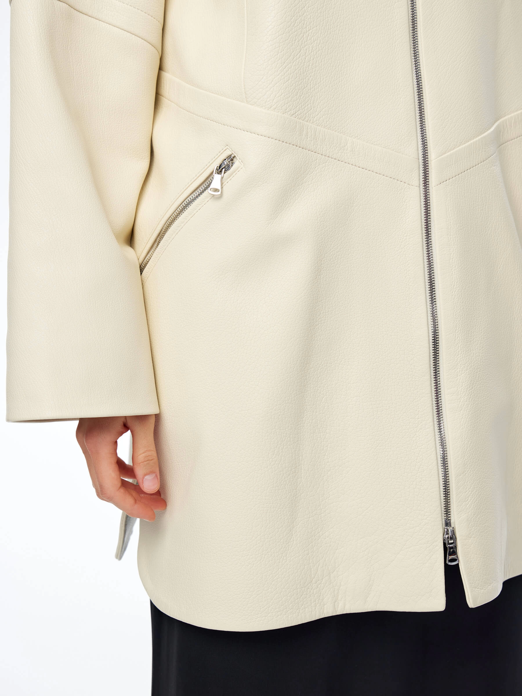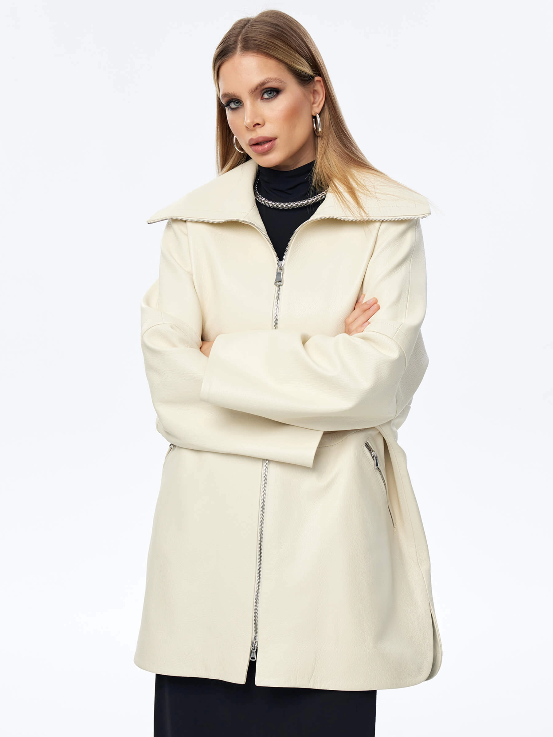 Товар кожаный плащ оверсайз на молнии для женщин премиум класса 3057, белый, размер 50, артикул 23530 выполнен из натуральной кожи с застежкой молния. Рассчитан на сезон: весна-осень. Длина изделия 87 см, силуэт оверсайз.
