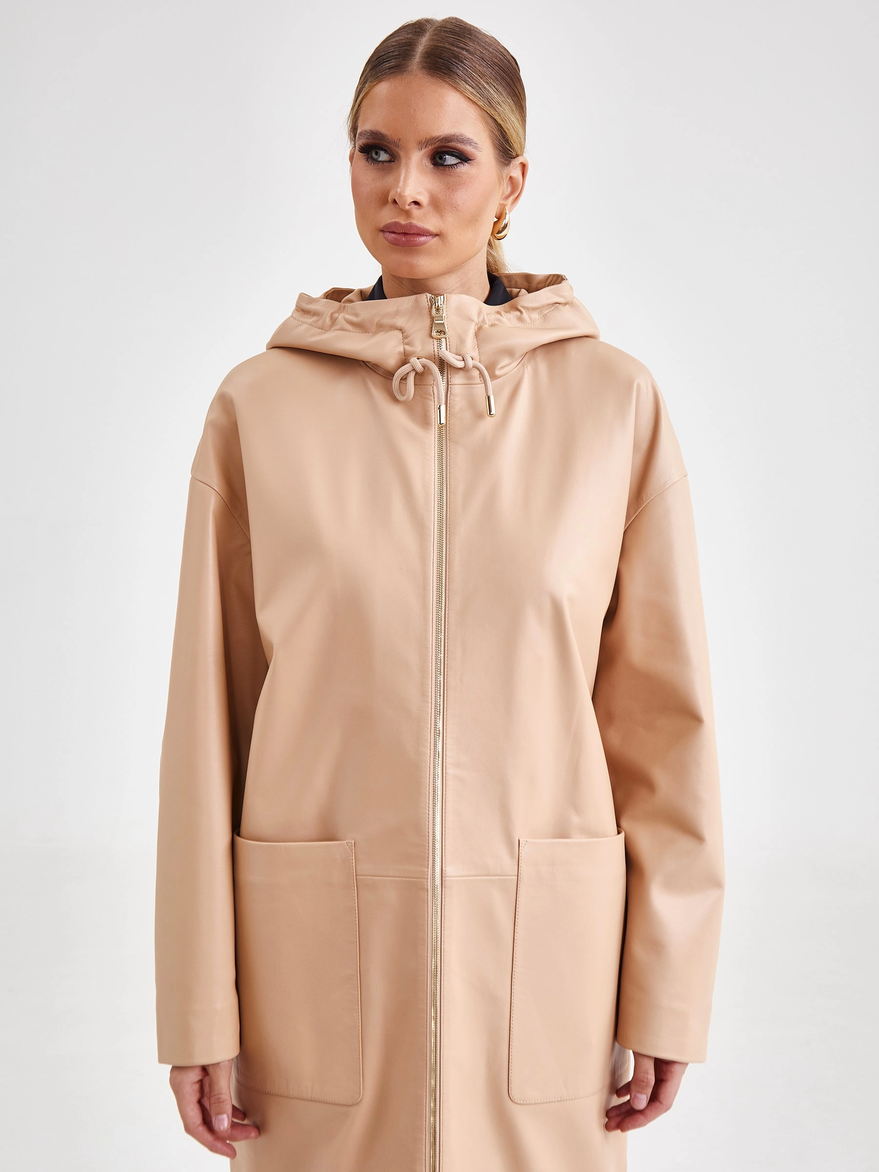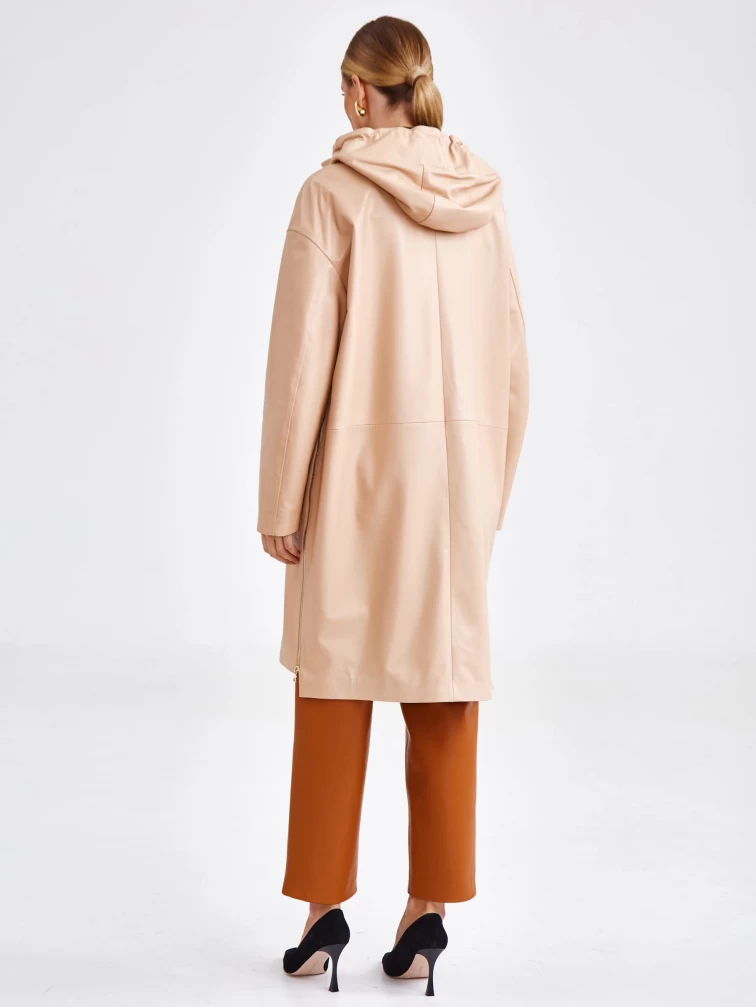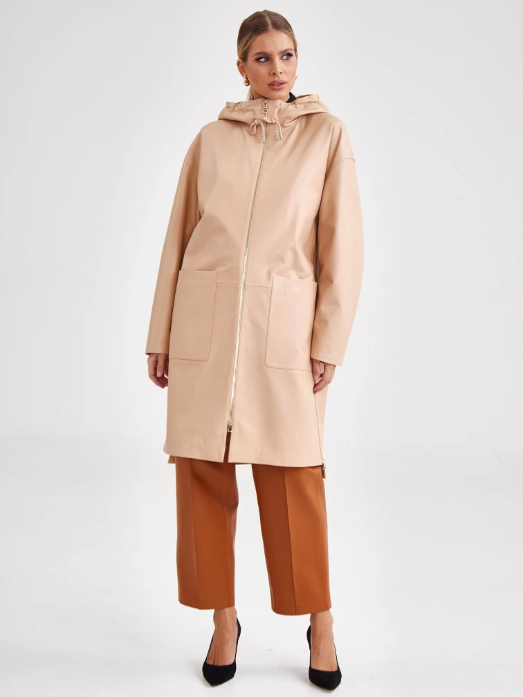 Кожаный женский плащ с капюшоном на молнии премиум класса 3034, бежевый, размер 48, артикул 91941