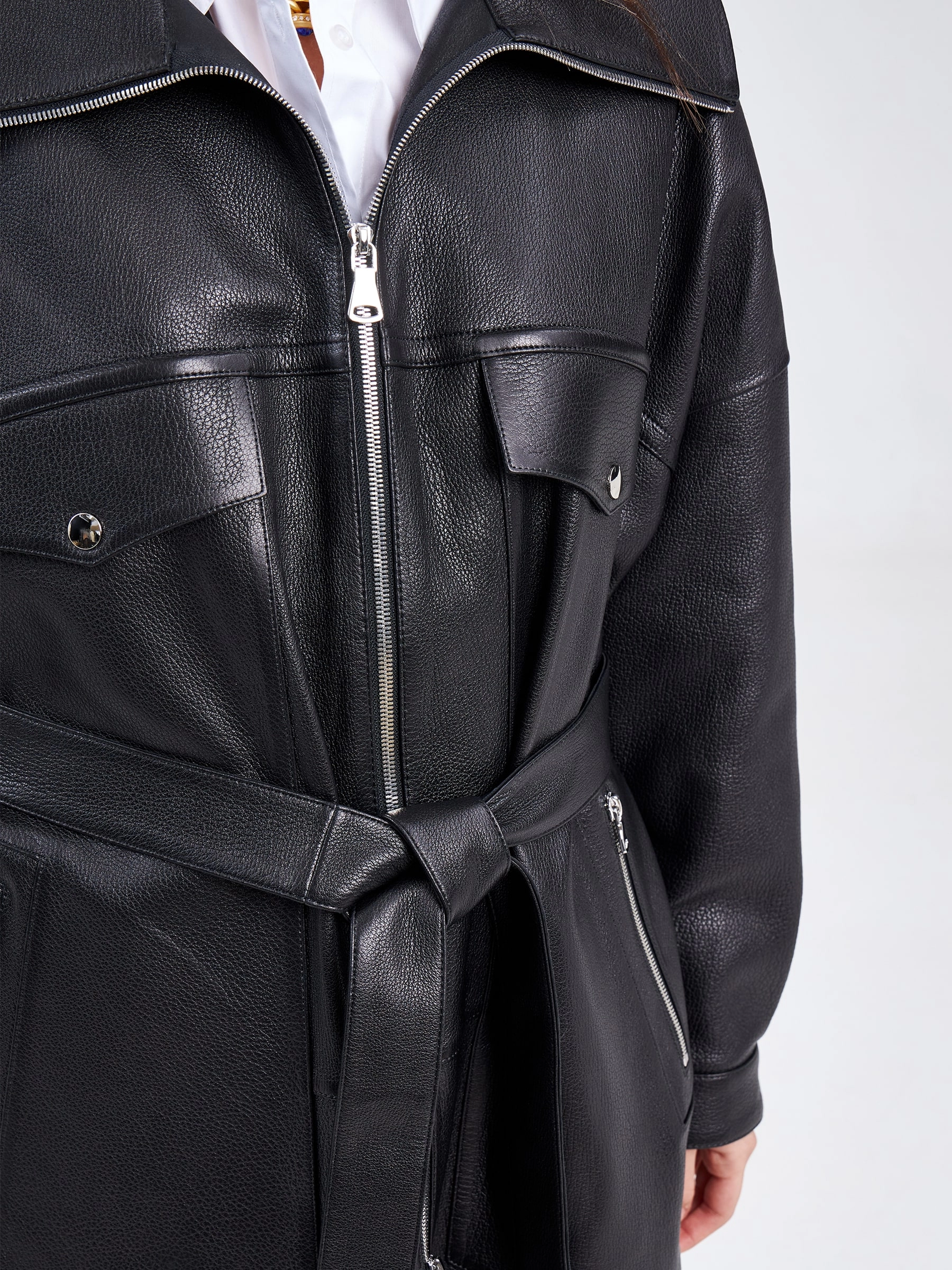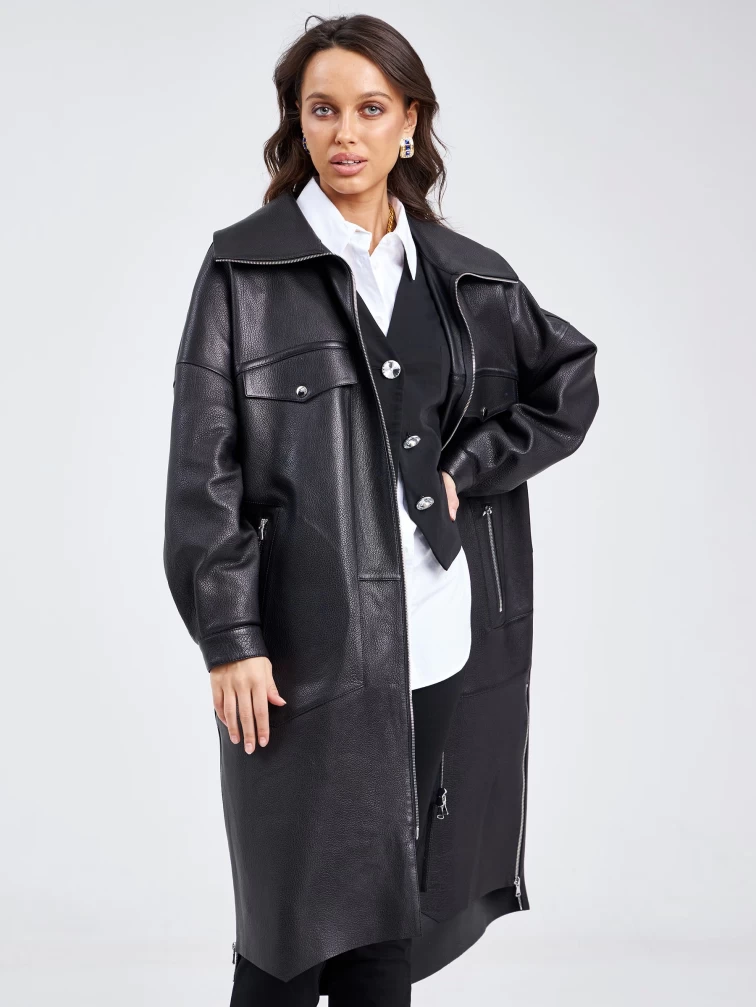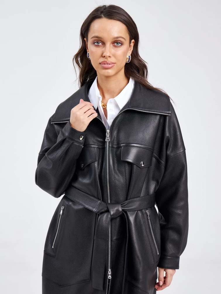Ваш наряд не будет смотрется скучно в кожаном плаще премиум класса. Модель позаимствовали у рубашки, лишь слегка изменив детали. Свободный крой, четыре кармана,боковые разрезы как и сама модель застегиваются на молнию. Отложной воротник можно легко превратить в стойку. Широкий пояс-лента формирует приталенный силуэт. Идеальное сочетание с любой одеждой.