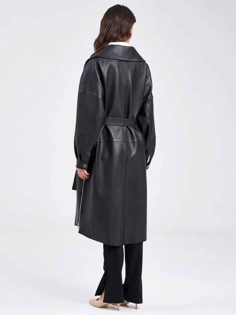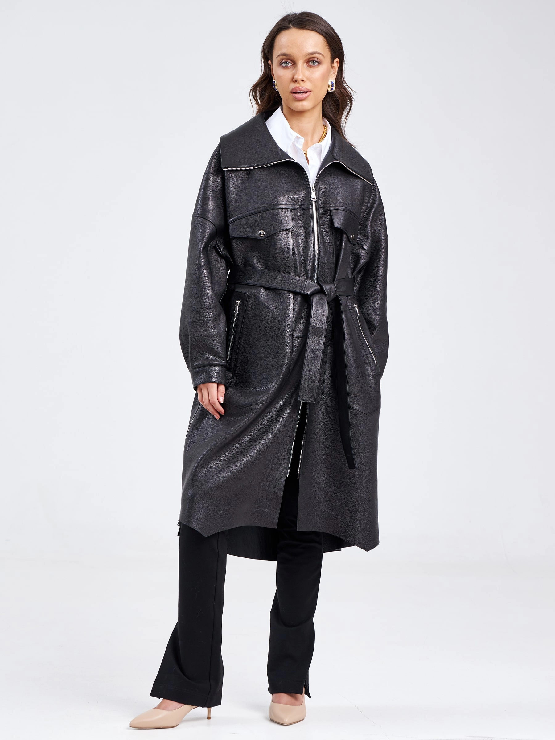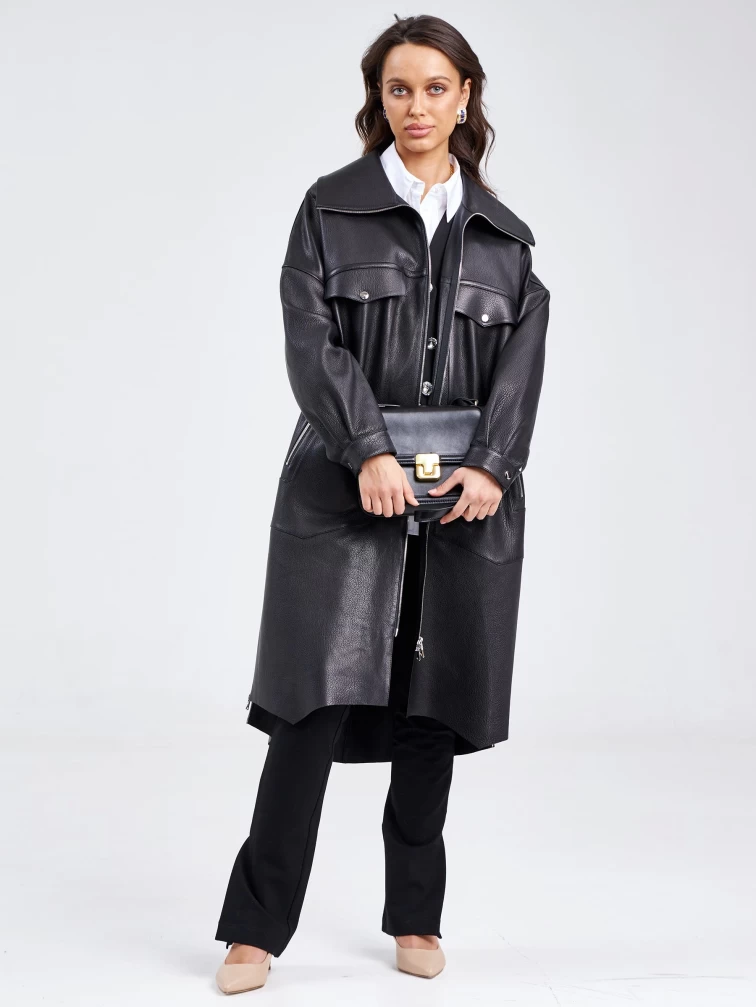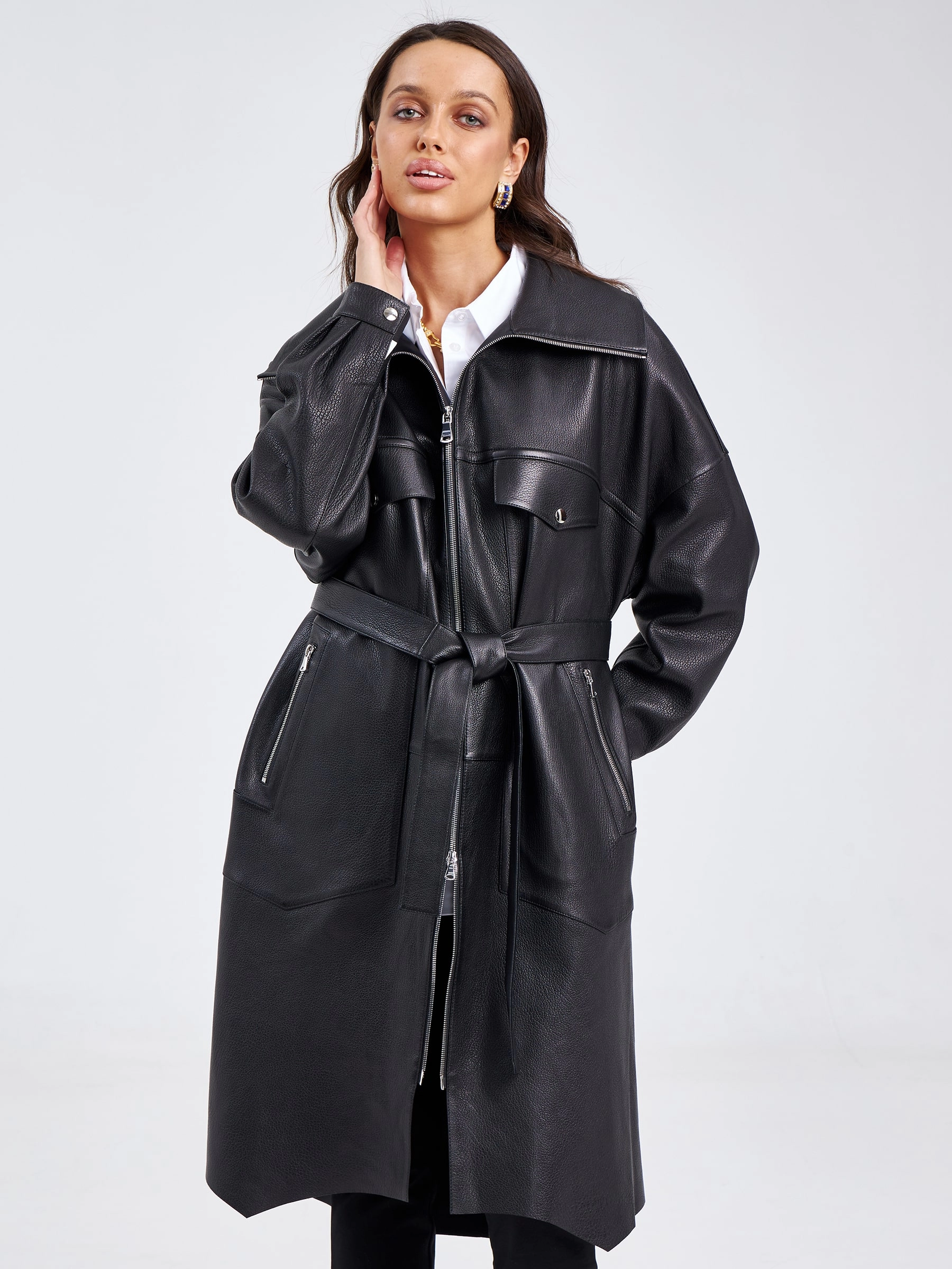 Ваш наряд не будет смотрется скучно в кожаном плаще премиум класса. Модель позаимствовали у рубашки, лишь слегка изменив детали. Свободный крой, четыре кармана,боковые разрезы как и сама модель застегиваются на молнию. Отложной воротник можно легко превратить в стойку. Широкий пояс-лента формирует приталенный силуэт. Идеальное сочетание с любой одеждой.