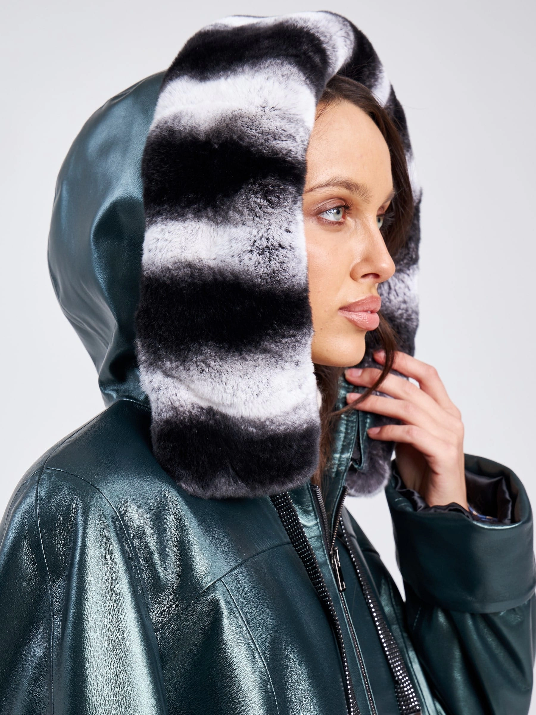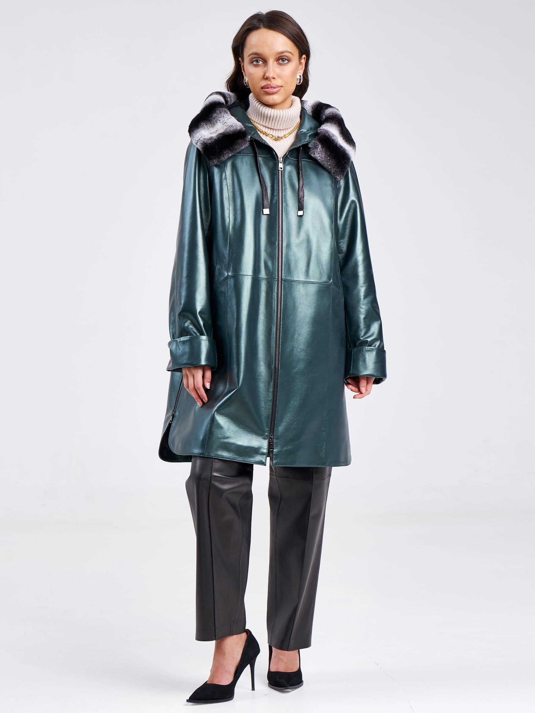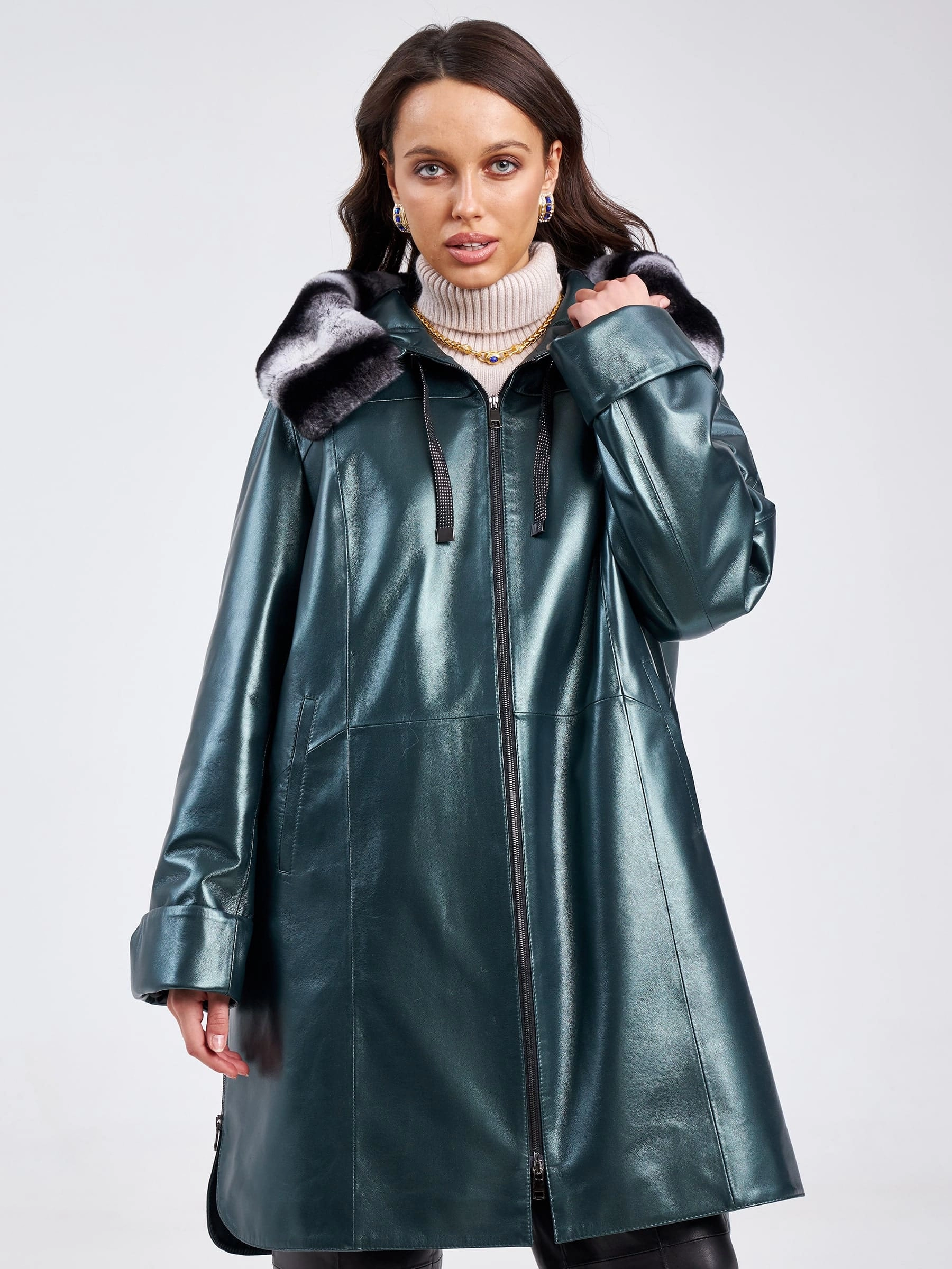 Кожаный плащ с меховым капюшоном женский 3020, зеленый, размер 50, артикул 23270