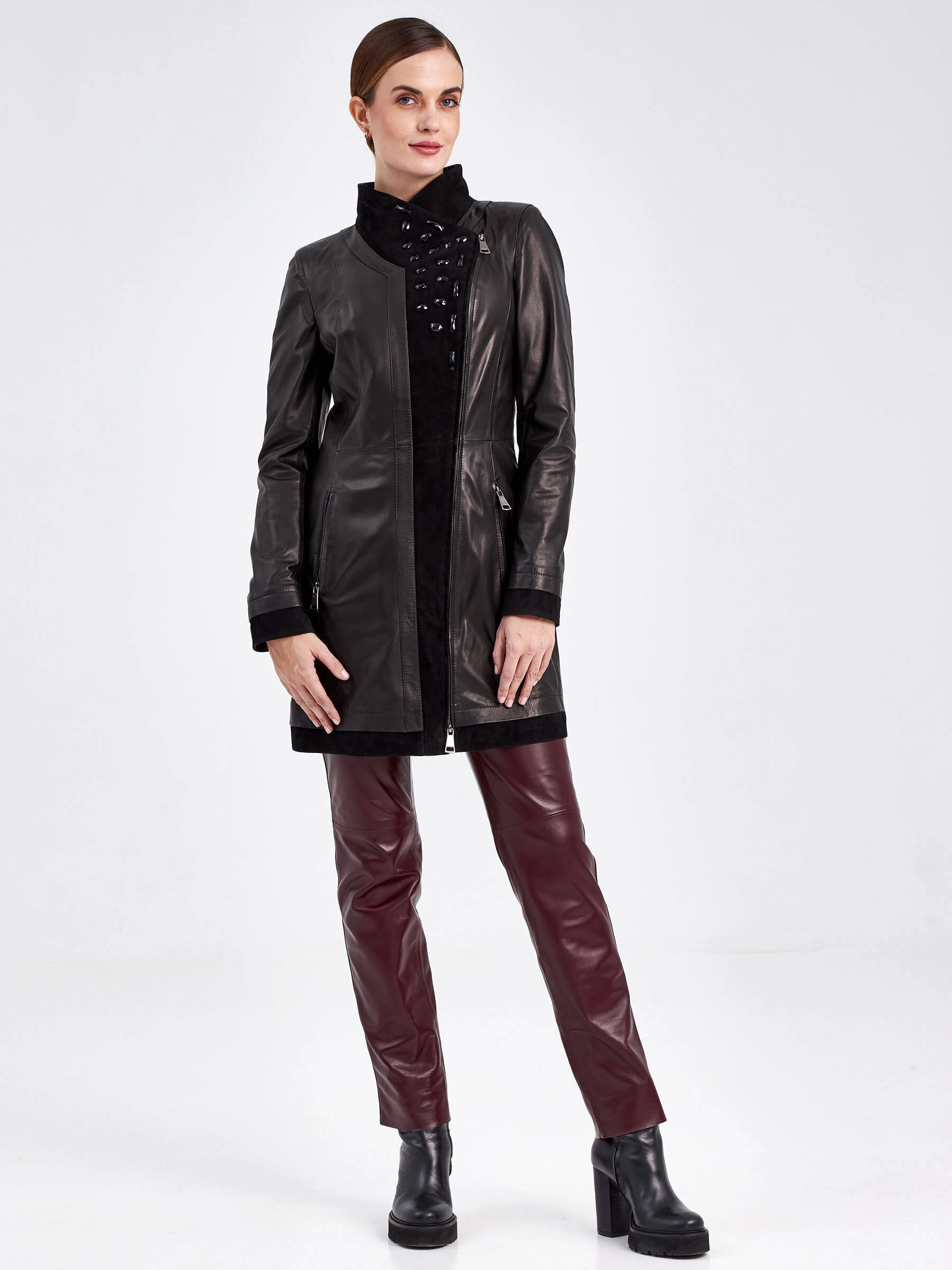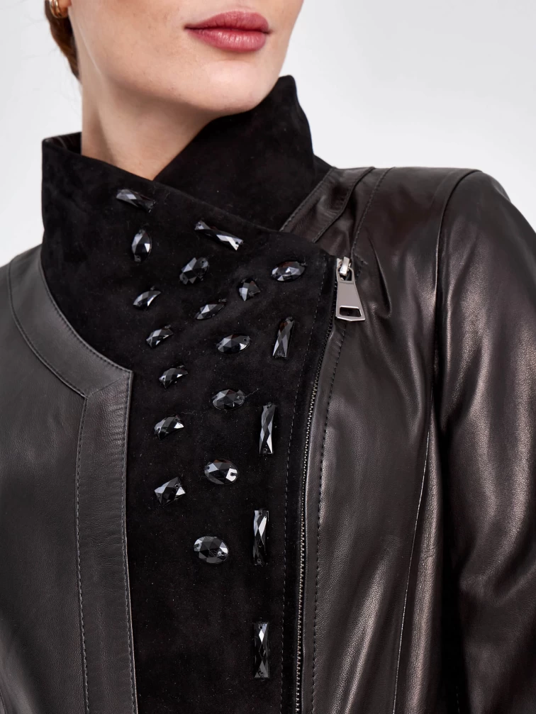 Создавая эту модель, мастера использовали натуральную мягкую кожу. Полуприлегающий силуэт. Воротник- стойка, борт и низ изделия, выполнили из нежной черной замши. За декор взяли стразы в тон изделия.За дополнительный комфорт отвечают двухзамковая молния и широкий кожаный пояс.