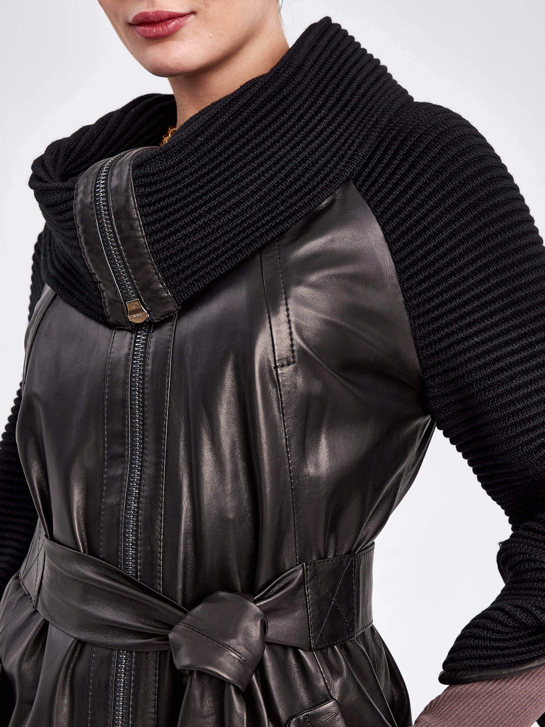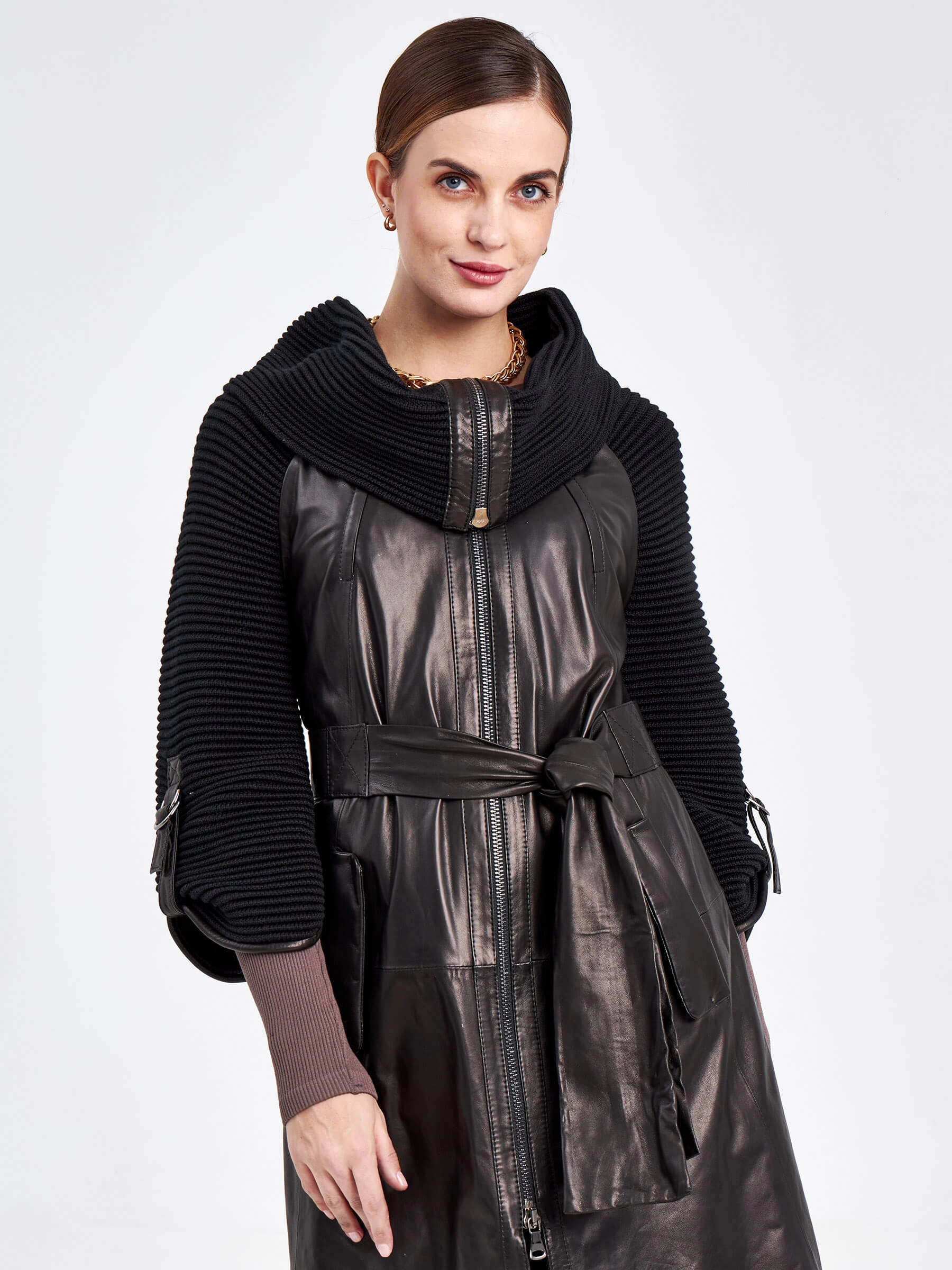 Товар кожаный плащ женский 396, с трикотажными рукавами, черный, размер 46, артикул 91740 выполнен из натуральной кожи с застежкой молния. Рассчитан на сезон: весна-осень. Длина изделия 86 см, силуэт полуприлегающий.