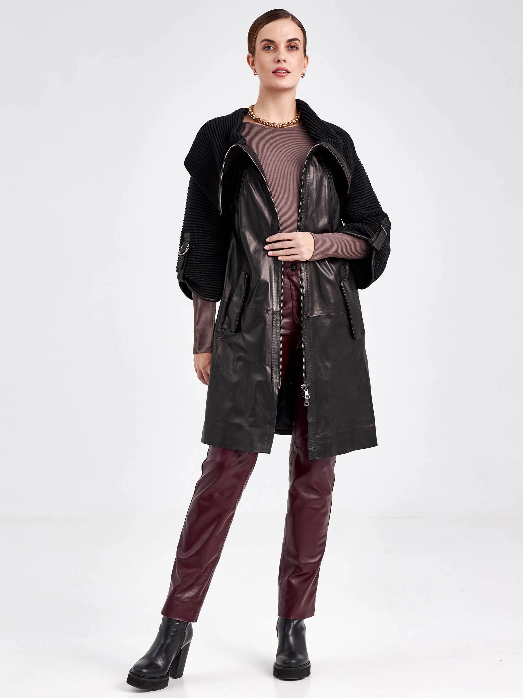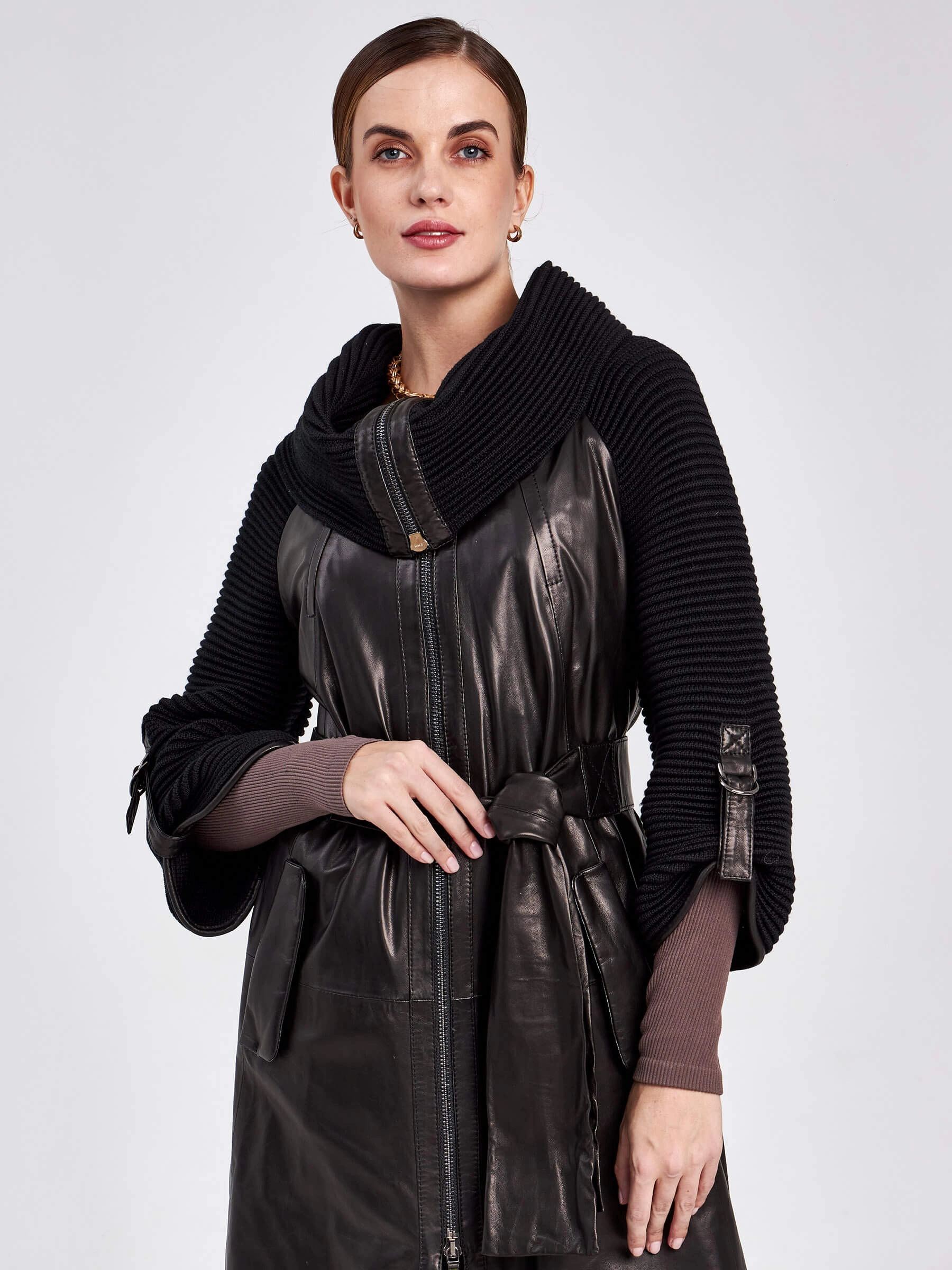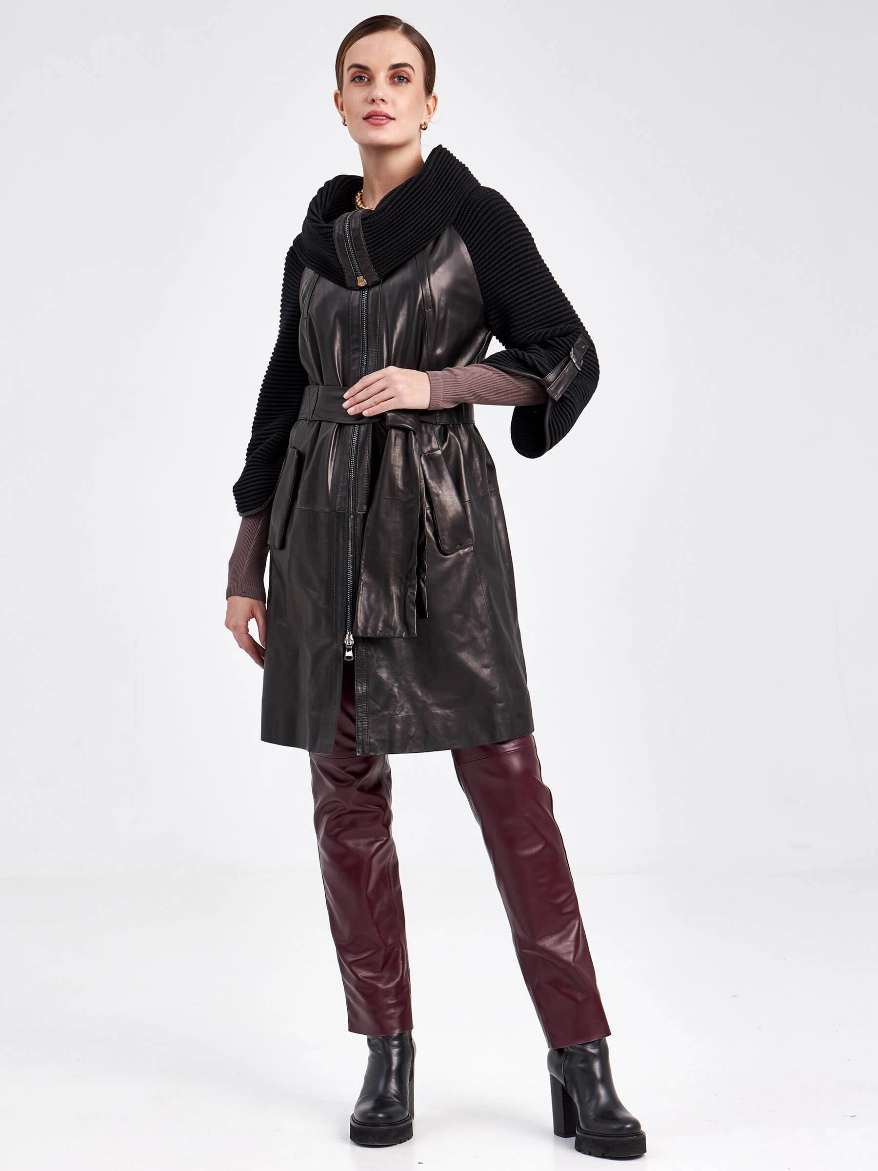 Этот женственный кожаный плащ на весну-осень, выполненный в полуприлегающем силуэте длиной 86 см, объединяет в себе элегантность и комфорт. Мастера скомбинировали мягкую натуральную кожу с плотным трикотажем: объёмный воротник-стойка и рукава реглан из трикотажа эффектно обрамлены кожаными деталями. Застёжка на двухзамковую молнию, практичная подкладка из вискозы (53%) и полиэстера (47%), а также регулируемые ремешки на рукавах обеспечивают удобство. Финальным акцентом стал кожаный ремень, который позволяет подчеркнуть талию. Совет от стилиста: создайте стильный городской образ, дополнив плащ однотонным платьем-миди и ботильонами на устойчивом каблуке, — ремень подчеркнёт линию талии, сохраняя при этом динамику силуэта.