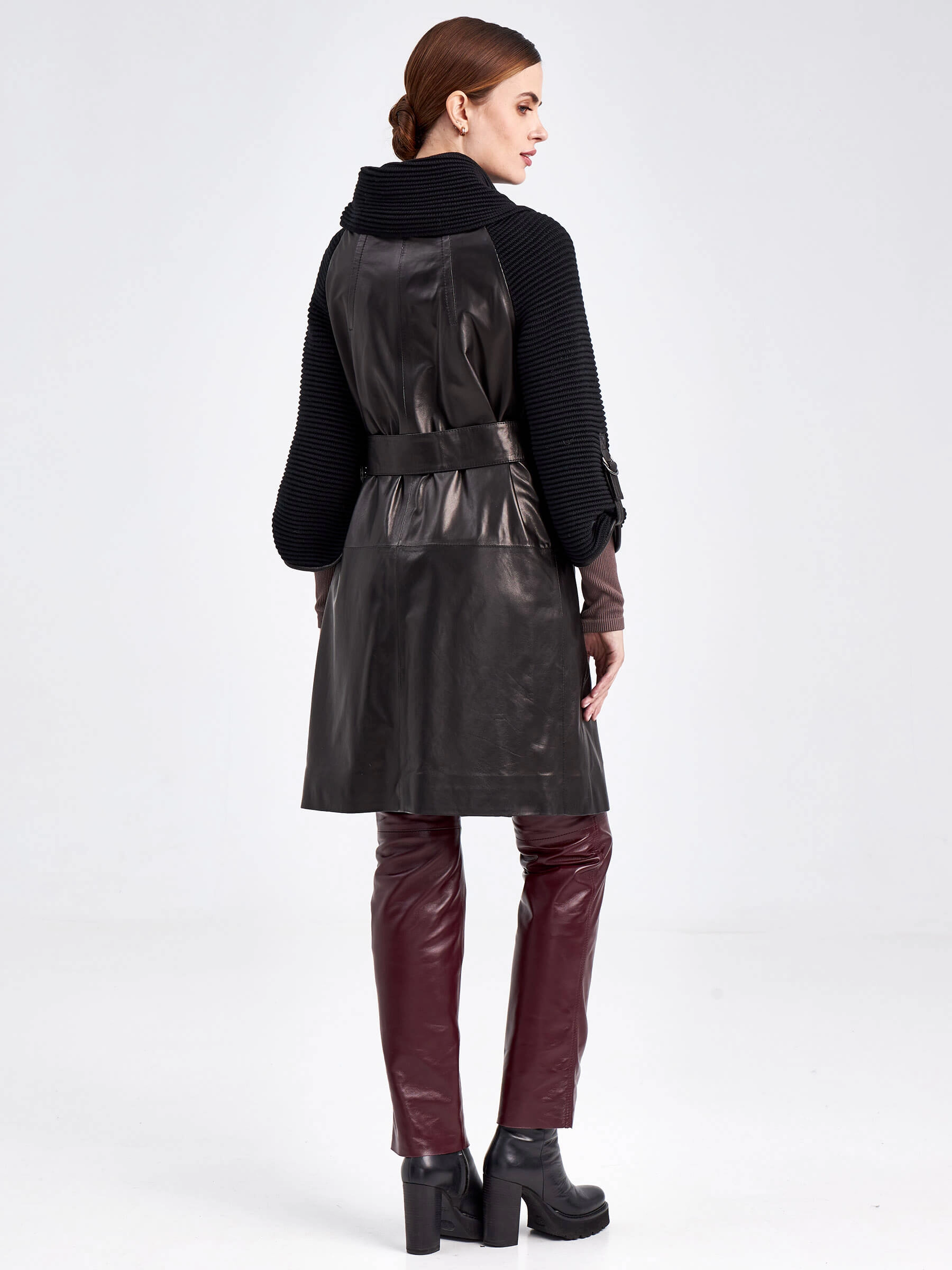 Кожаный плащ женский 396, с трикотажными рукавами, черный, размер 46, артикул 91740