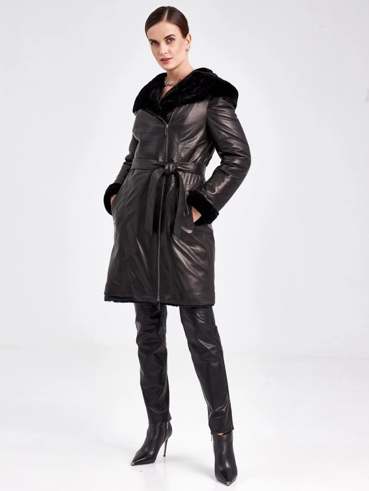 Кожаный плащ зимний женский 394мех, с капюшоном, черный, размер 46, артикул 92090