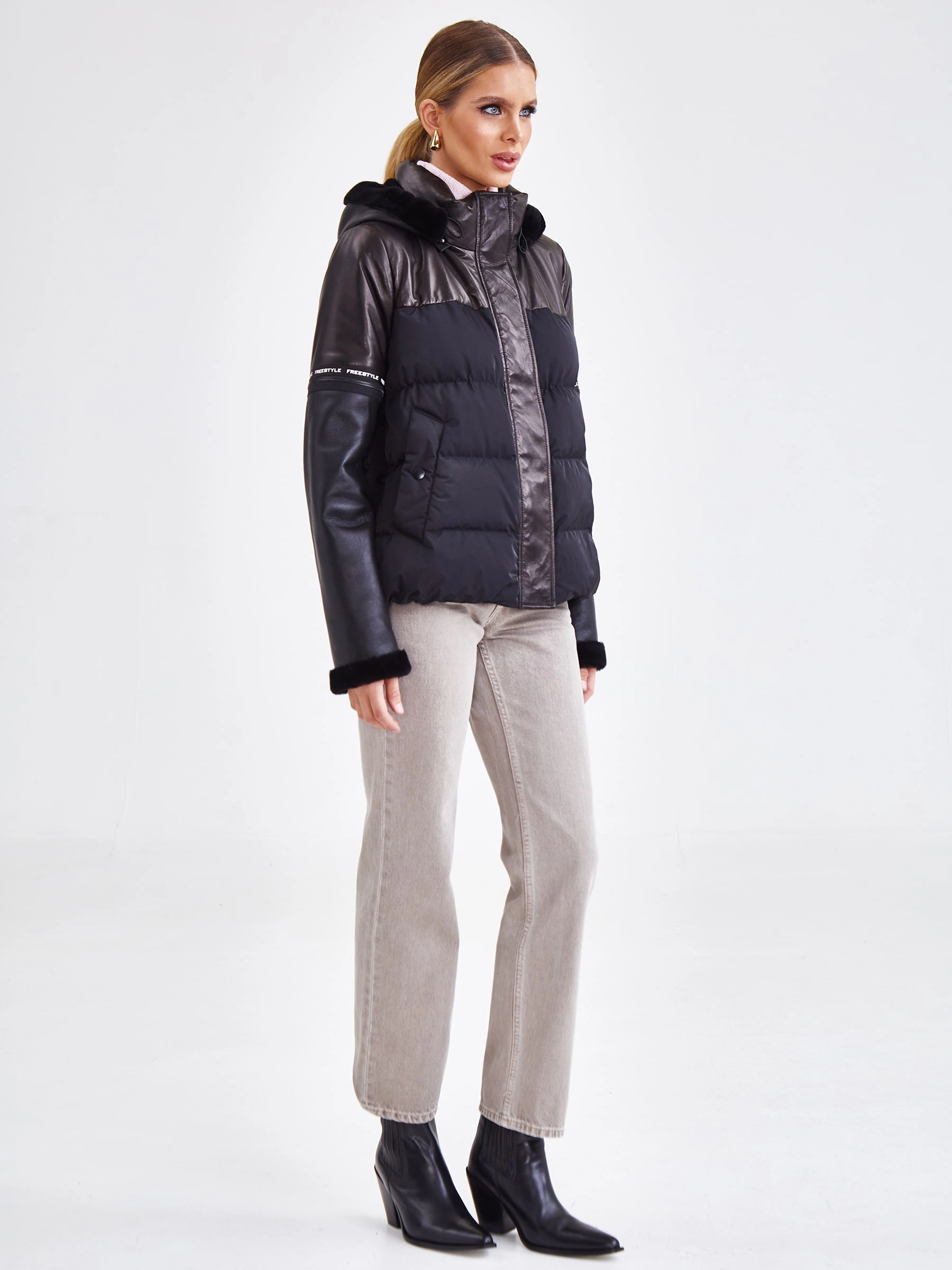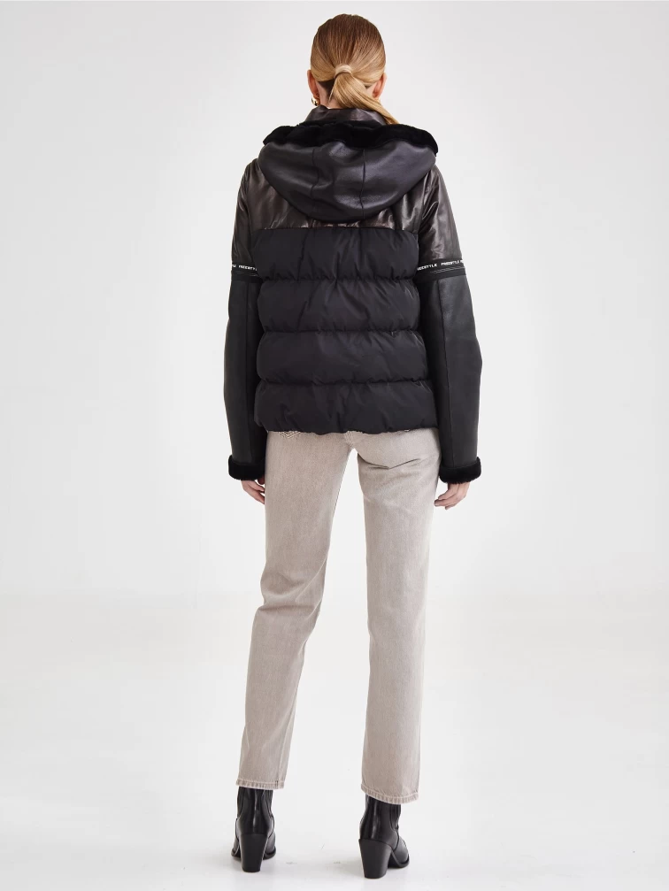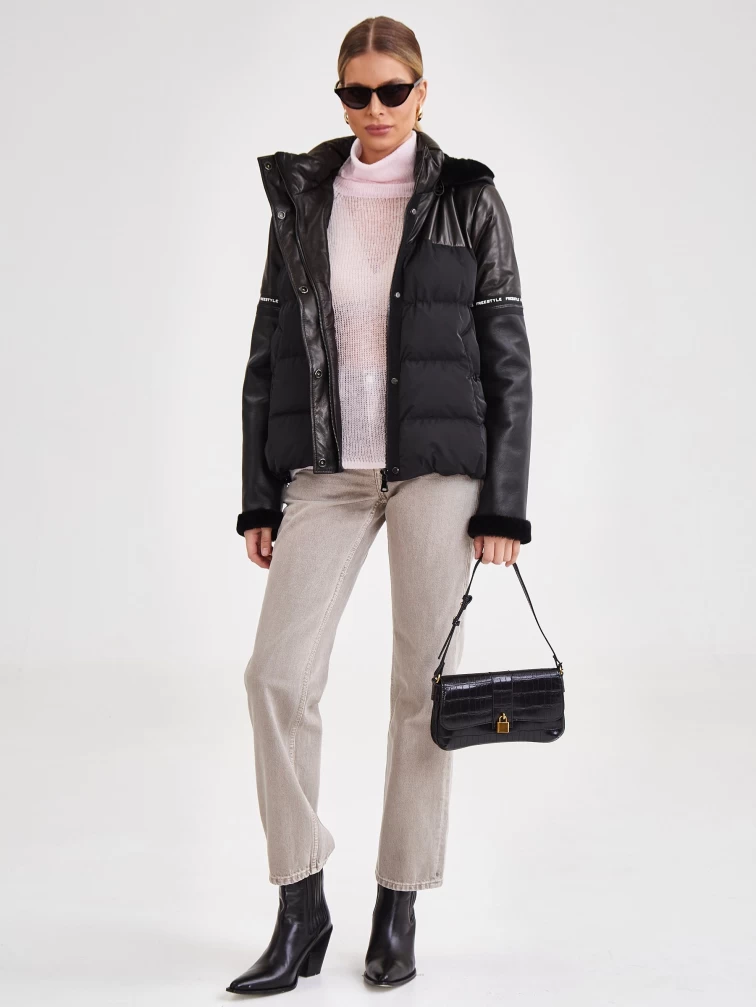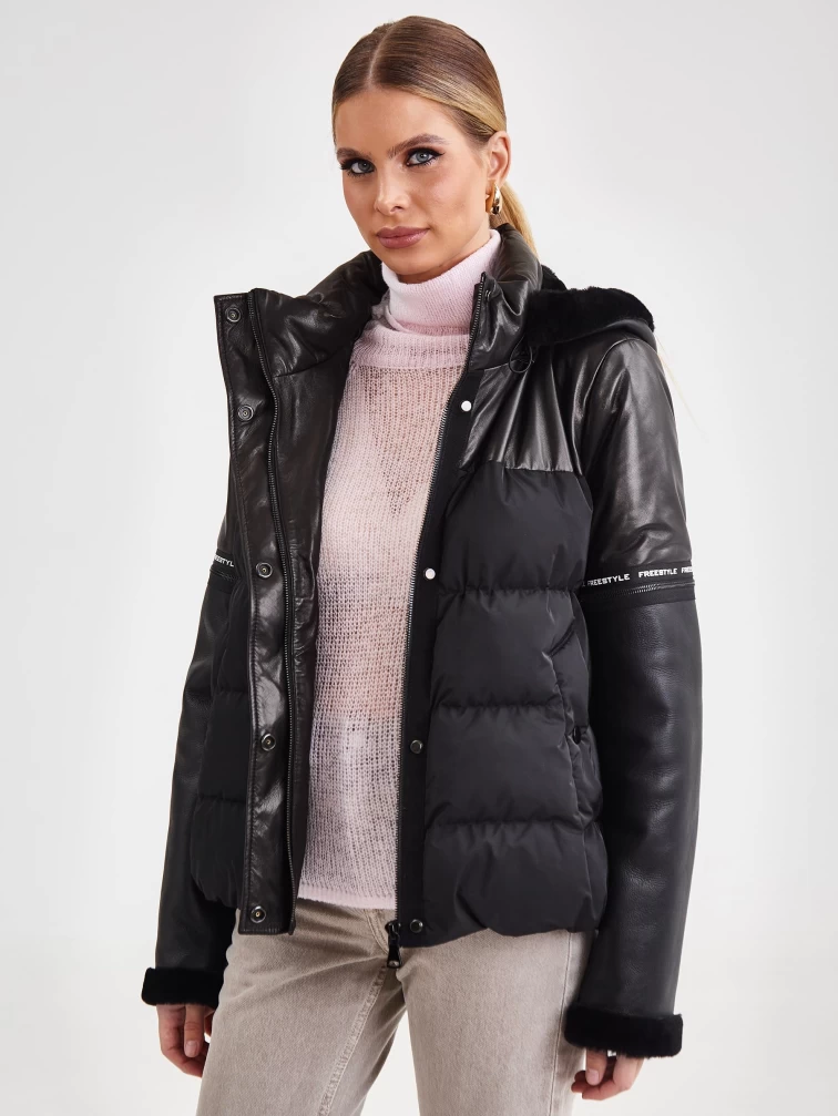 Короткий женский кожаный пуховик комбинированный с капюшоном премиум класса 3030, черный, размер 44, артикул 25340