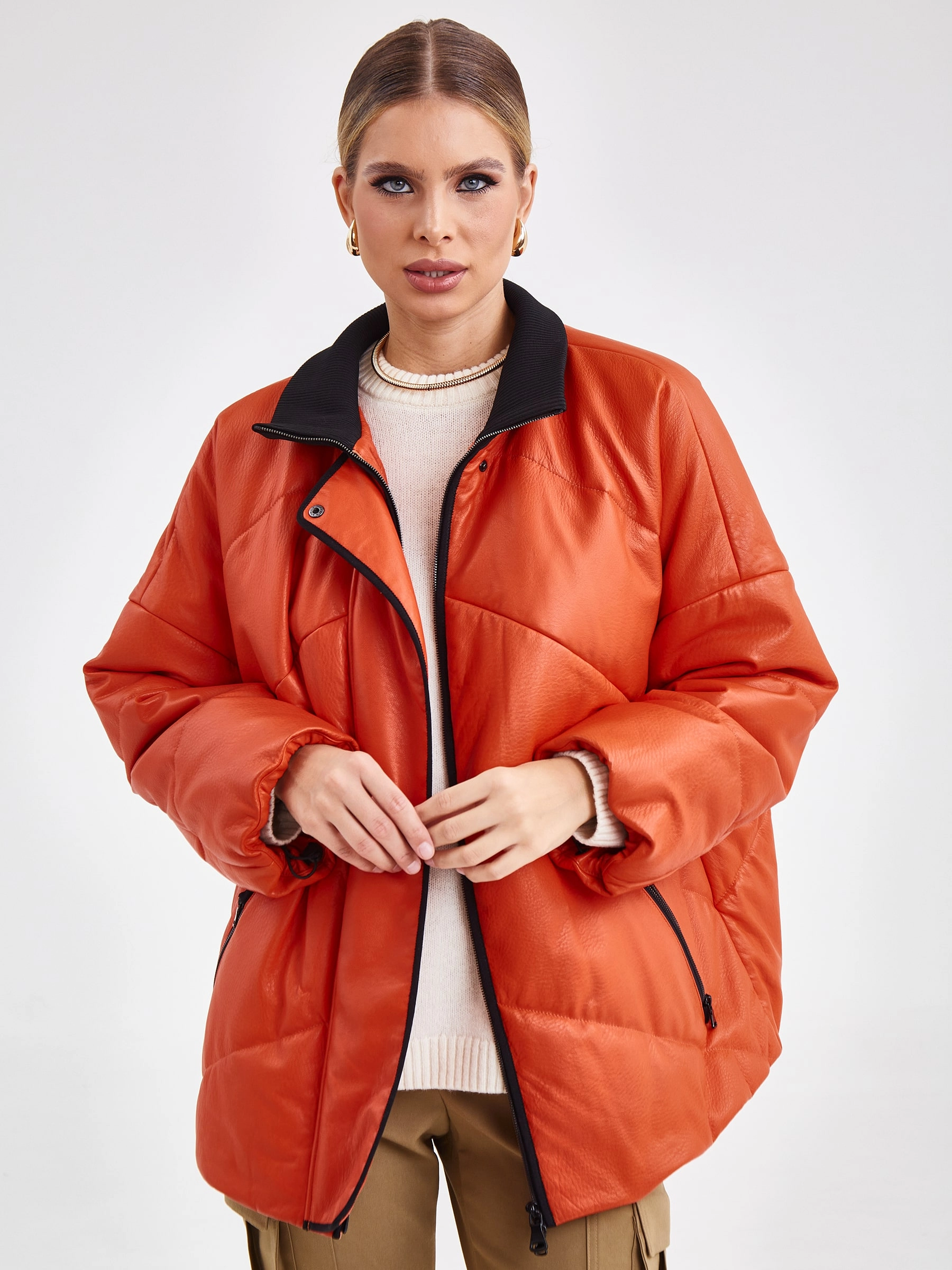 Женский кожаный пуховик оверсайз премиум класса 3022, оранжевый, размер 44, артикул 25380
