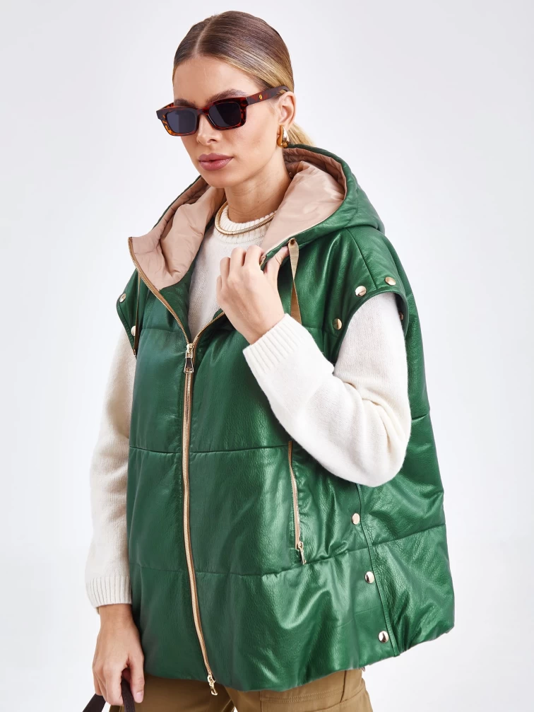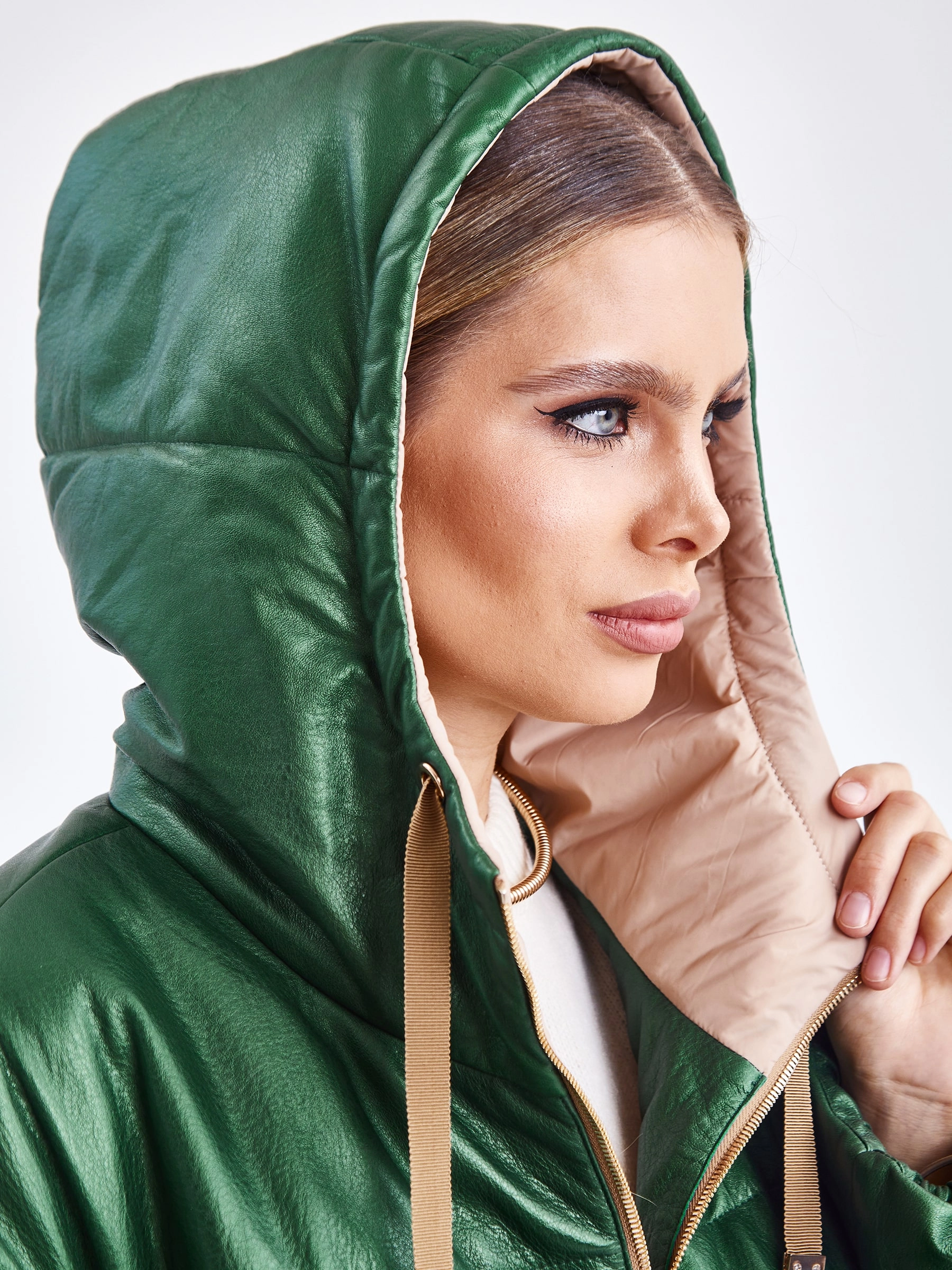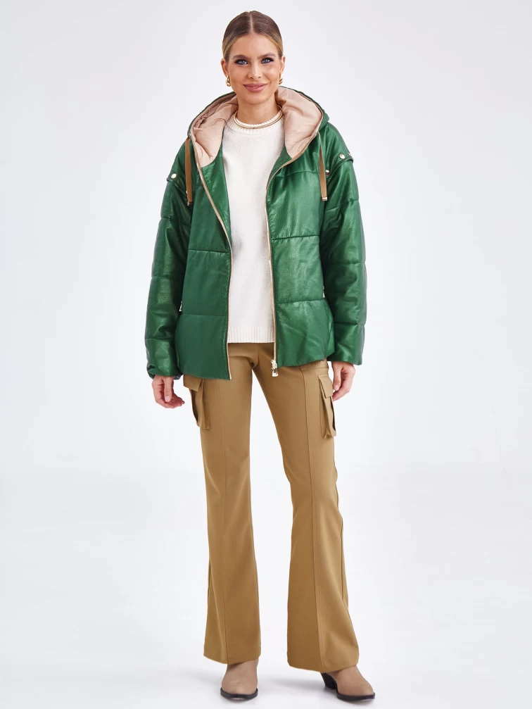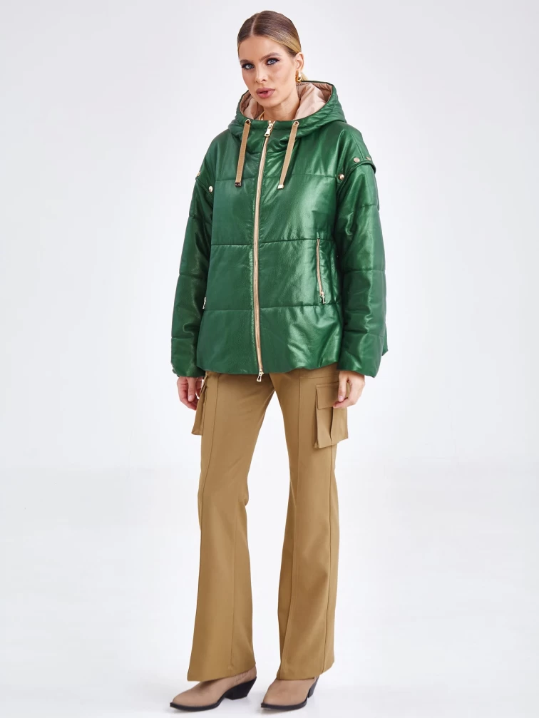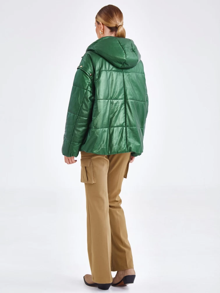 Зеленый пуховик два в одном, с глубоким капюшоном выполнили из натуральной кожи. Премиум класс. Сободный силуэт. Рукава отстегиваются, что позволяет изделие носить как жилетку. Куртку утеплили немецким синтепоном Френденберг. Отличная теплоизоляция, превосходная парапроницаемость, простой уход.