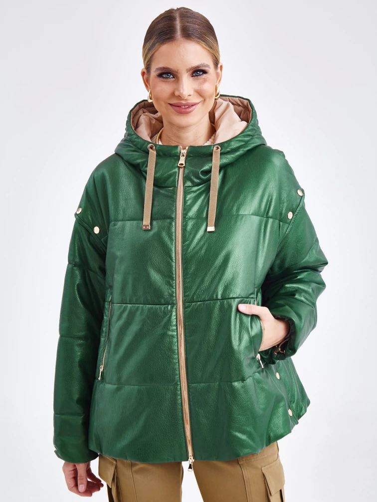 Товар короткий женский кожаный пуховик оверсайз с капюшоном премиум класса 3023, зеленый, размер 52, артикул 25400 выполнен из натуральной кожи с застежкой молния. Рассчитан на сезон: демисезон. Длина изделия 51-74 см, силуэт свободный.