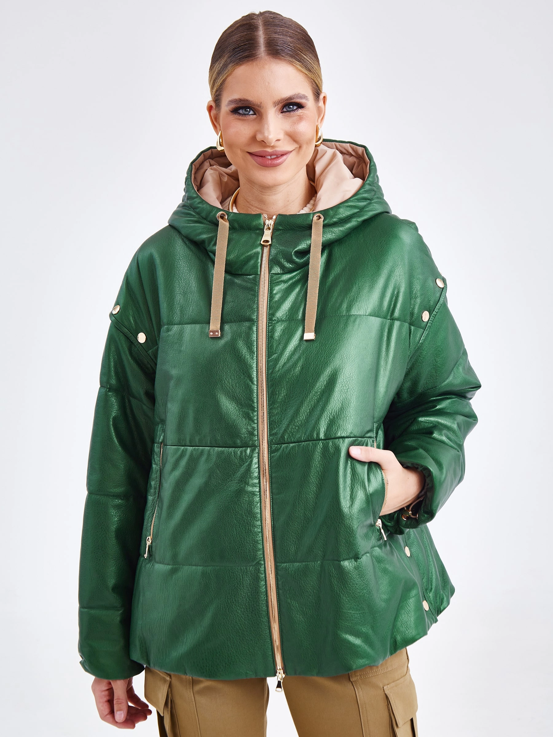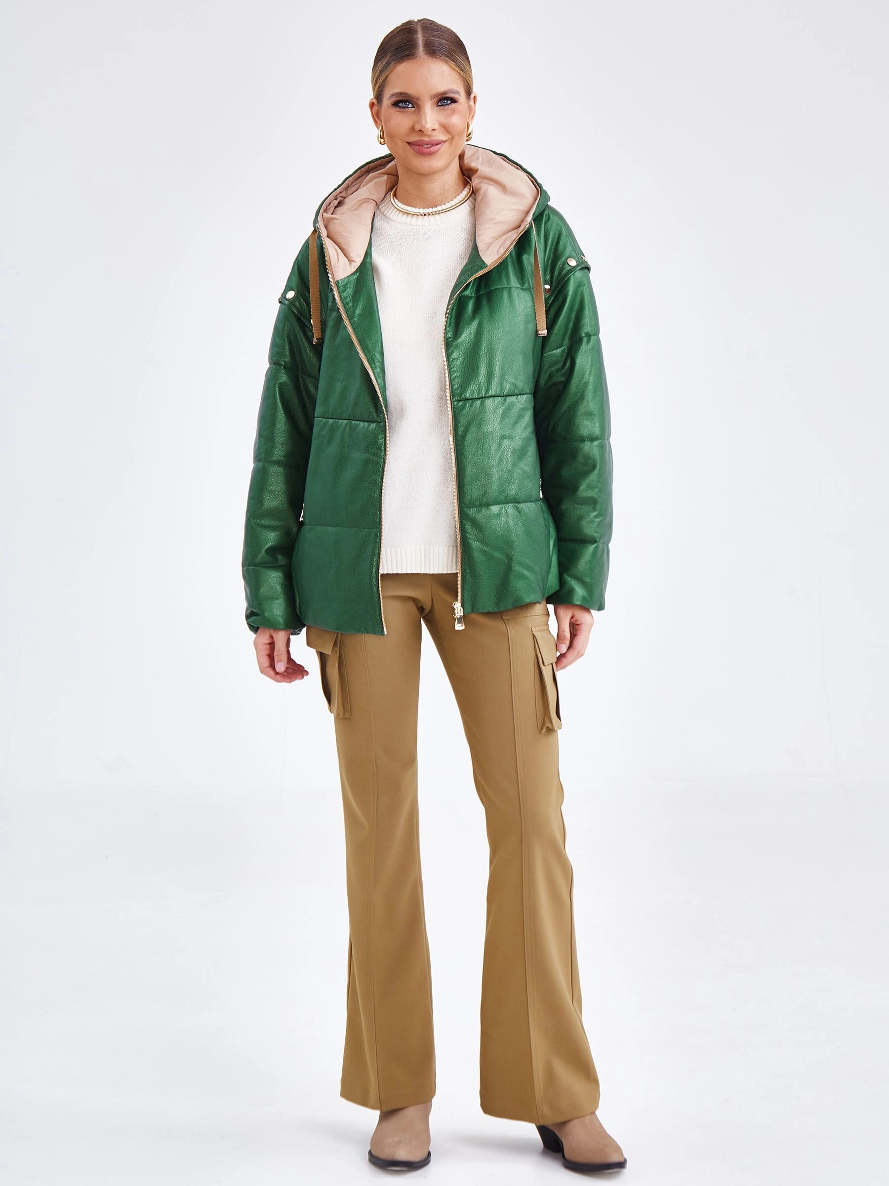 Короткий женский кожаный пуховик оверсайз с капюшоном премиум класса 3023, зеленый, размер 52, артикул 25400