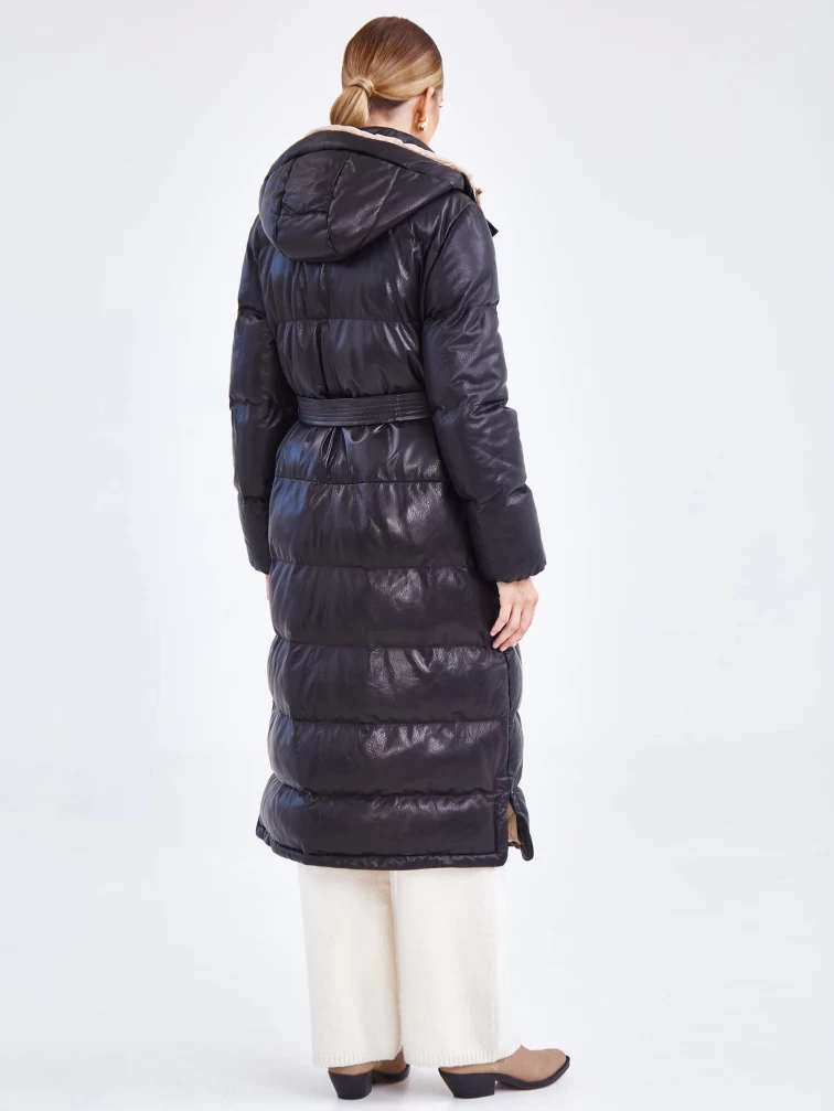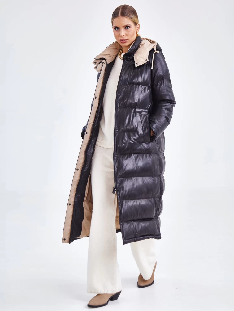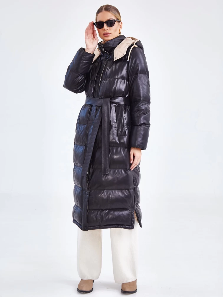 Длинное стеганное пальто выполнили из черной кожи Премиум класса. Все очень выдержано и лаконично. Прямой крой, застежка-молния дополнительно закрывающаяся клапаном. Внутренний шнурок с фиксатором, продетый в кулиску на талии, помогает отрегулировать силуэт. За дополнительный комфорт в капризную погоду- отвечает съемный капюшон с высокой стойкой. Утеплитель-немецкий синтепон Френденберг. Отличная теплоизоляция, превосходная парапроницаемость, простой уход. Только комфорт.