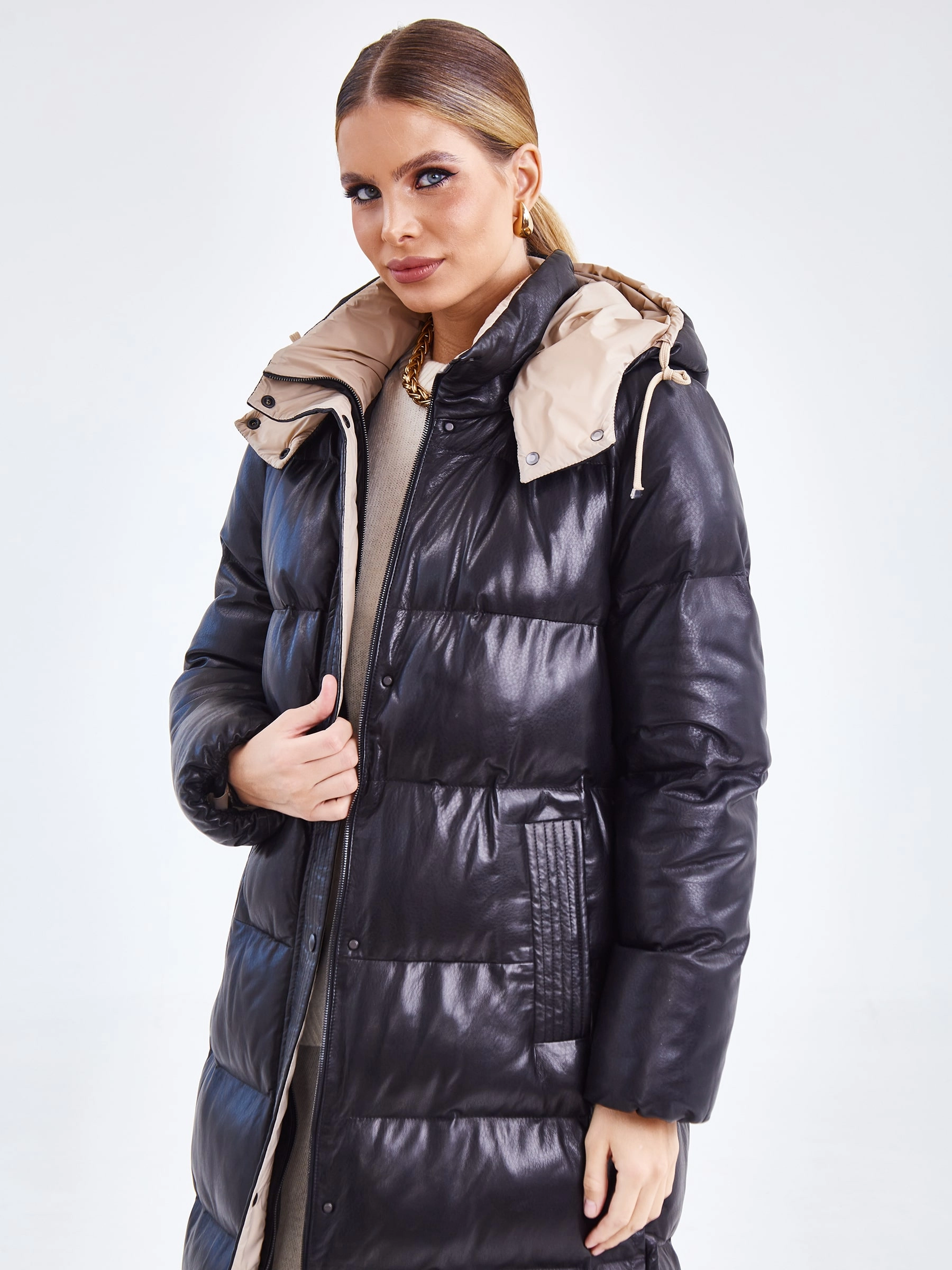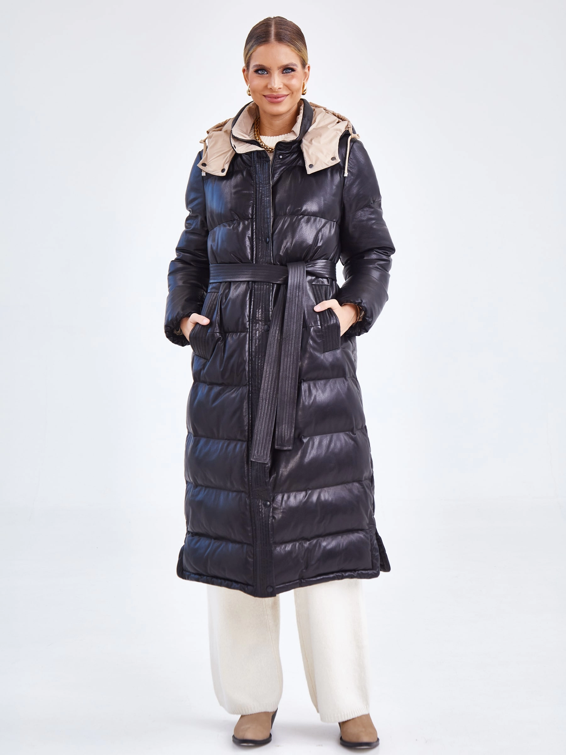Женский длинный кожаный пуховик с капюшоном премиум класса 3024, черный, размер 44, артикул 25360