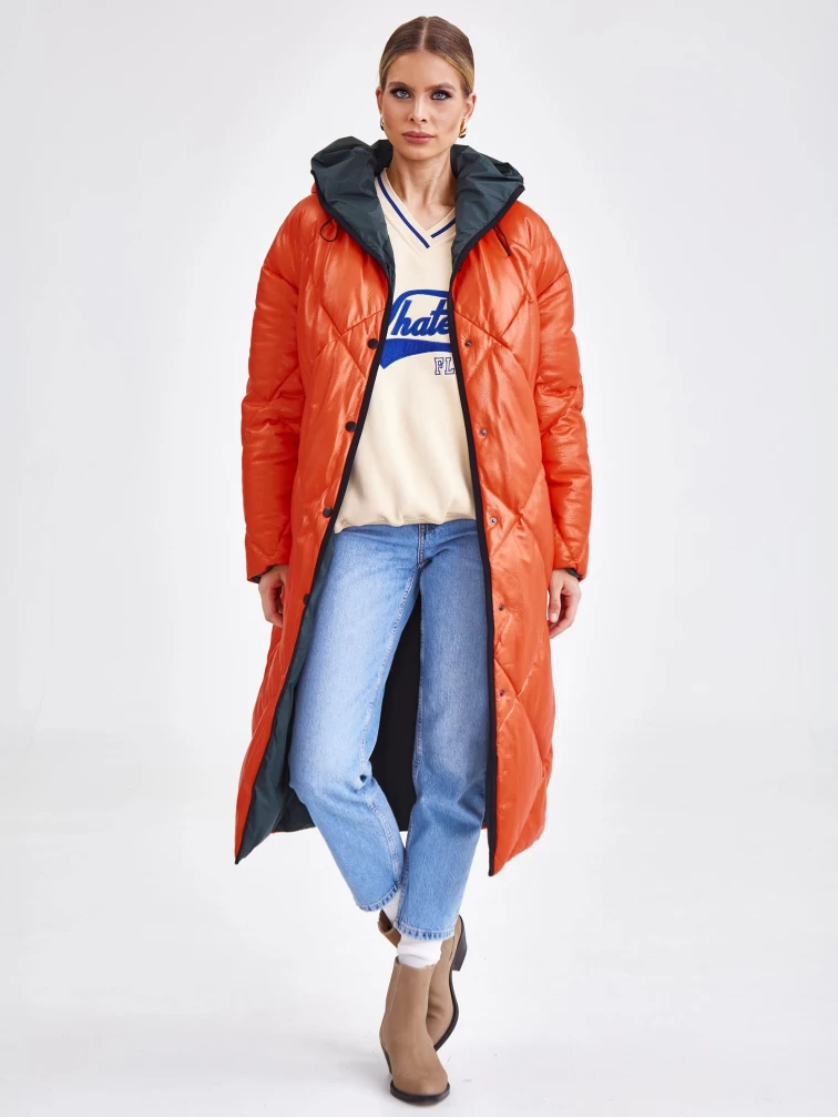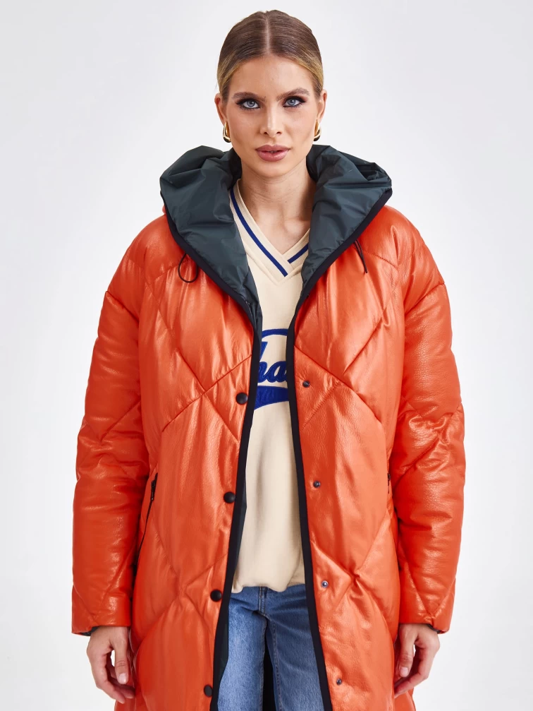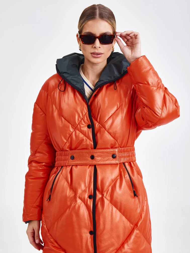 Товар длинный женский кожаный пуховик с капюшоном премиум класса 3026, оранжевый, размер 50, артикул 25350 выполнен из натуральной кожи с застежкой кнопки. Рассчитан на сезон: осень-зима. Длина изделия свыше 90 см, силуэт прямой.