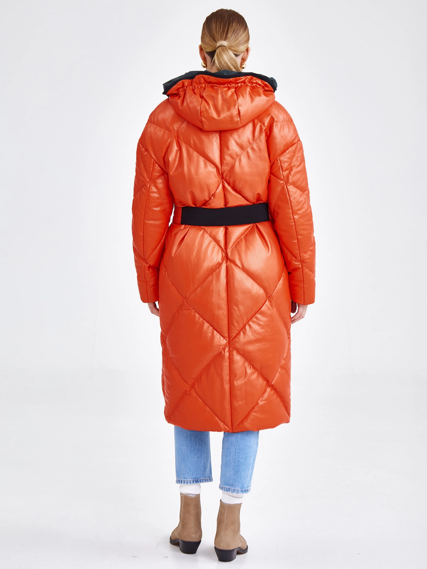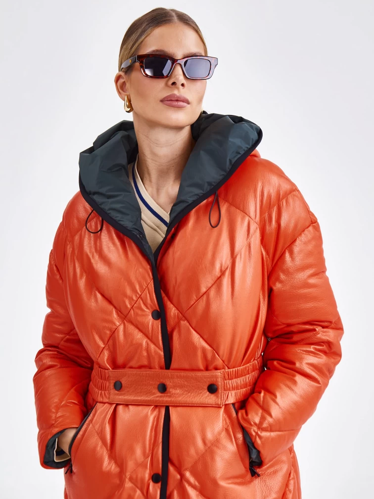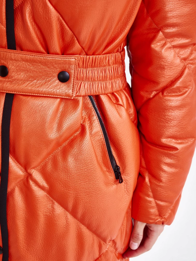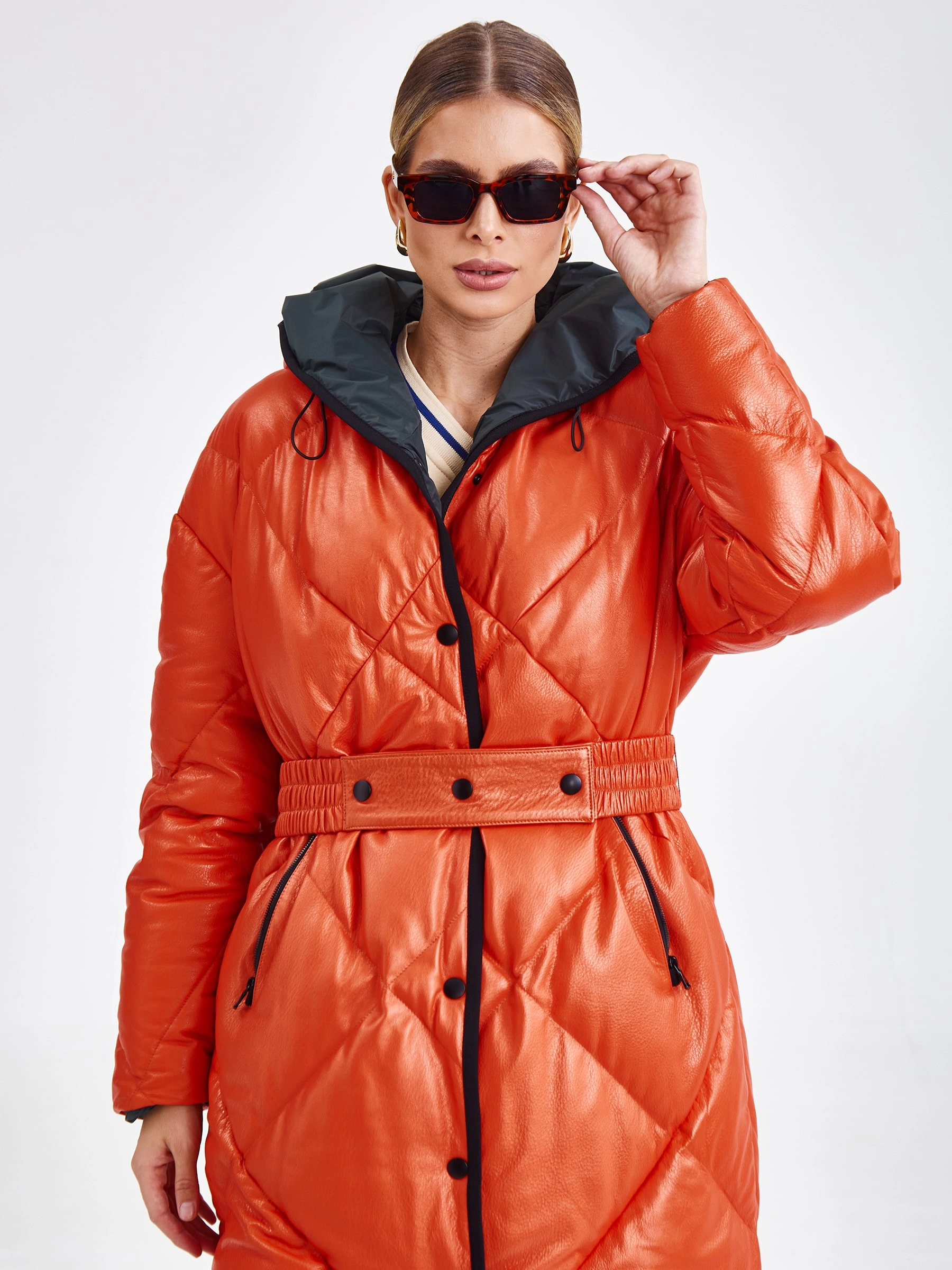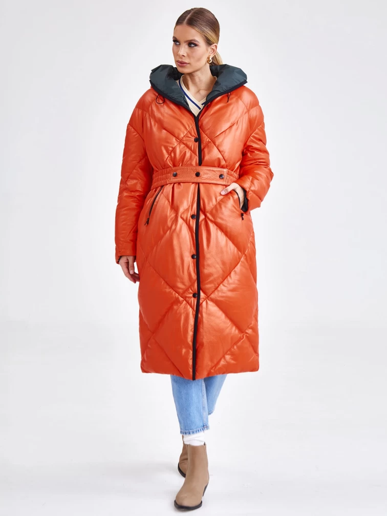 Длинный женский кожаный пуховик с капюшоном премиум класса 3026, оранжевый, размер 50, артикул 25350