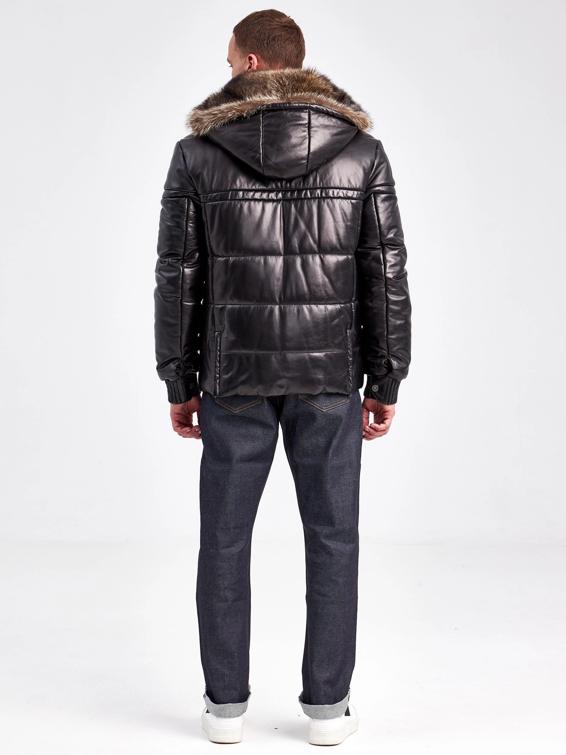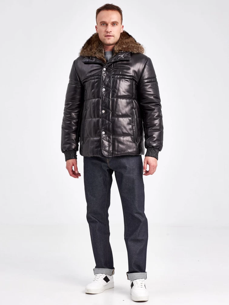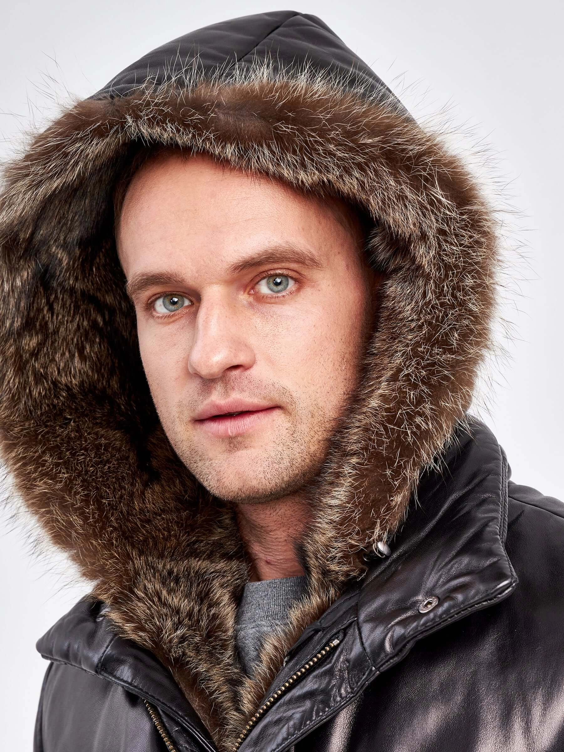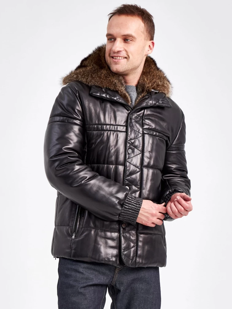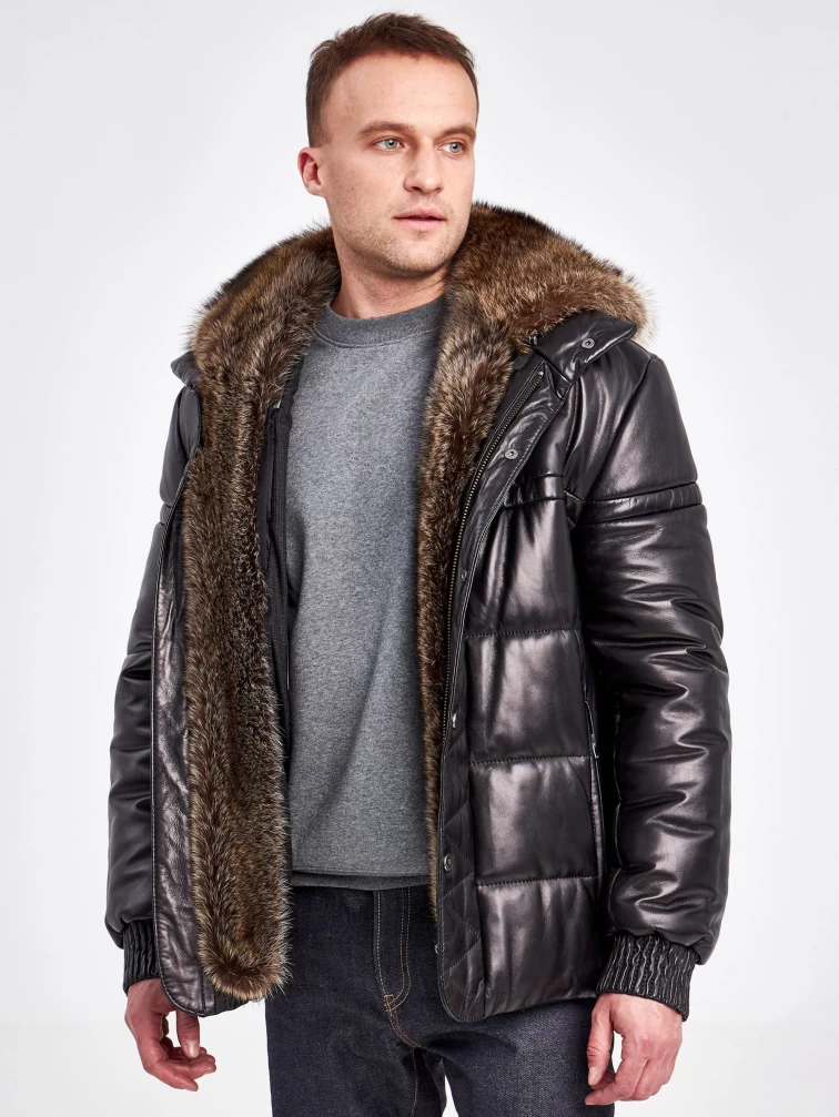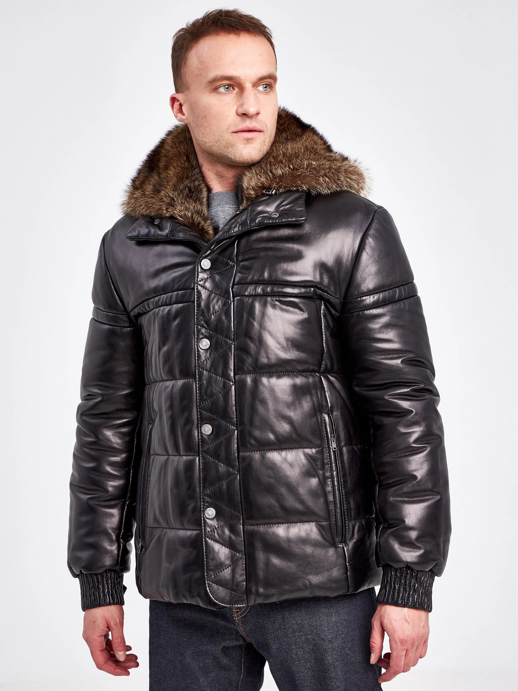 Кожаный мужской зимний пуховик с капюшоном и мехом енота 5468, черный, размер 46, артикул 40990