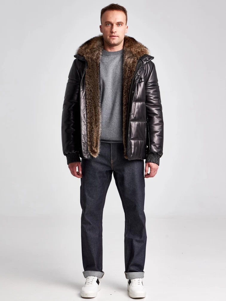 Зимняя куртка премиального качества из натуральной кожи, большим сьемным енотовым капюшоном и отделкой мехом серебристого енота на передней планке.