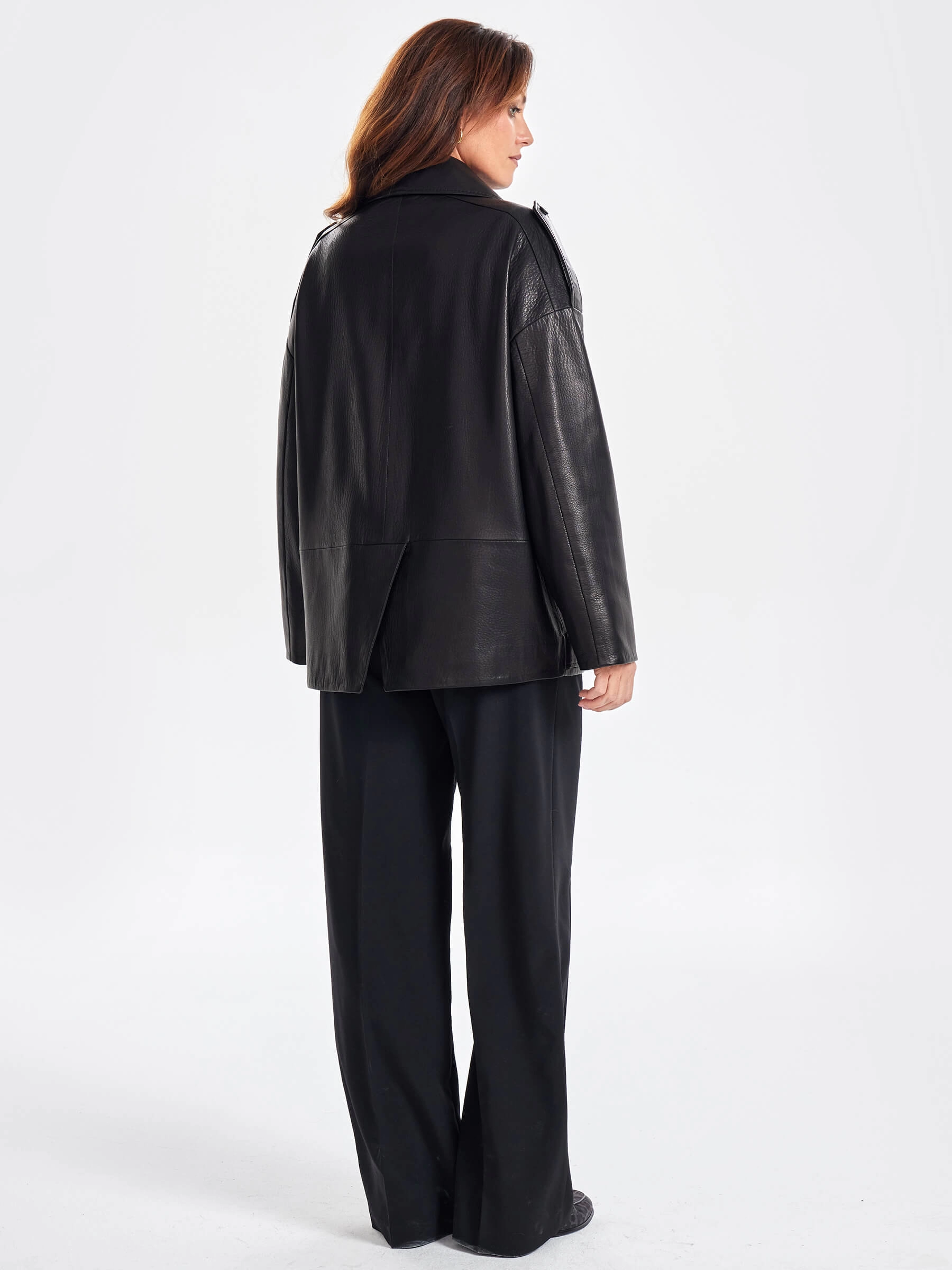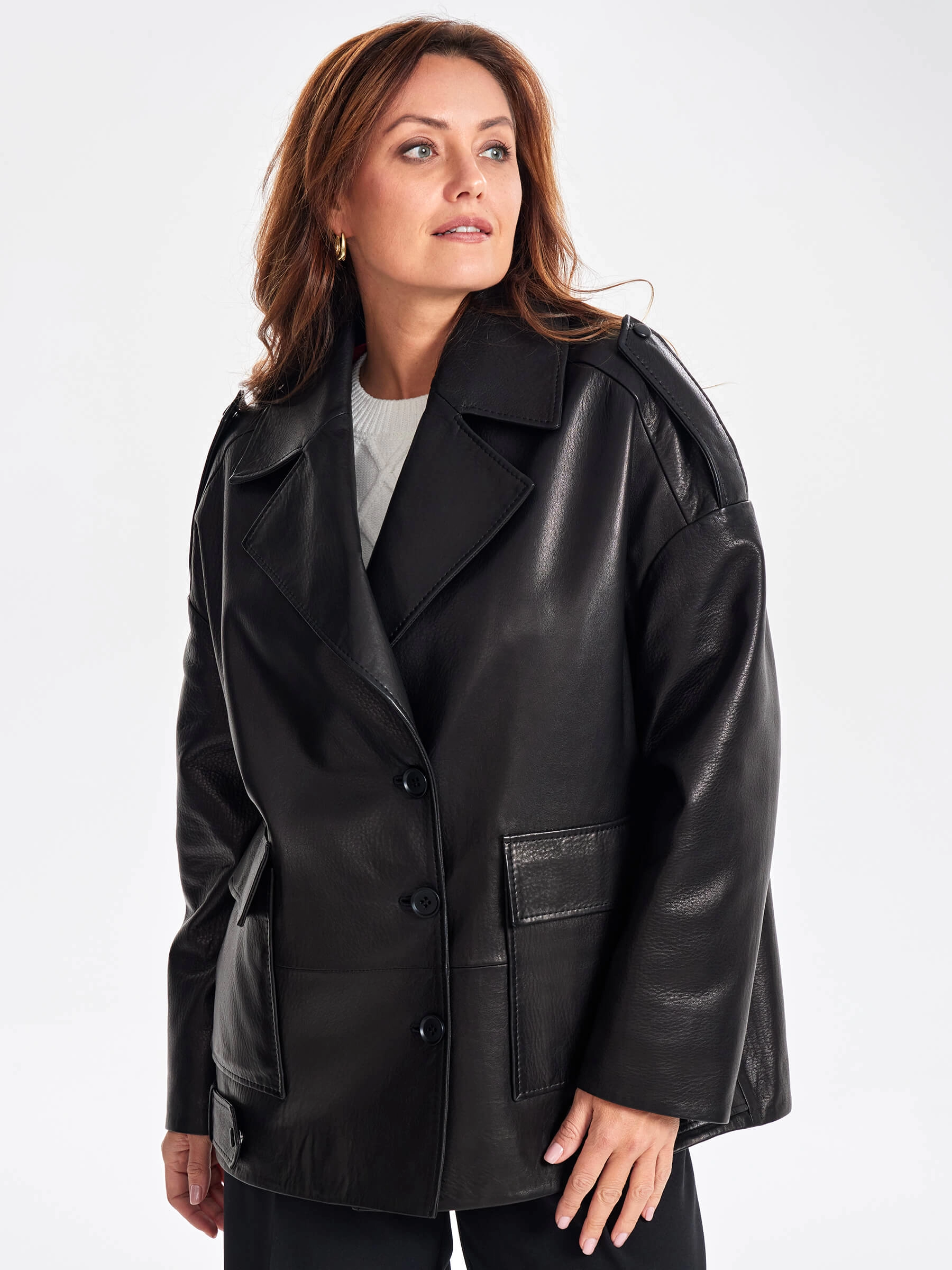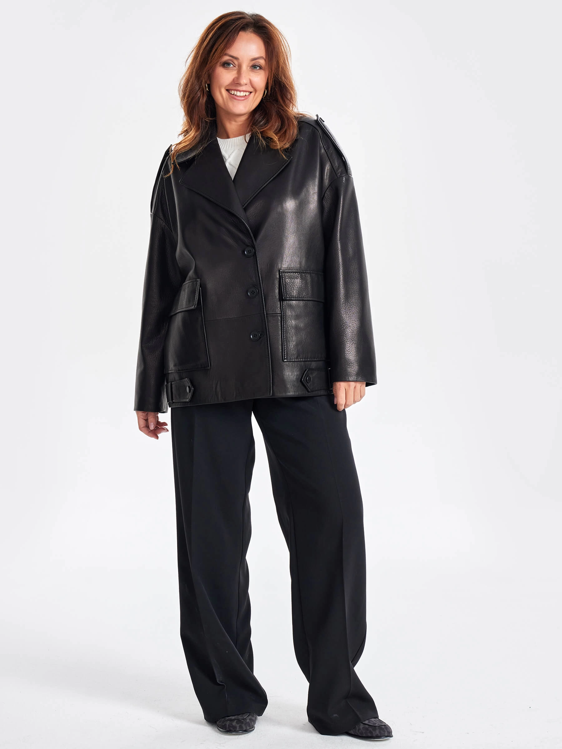 Товар кожаный женский пиджак оверсайз премиум класса 3068, черный, размер 48, артикул 23830 выполнен из натуральной кожи с застежкой пуговицы. Рассчитан на сезон: весна-лето. Длина изделия 73 см, силуэт свободный.