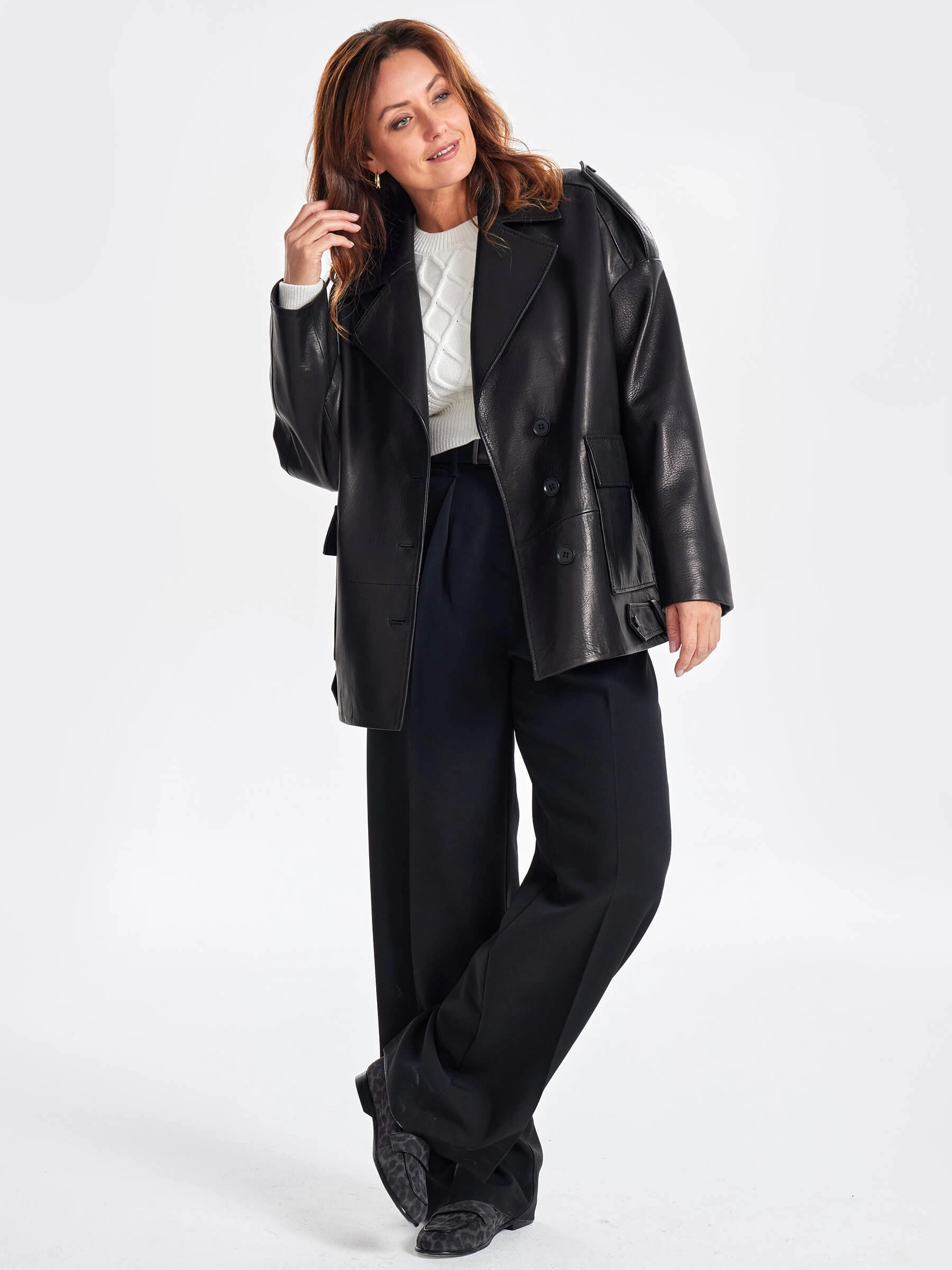 Кожаный женский пиджак оверсайз премиум класса 3068, черный, размер 48, артикул 23830