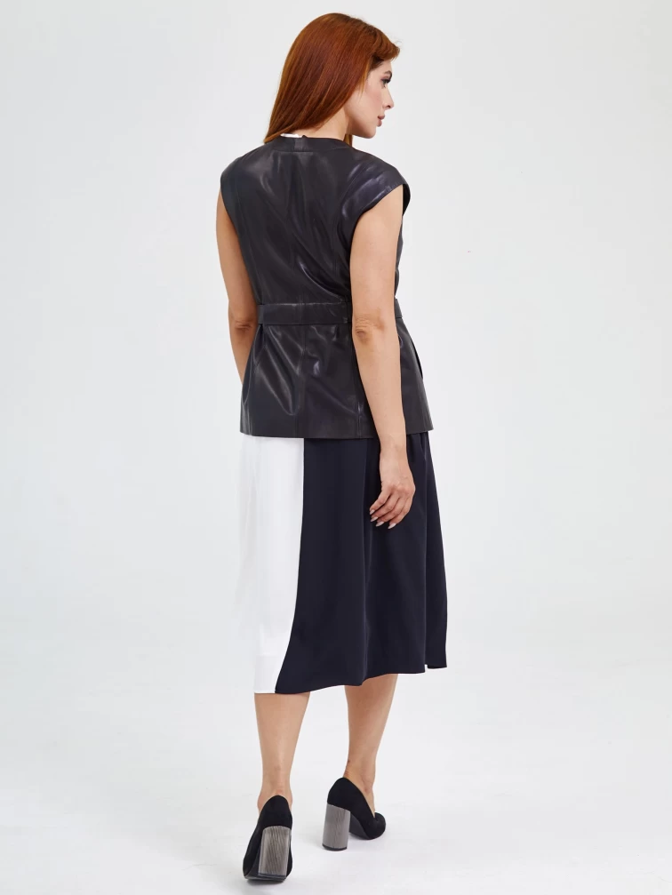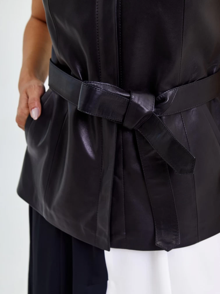 Черный удлиненный кожаный жилет с круглым вырезом и широким поясом удачно дополнит любой образ. Благодаря тщательной выделке кожа получилась очень мягкой и пластичной, поэтому изделие идеально садится по фигуре.