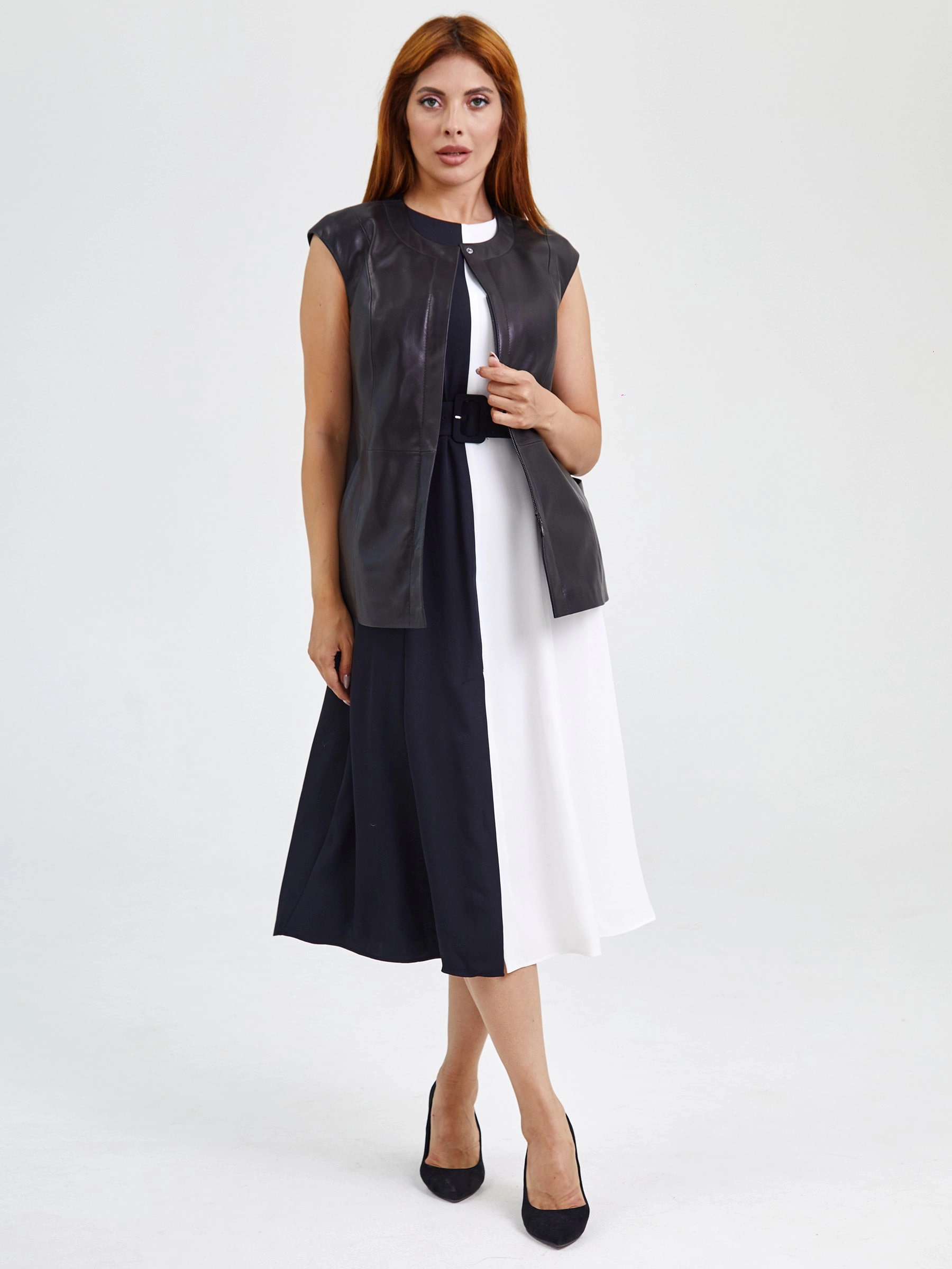 Товар женский жилет из натуральной кожи премиум класса 04, черный, размер 50, артикул 91720 выполнен из натуральной кожи с застежкой молния. Рассчитан на сезон: демисезон. Длина изделия 65 см, силуэт приталенный .