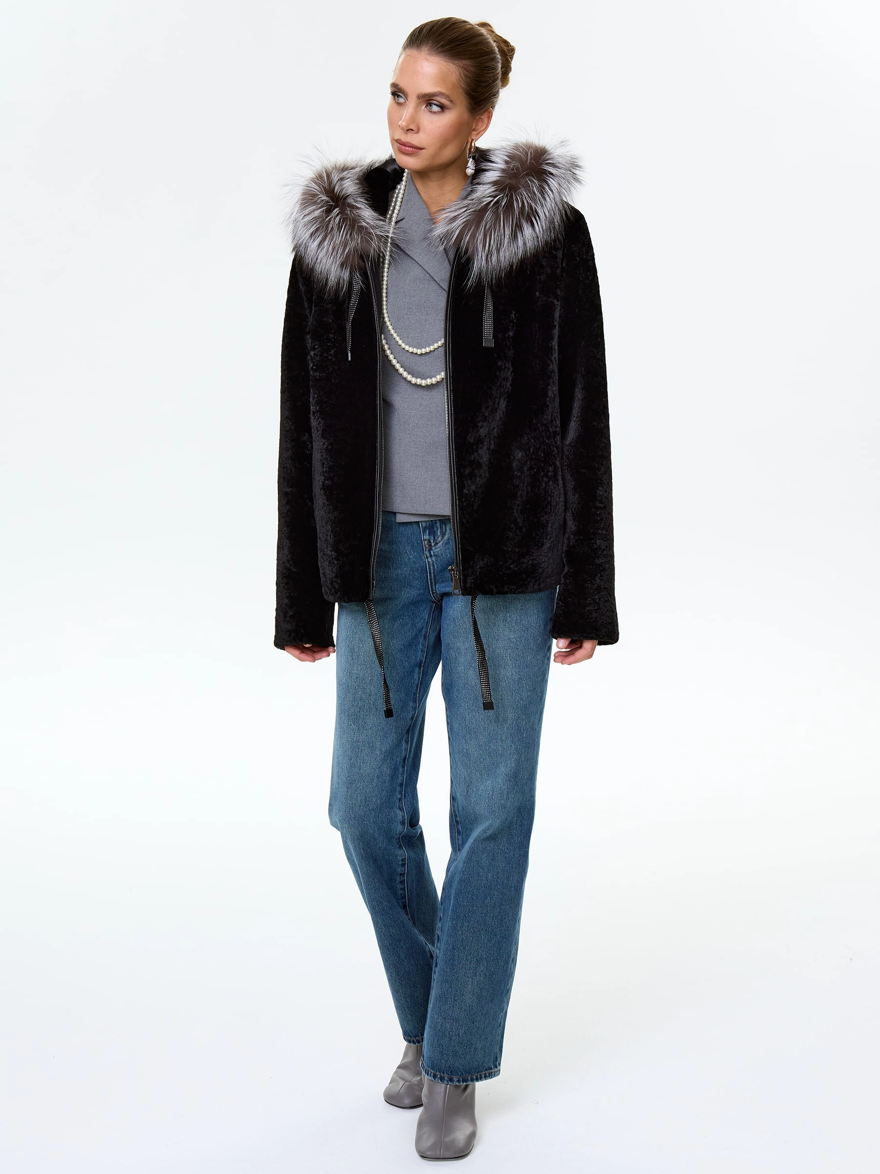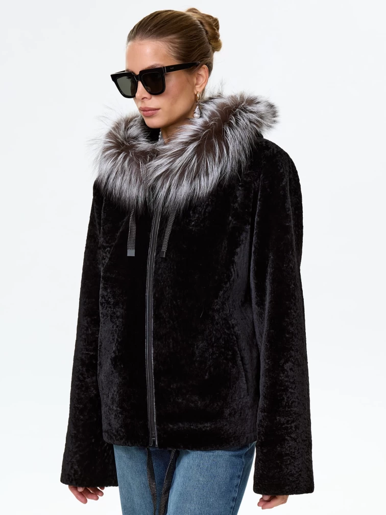 Короткая дубленка из астрагана с капюшоном и мехом песца для женщин 50мех, черная, размер 46, артикул 17570