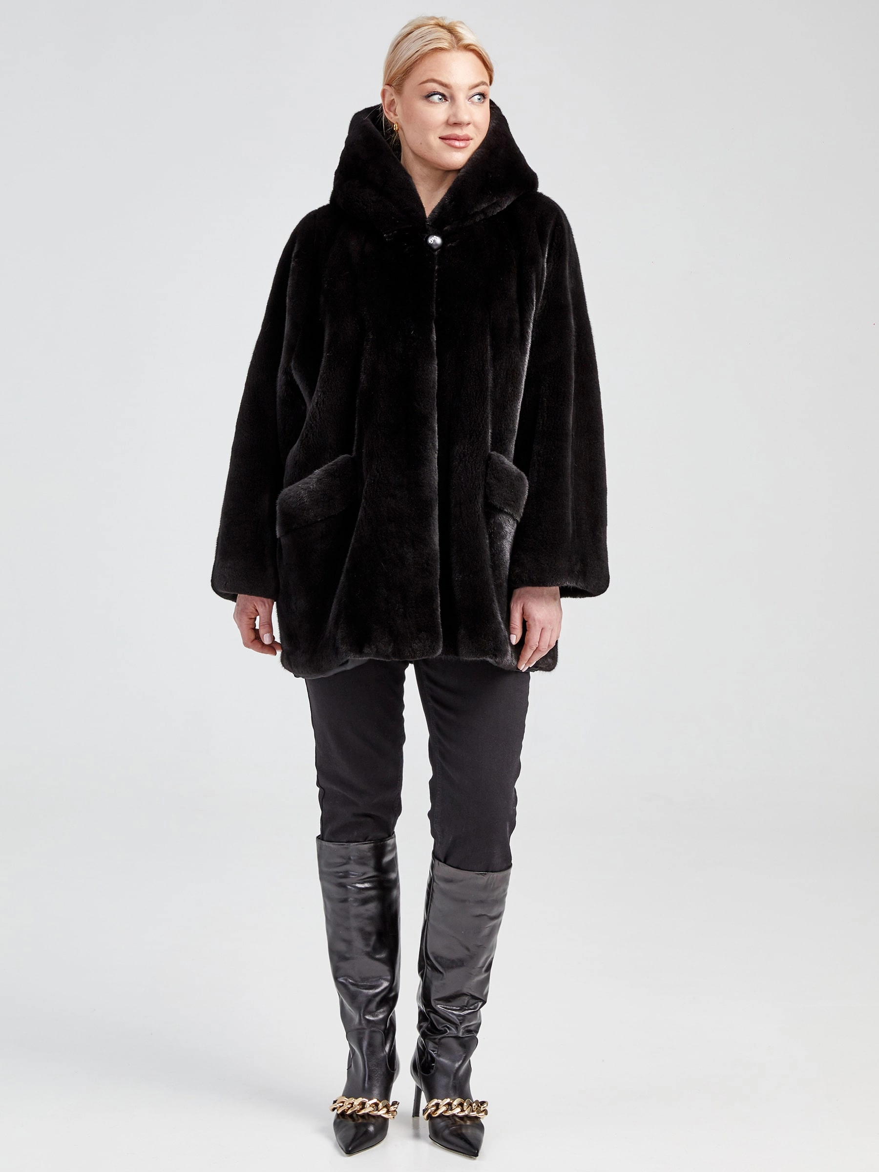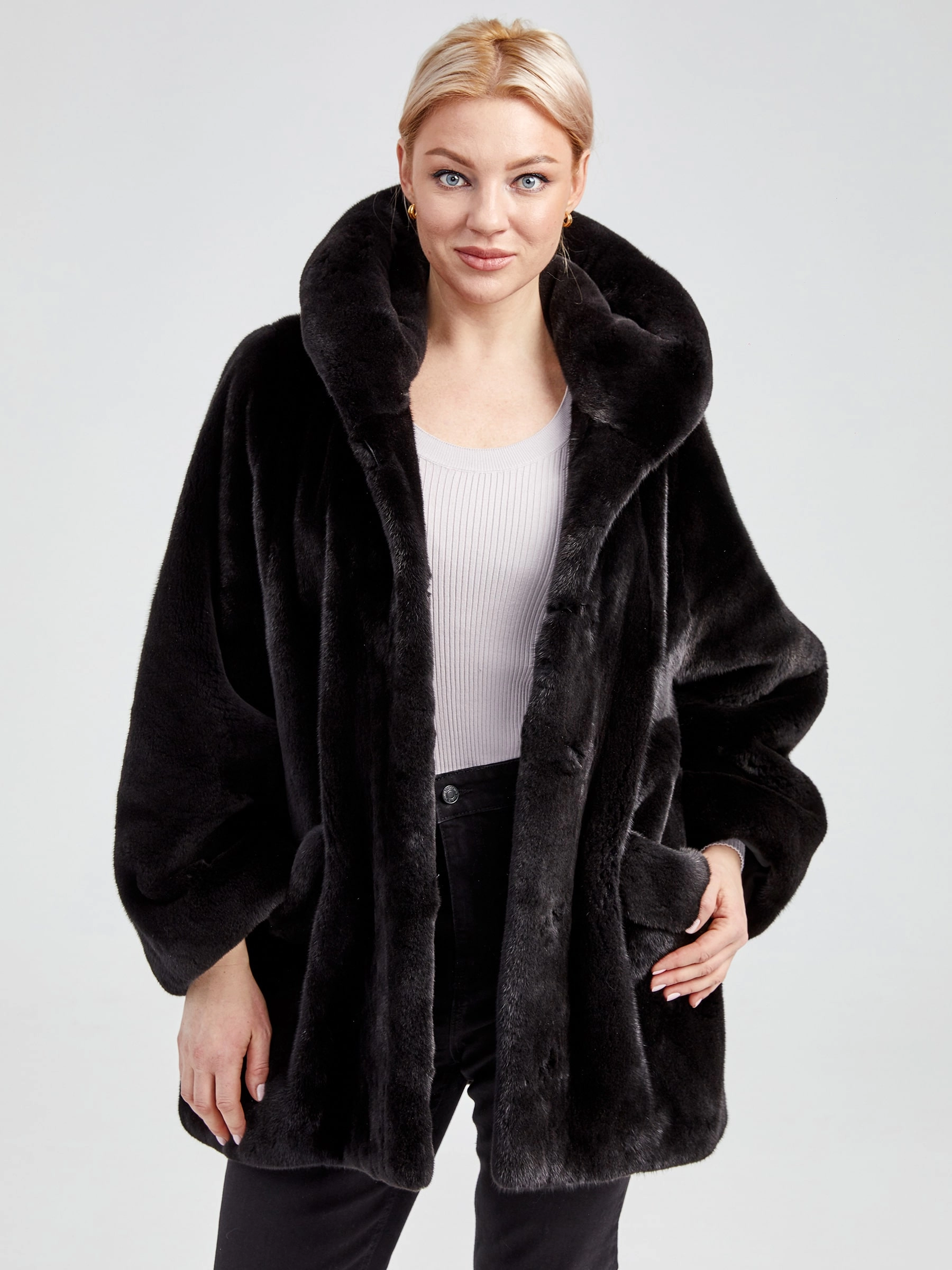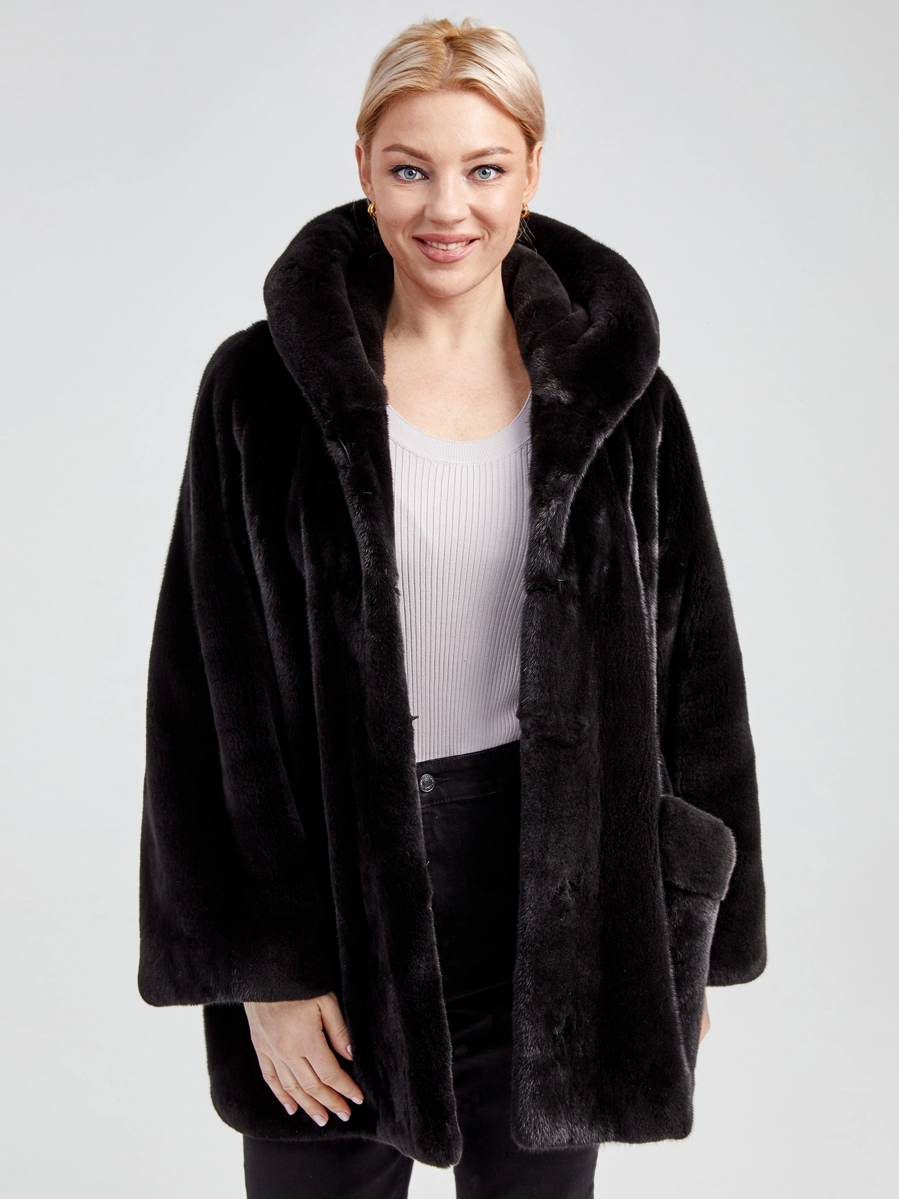 Женская норковая шуба автоледи с капюшоном премиум класса 20701(к), черная, размер 44, артикул 33020