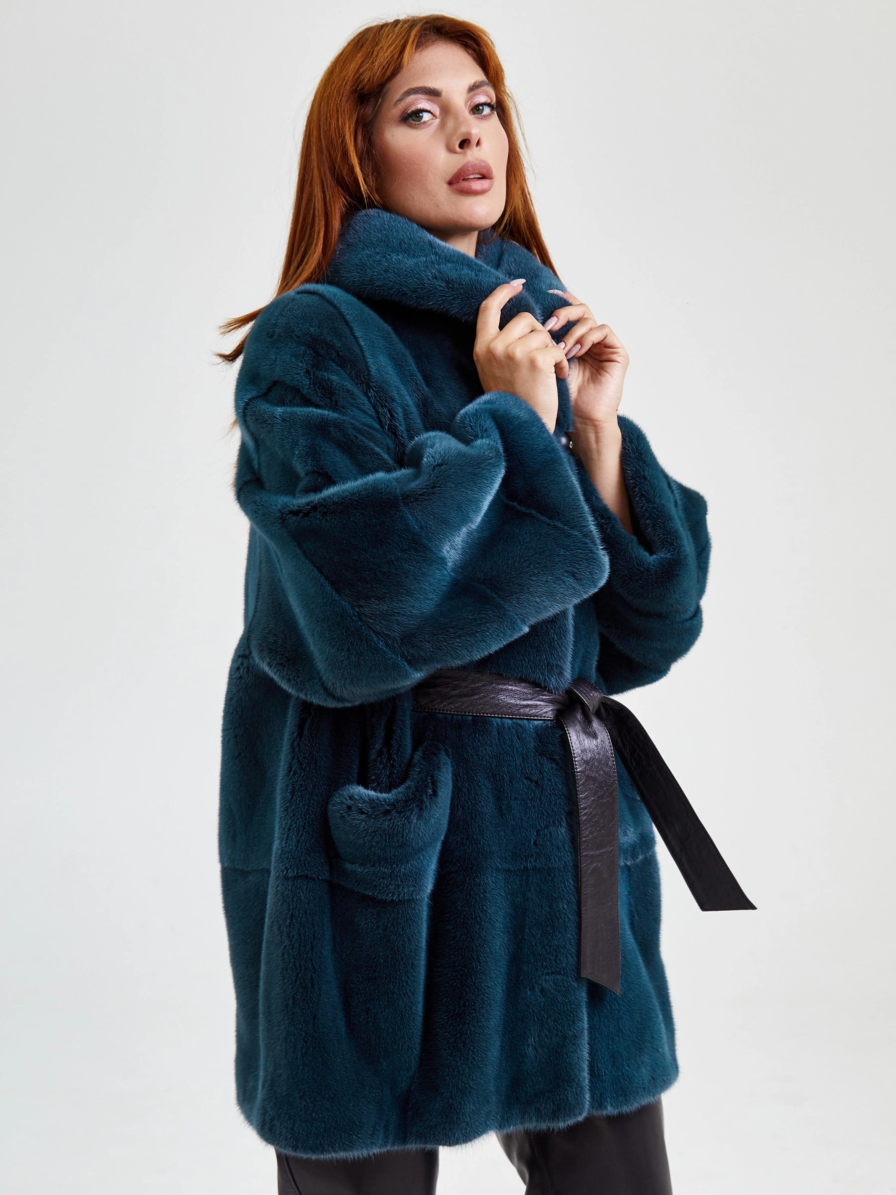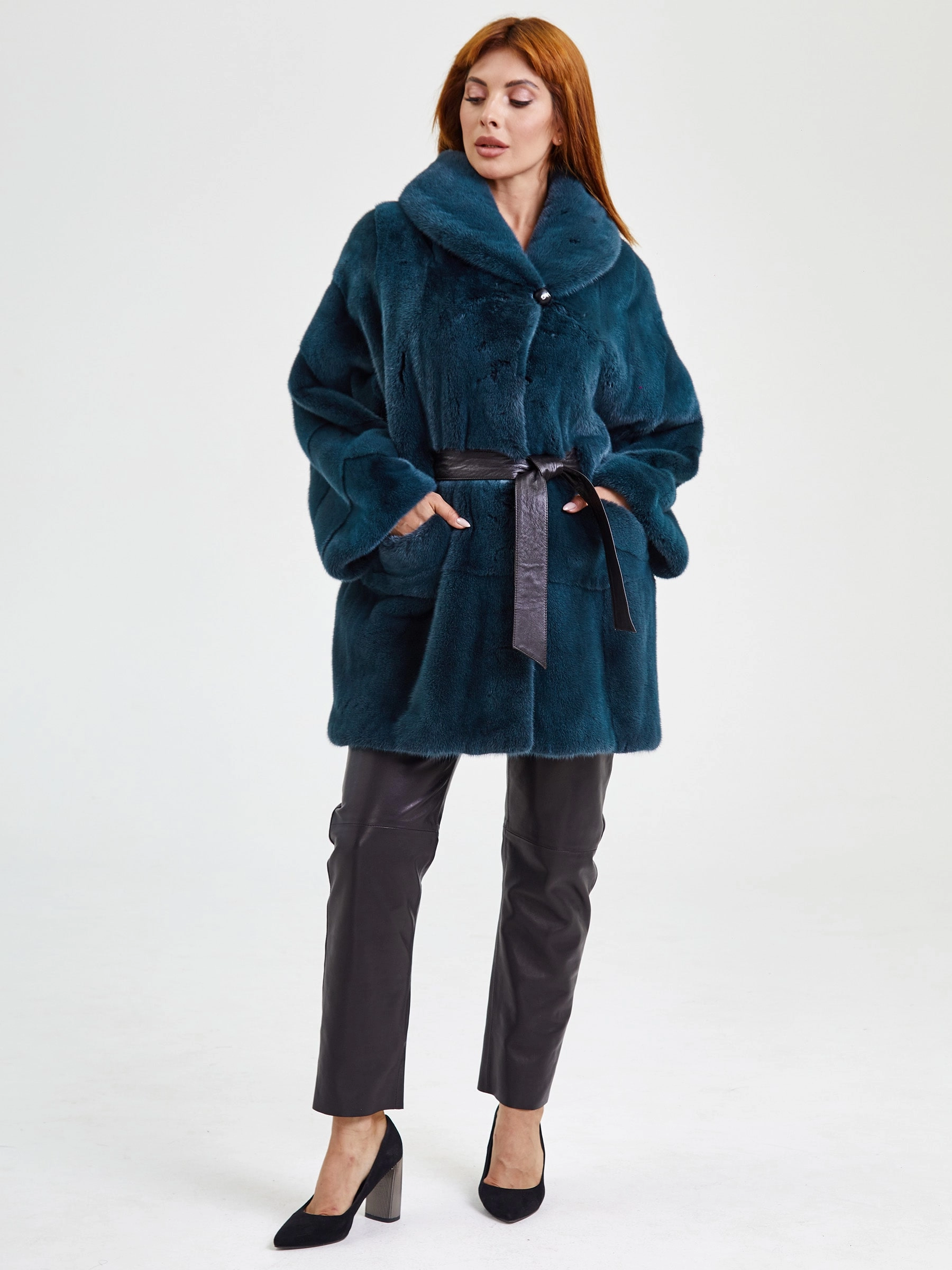 Шуба из меха норки с поясом для женщин 20701(в), зеленая, размер 44, артикул 33050