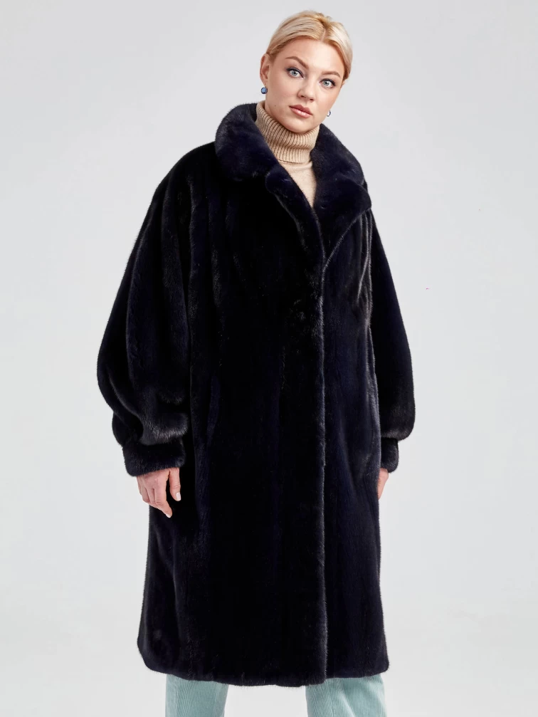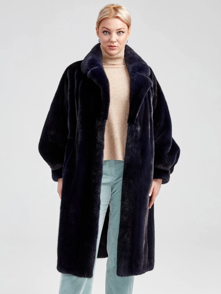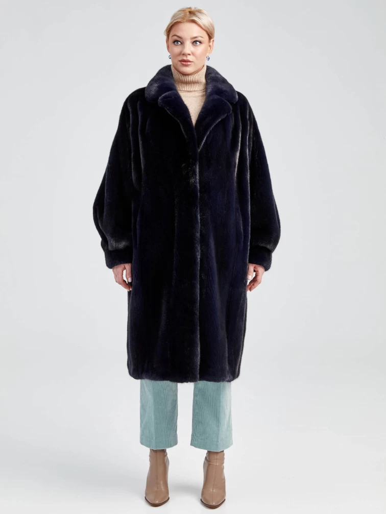 Товар шуба из меха норки женская 21655(ав), синий, размер 48, артикул 33010 выполнен из норка крашенной с застежкой клипсы. Рассчитан на сезон: осень-зима. Длина изделия свыше 90 см, силуэт свободный.