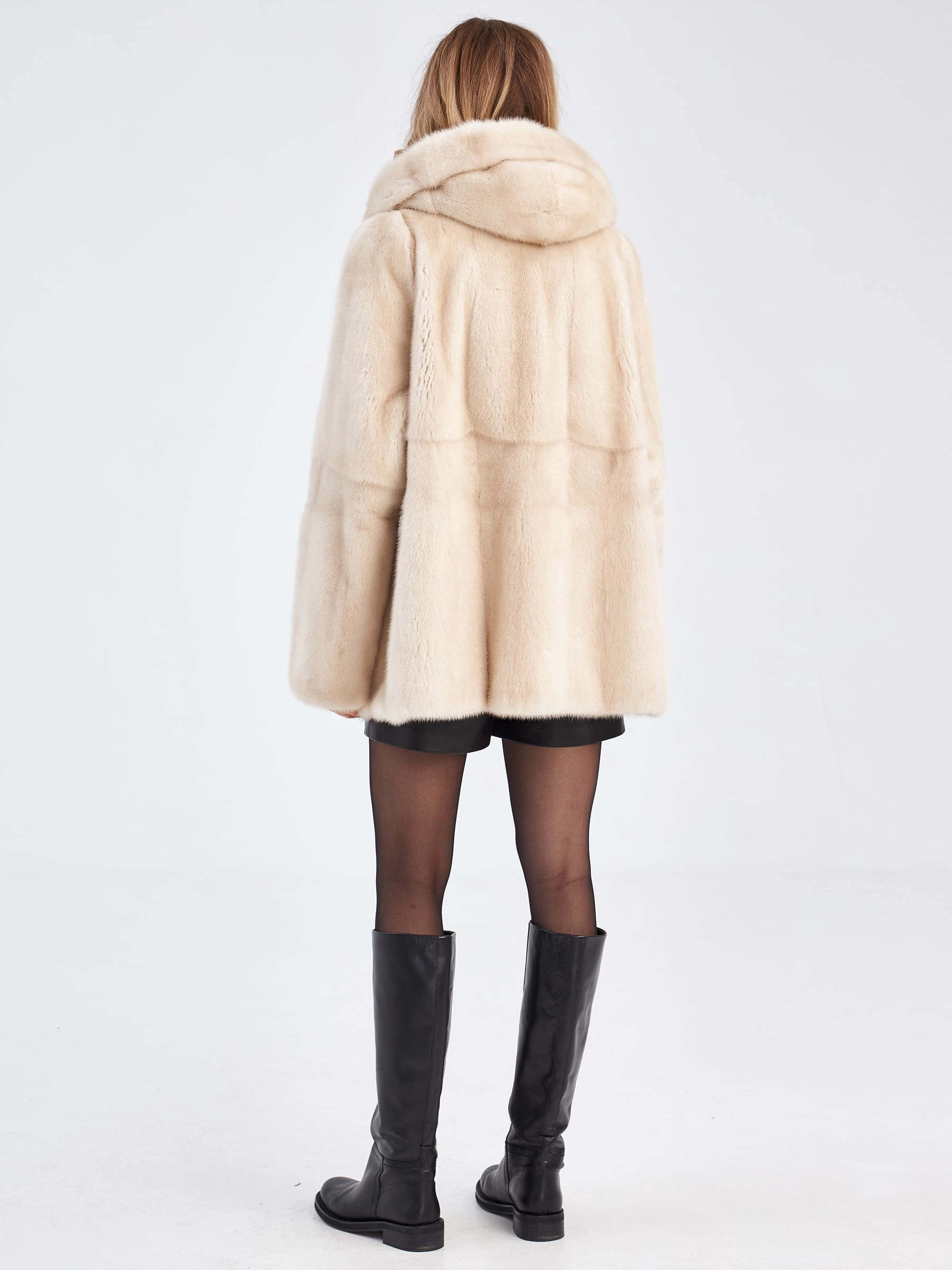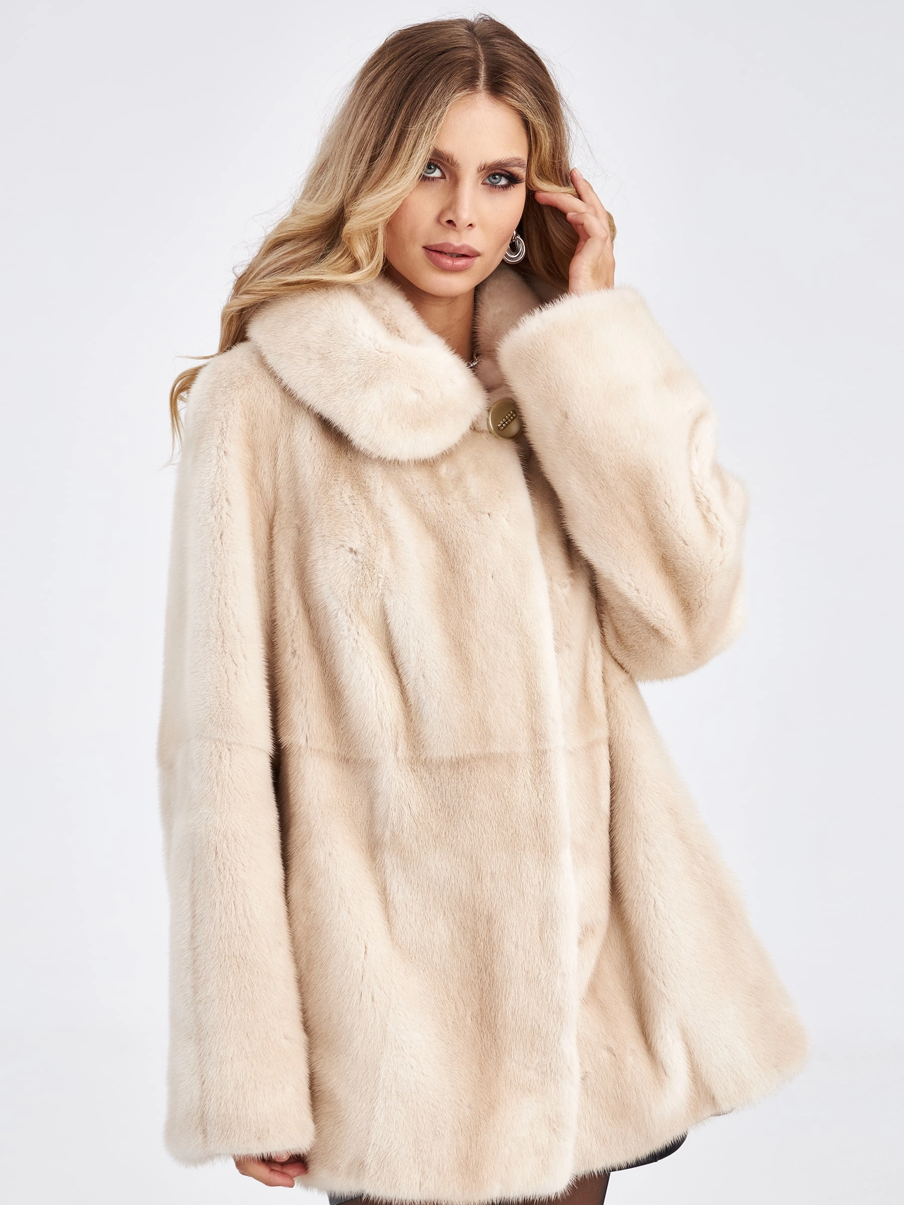 Легкая и невероятно комфортная куртка автоледи из благородного меха норки серо-голубого цвета с густым плотным ворсом, который надежно сохраняет тепло даже в самую холодную зиму: модель классического прямого кроя длиной 74 см, выполненная в горизонтальной раскладке меха с фиксацией на клипсы, не сковывает движений и идеально подходит для активной городской жизни и длительного пребывания за рулем, а объемный несъемный капюшон обеспечивает дополнительную защиту от ветра, втачной рукав гарантирует безупречную посадку, и смесовая подкладка с лаконичным фасоном без лишней отделки подчеркивают чистоту линий и статусность натурального меха. Совет стилиста: нежный серо-голубой оттенок меха эффектно сочетается с фактурным трикотажем (крупная вязка, букле) и замшей — добавьте объемный шерстяной свитер и перчатки цвета какао или графита, чтобы создать уютный, но дорогой зимний образ.