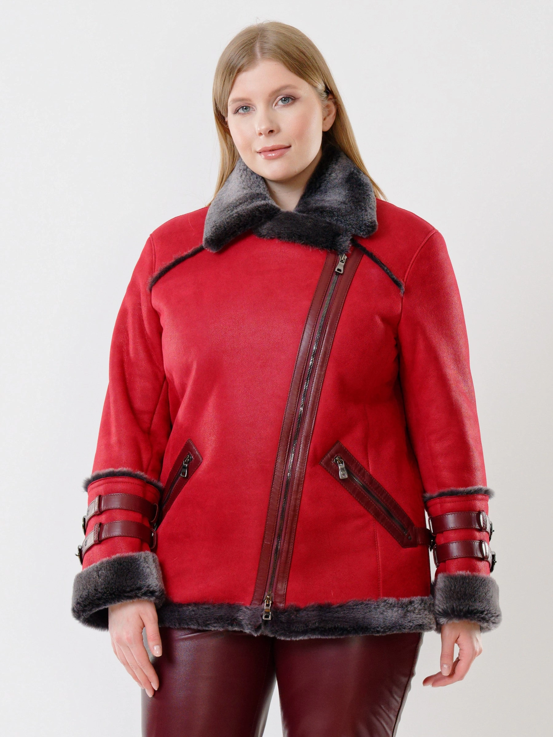 Яркая короткая женская куртка-косуха из натуральной овчины «мерино» сразу привлекает внимание! Прямой спортивный силуэт обеспечивает комфорт и свободу движений, а густой шелковистый мех надежно согревает. Застежка-молния, английский воротник с лацканами, регулируемые меховые манжеты и кожаные паты на рукавах и по бокам создают непокорный дух. Практичные карманы на молниях дополняют образ. Сочетайте её с черными кожаными штанами и футболкой или платьем-свитером для создания яркого повседневного образа.